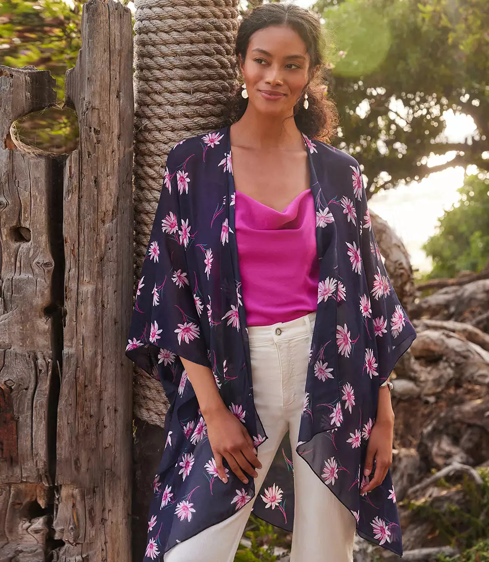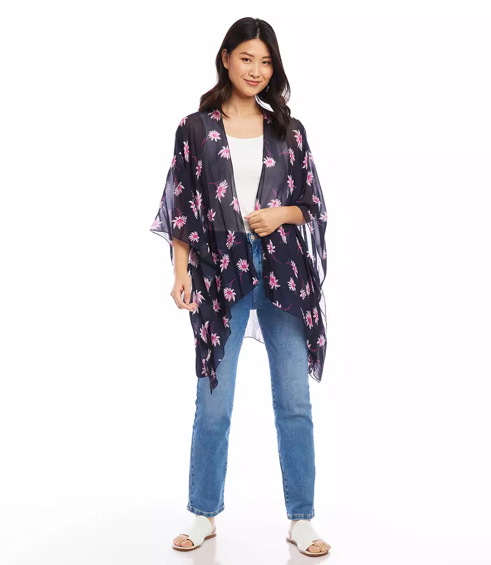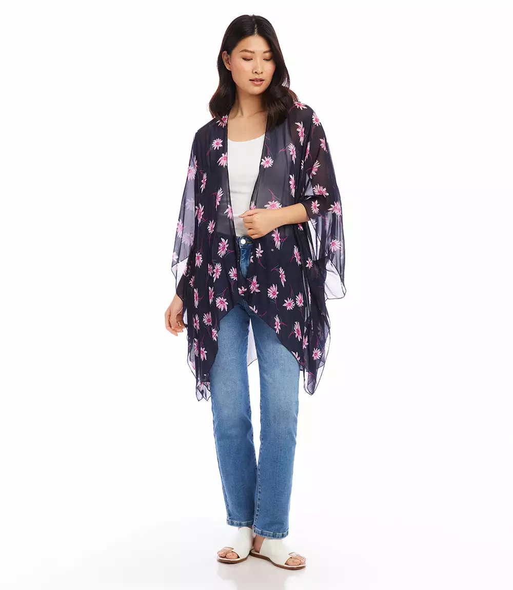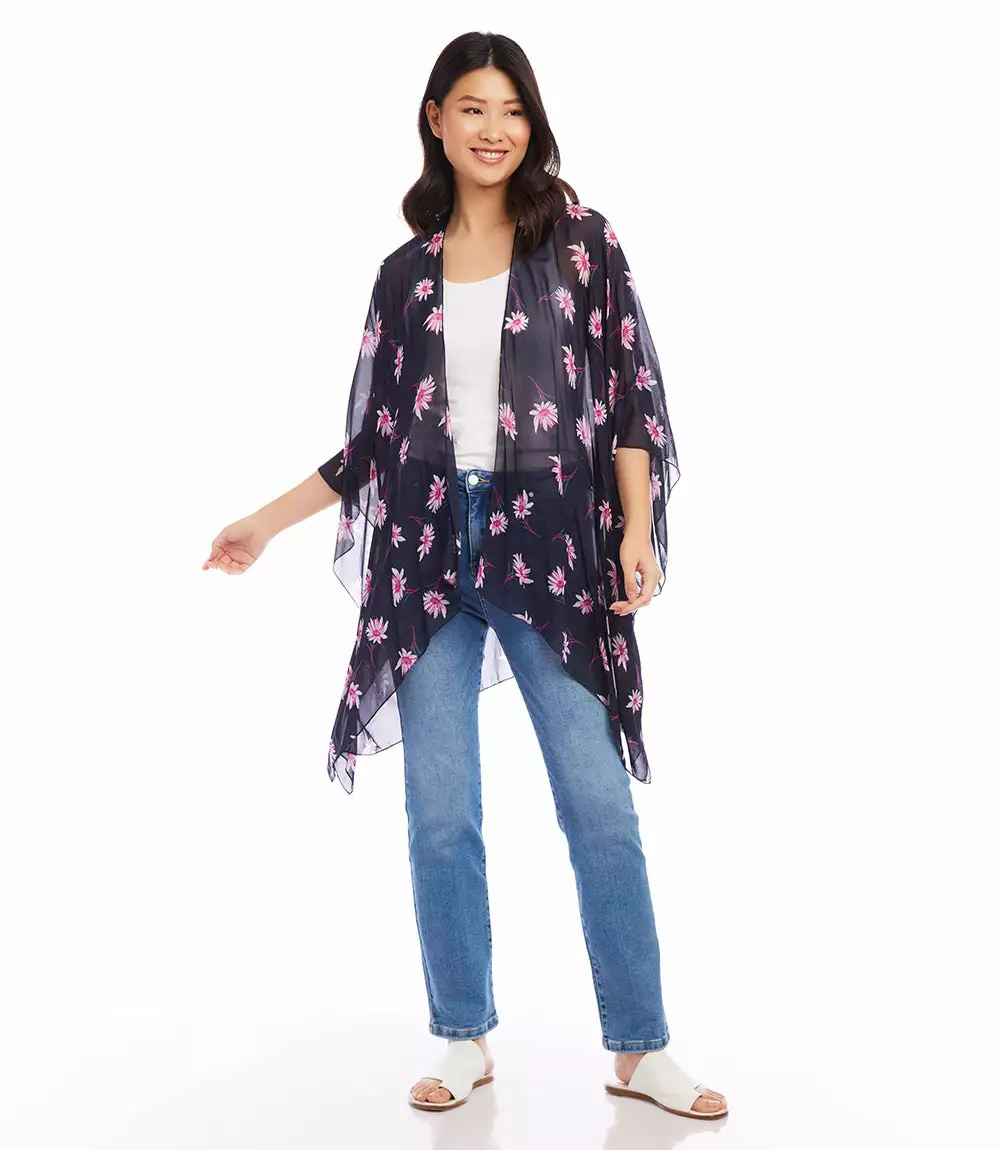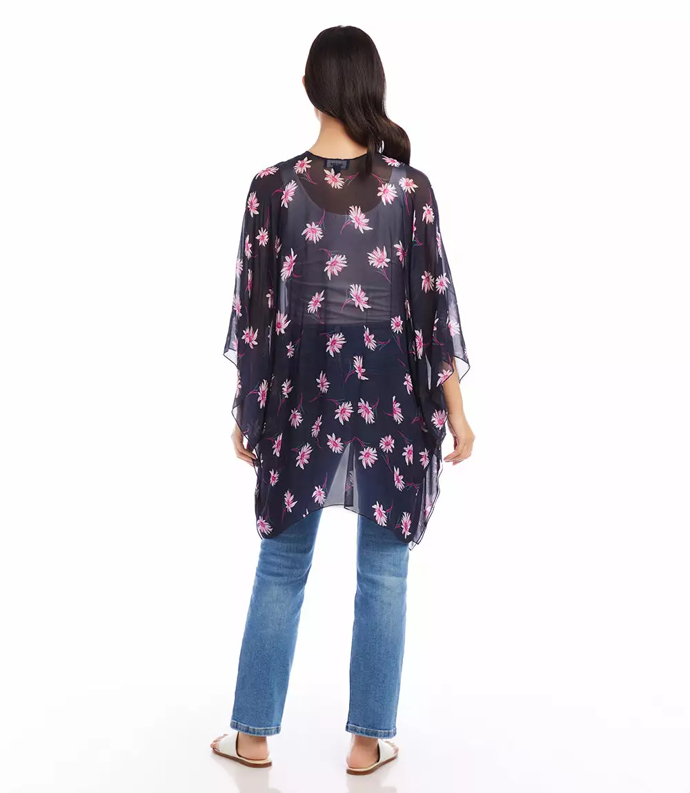 A sheer cover-up with a floating floral print. Pairs perfectly with a pair of denim or shorts.