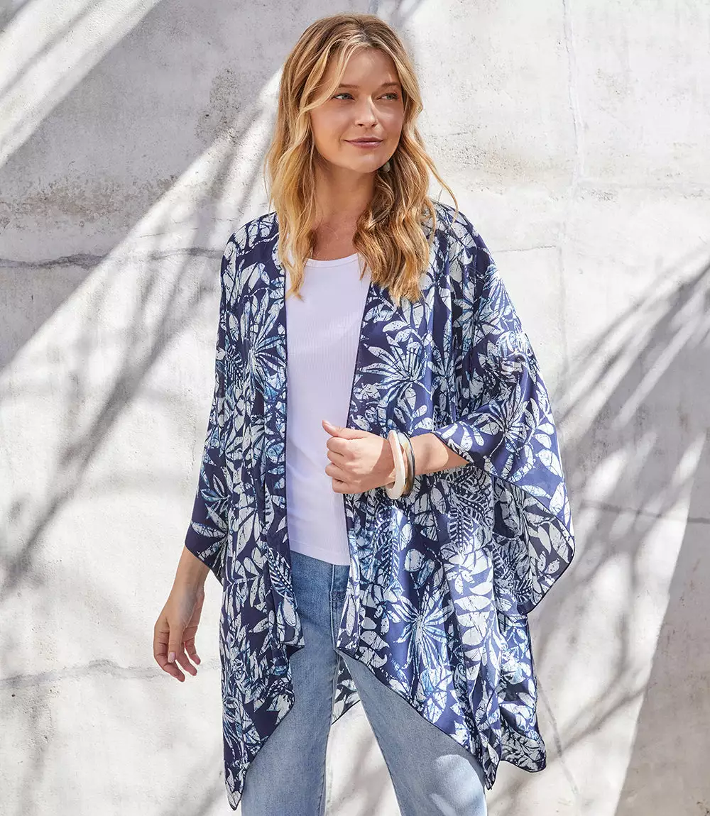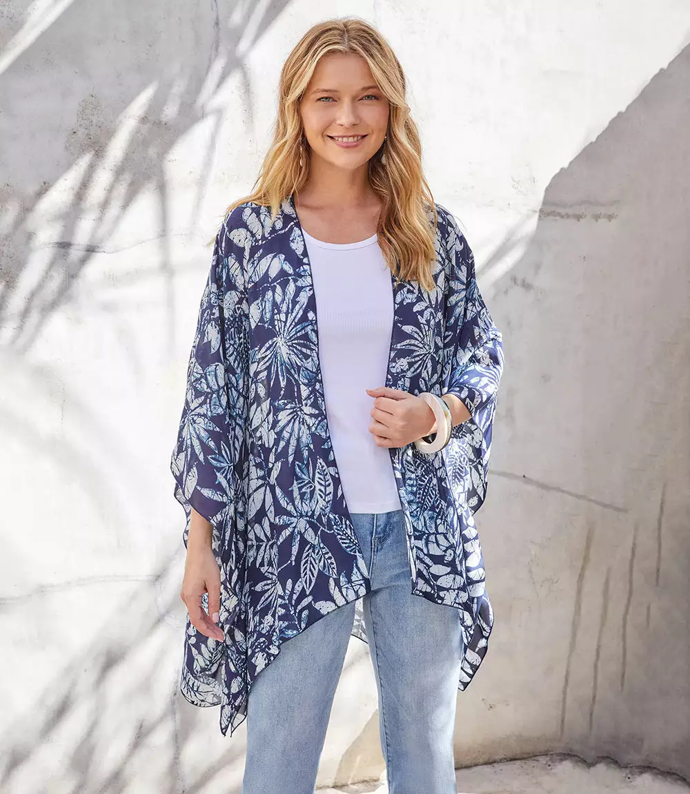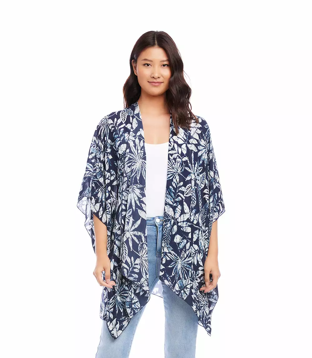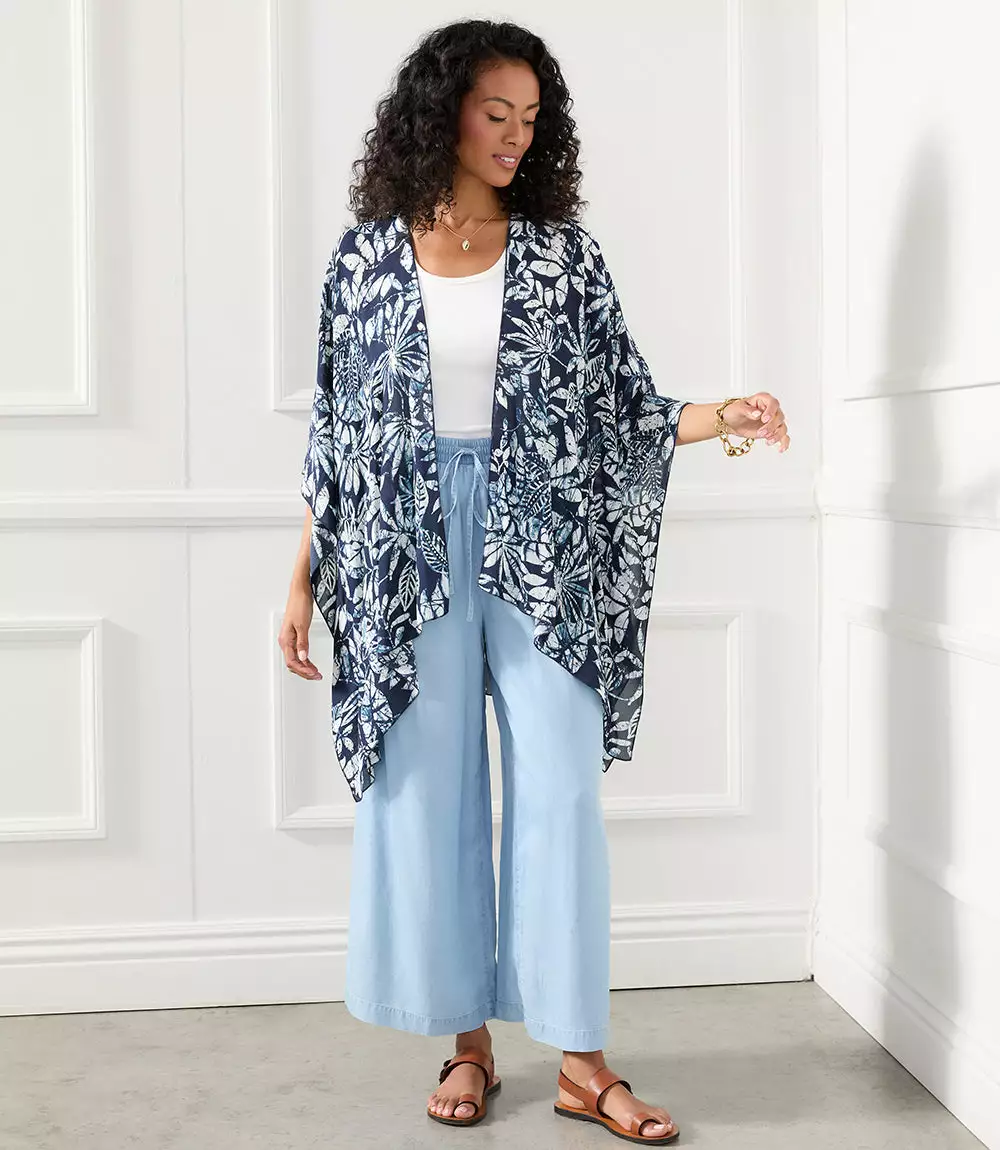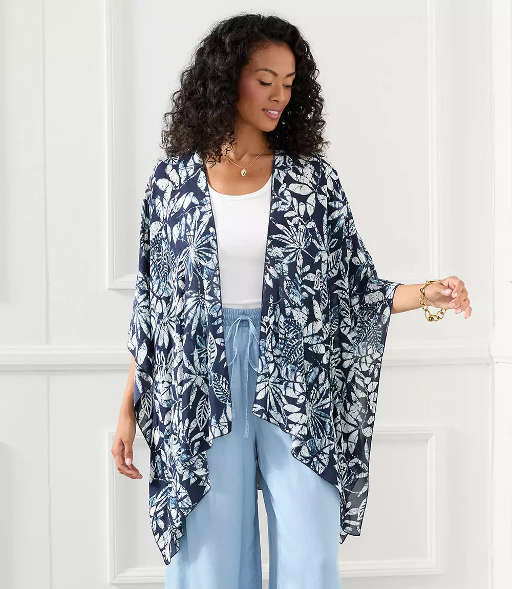 Designed to set a romantic tone, this lightweight kimono in a tropical floral print offers soft movement with its draped silhouette. Complete your layered look with this open front jacket for lightweight, stylish coverage.