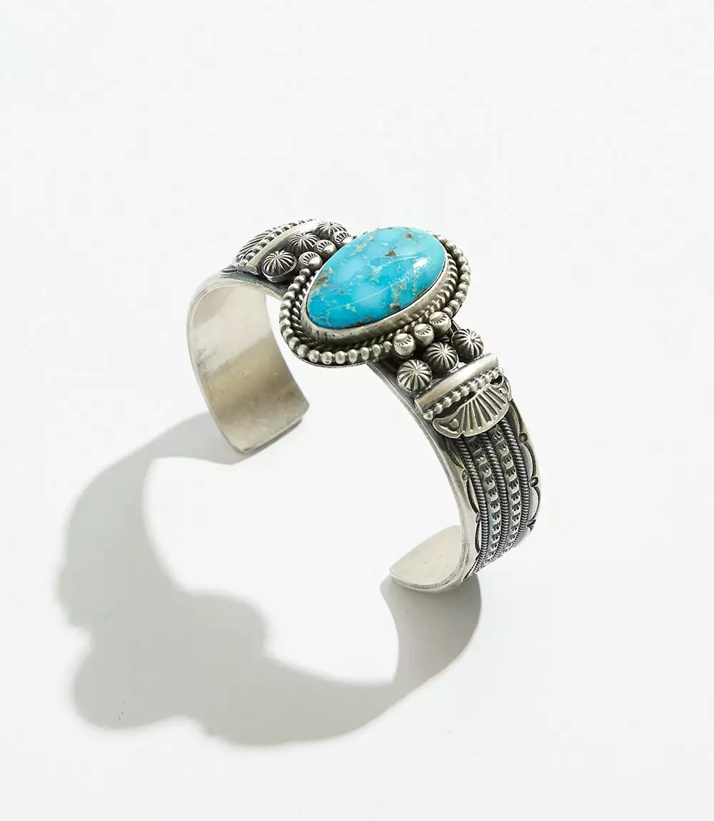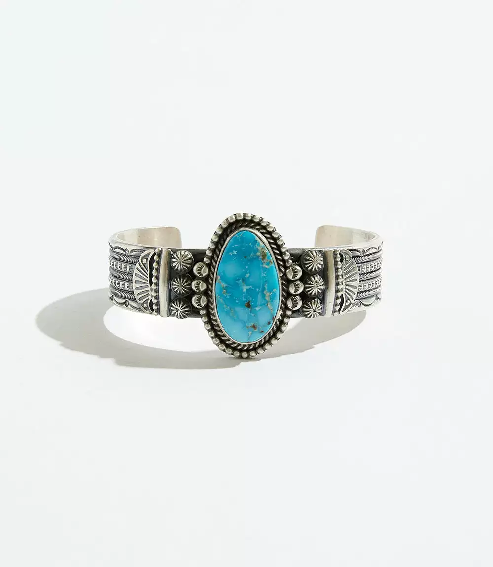 This sterling silver cuff was intricately hand-designed by a Native American artist. A stunning Kingman turquoise stone is encased by finely detailed silver stampwork and embellishment.Â