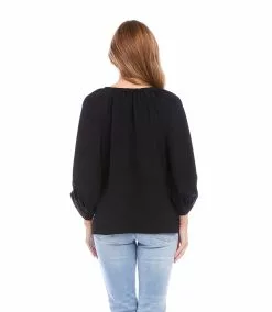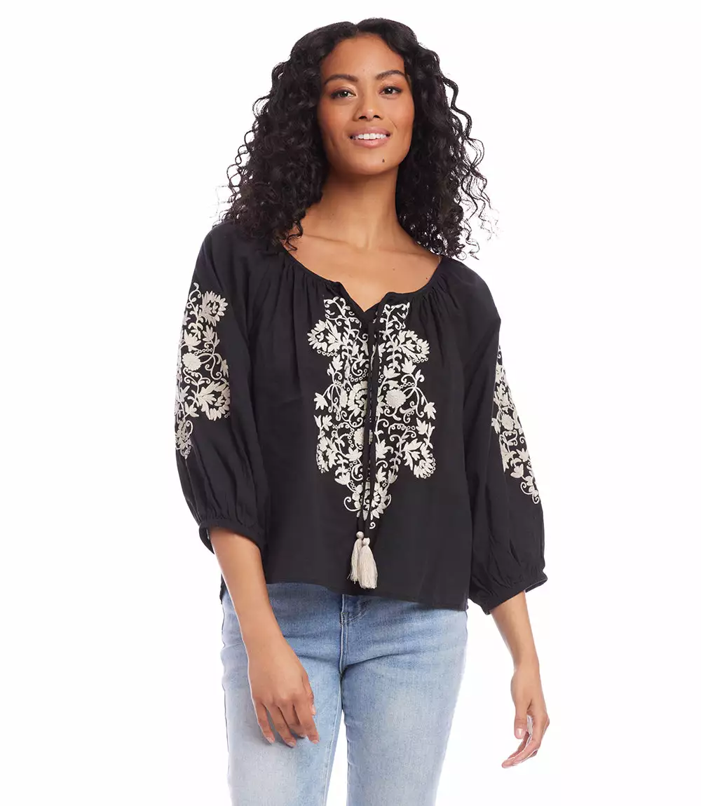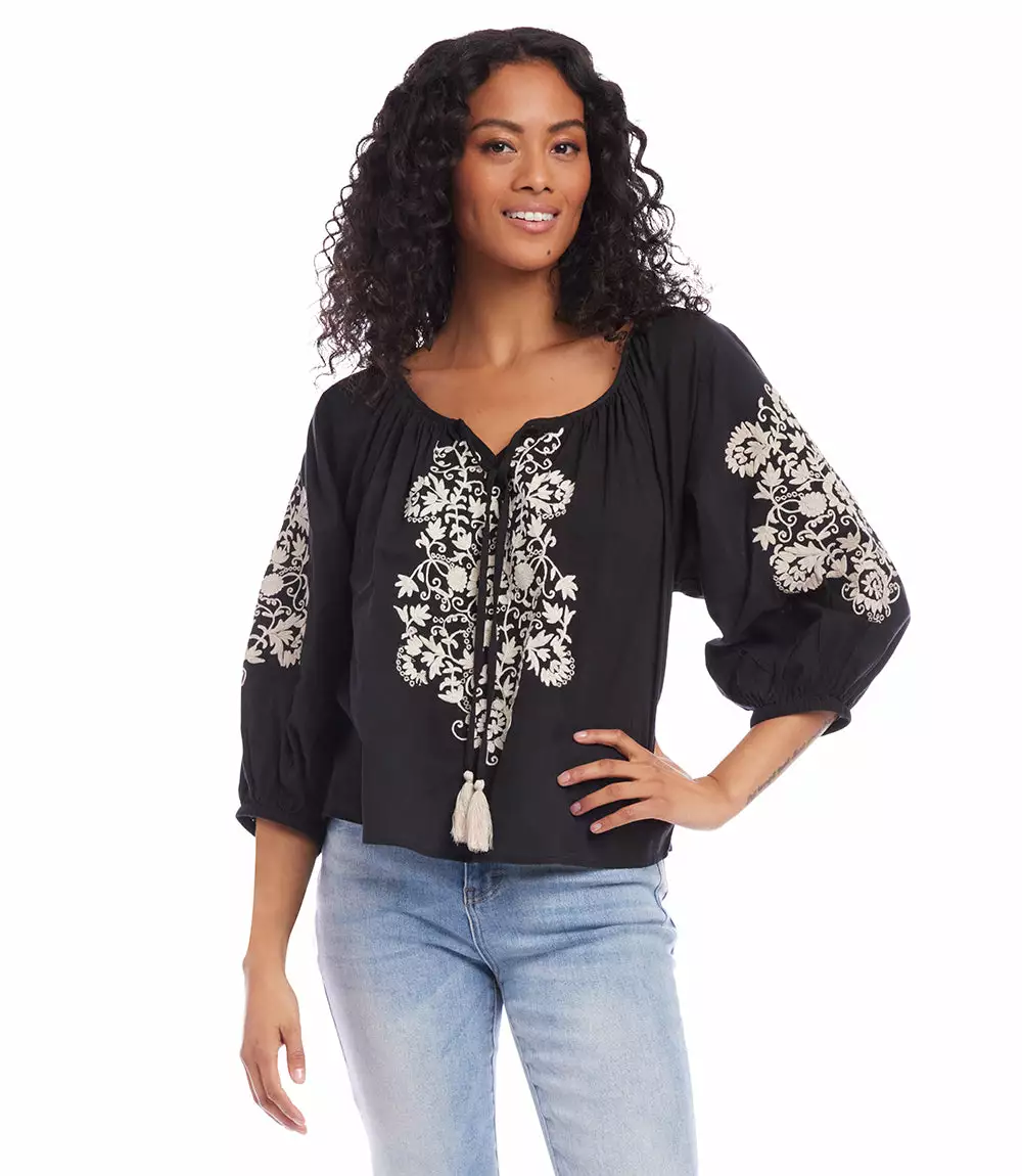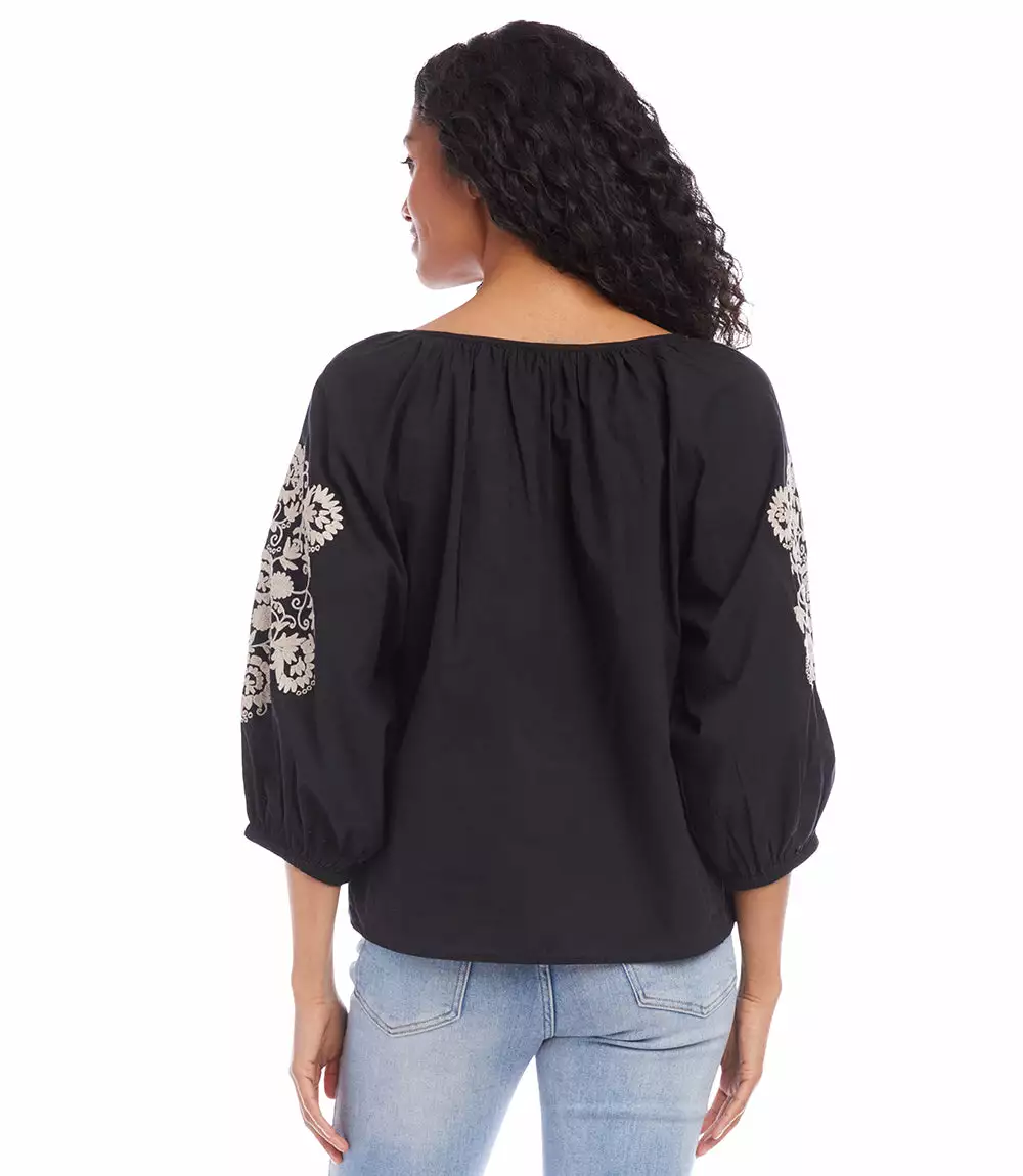 This striking blouse features contrast embroidery and dramatic blouson sleeves.