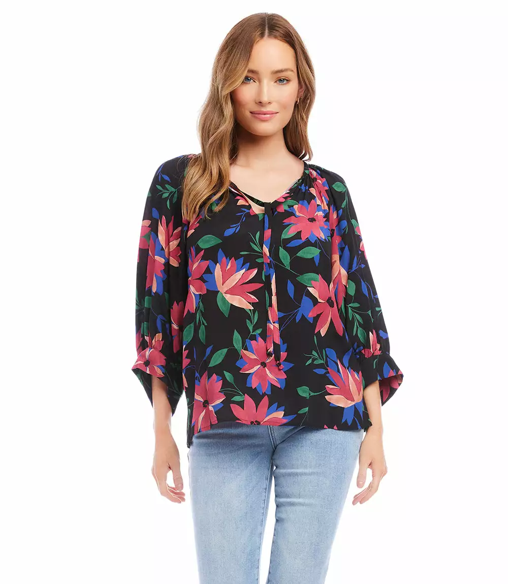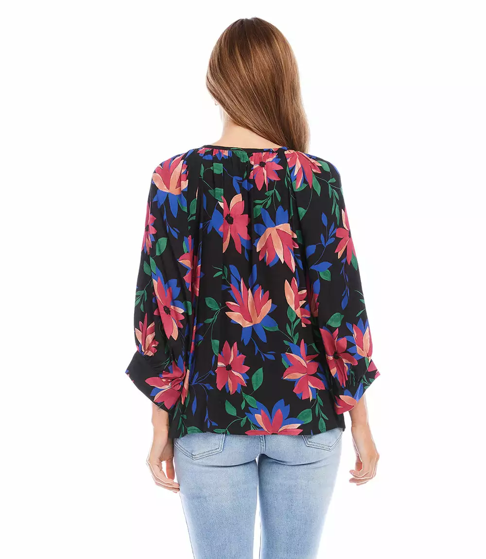 A vibrant floral print distinguishes this light-weight crepe top detailed with billowy blouson sleeves.