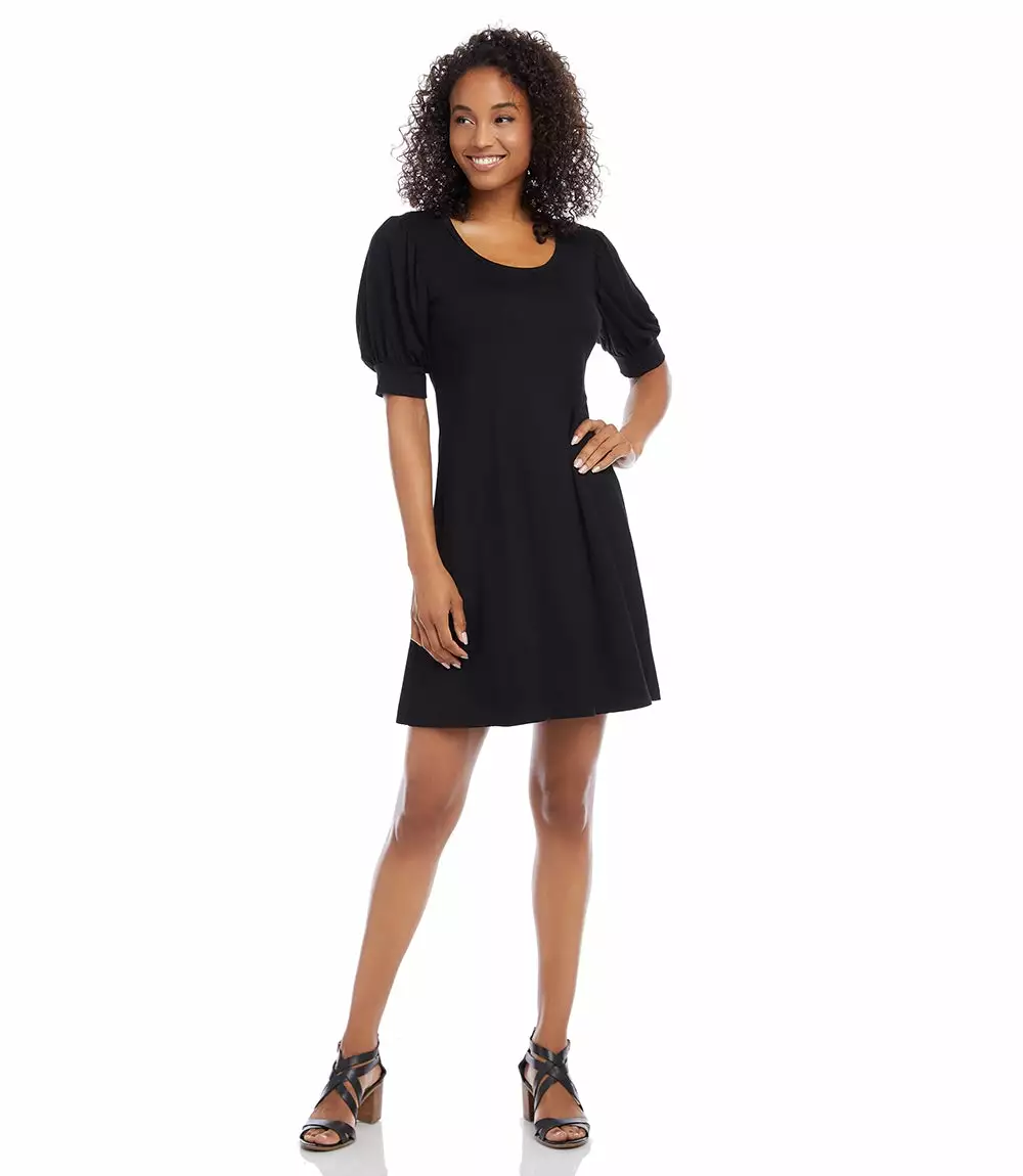 With statement-making puff sleeves, this swingy jersey knit dress offers easy elegance. This dress can easily transition from desk to dinner with a simple switch of shoes and accessories.