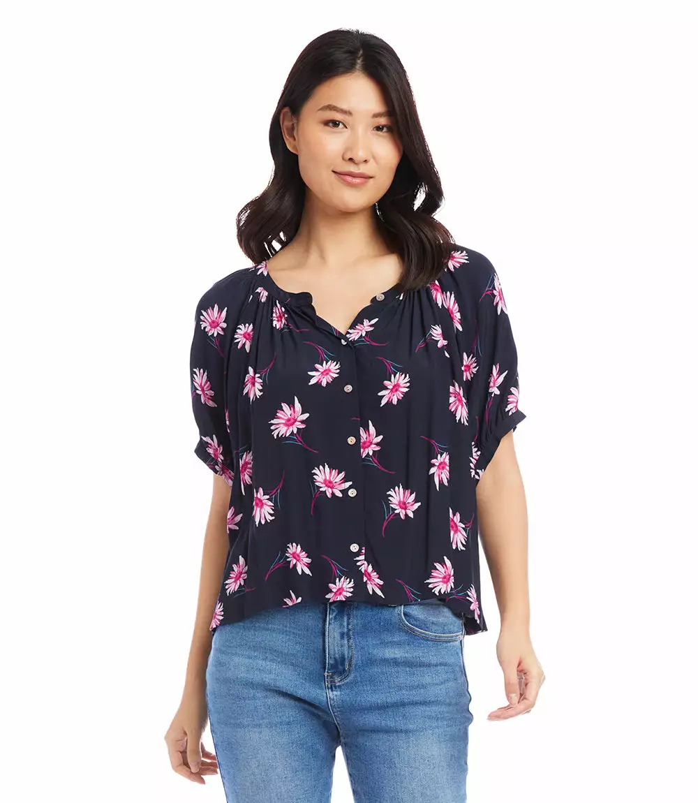 A collage of florals make a dynamic statement on this chic Bohemian top.