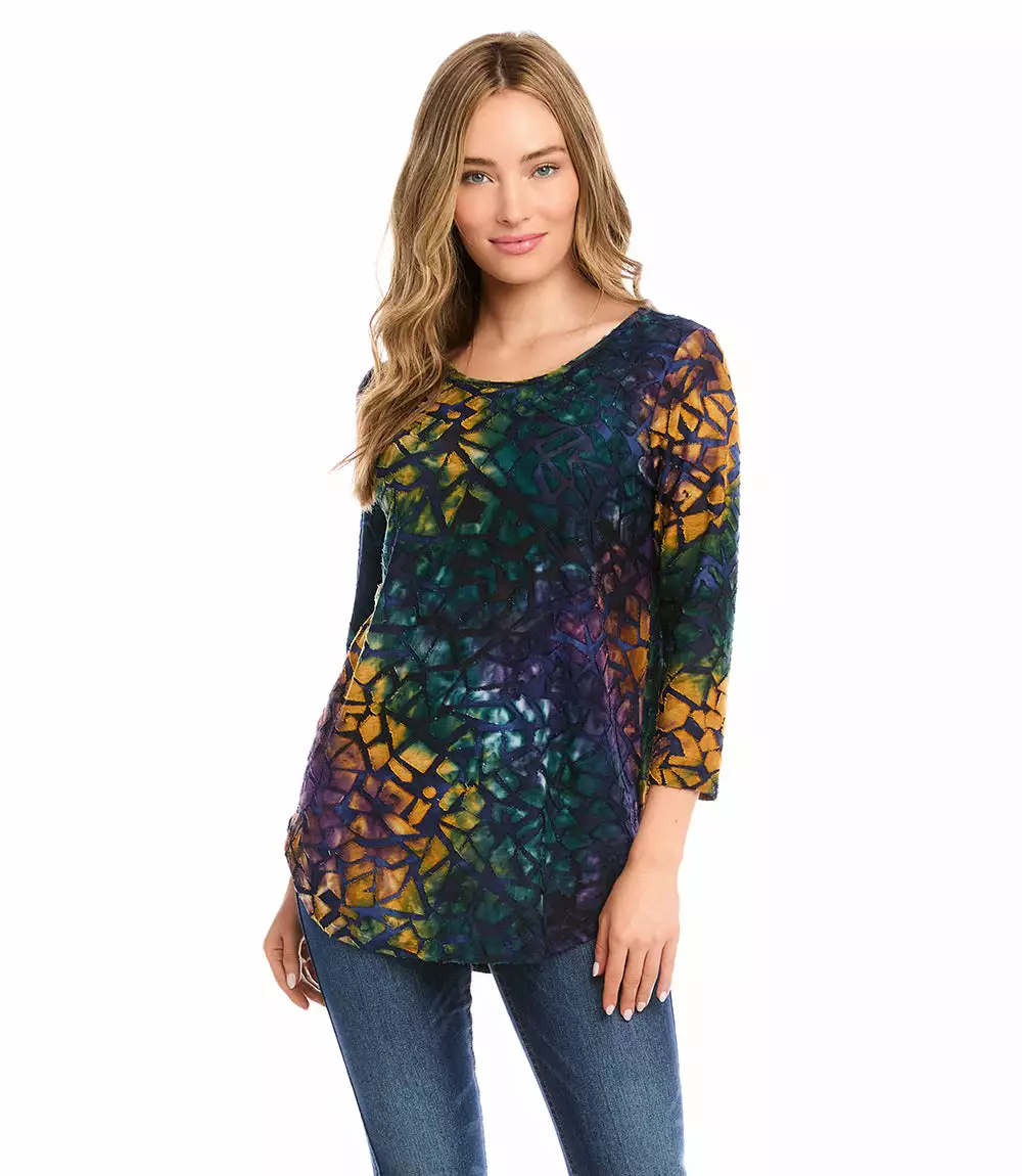 Textural beauty is found in this jacquard top covered in an alluring geometric tie-dye design. It pairs perfectly with your favorite denim.