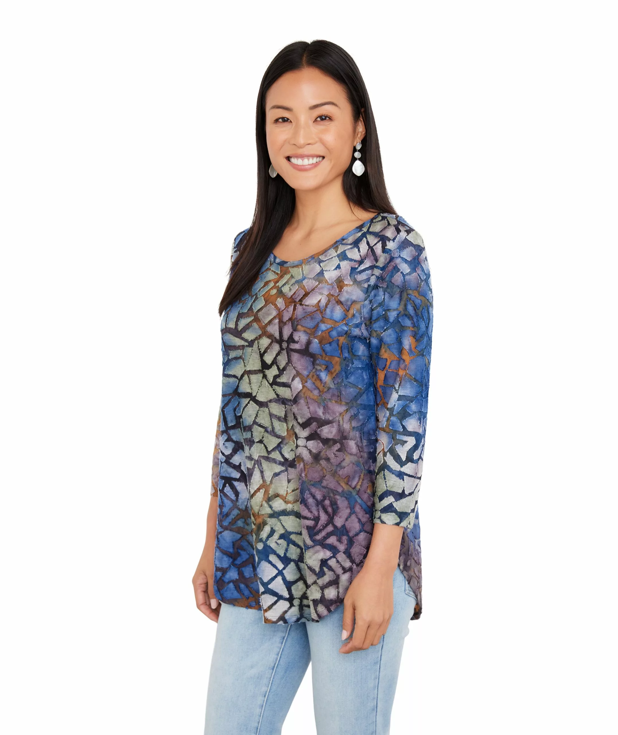 Textural beauty is found in this jacquard top covered in an alluring tie-dye design. It pairs perfectly with your favorite denim.