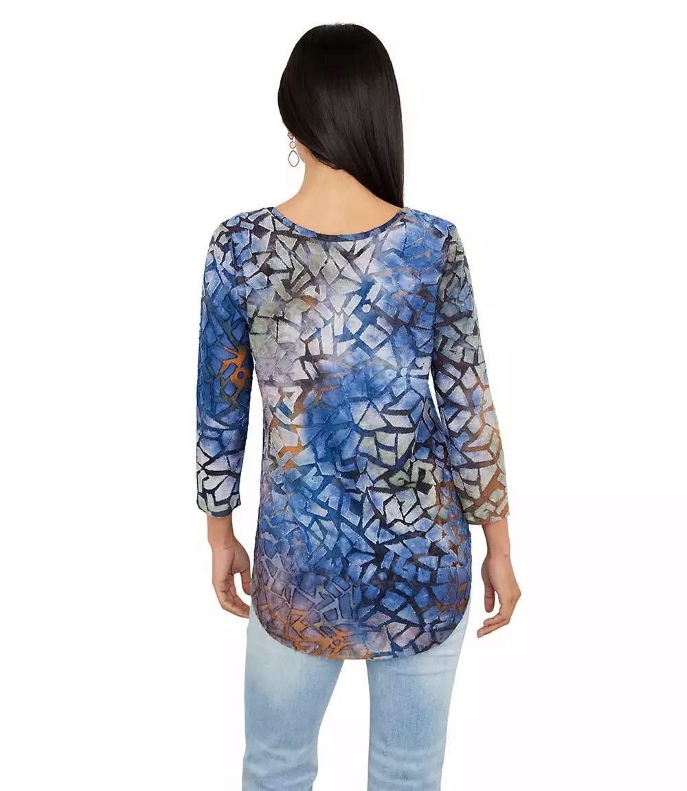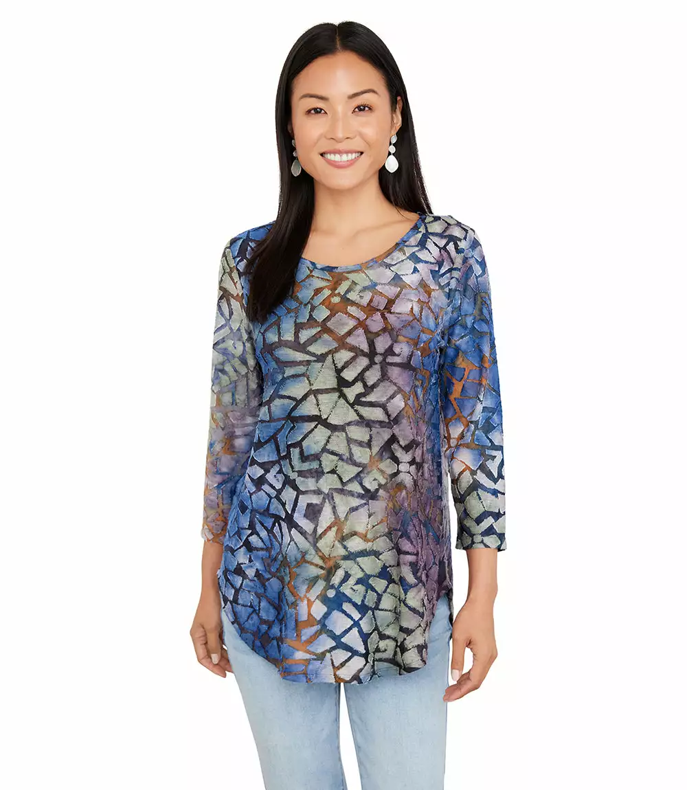 Textural beauty is found in this jacquard top covered in an alluring tie-dye design. It pairs perfectly with your favorite denim.