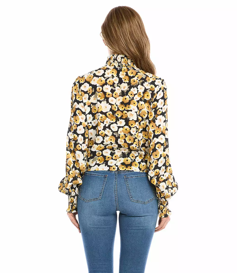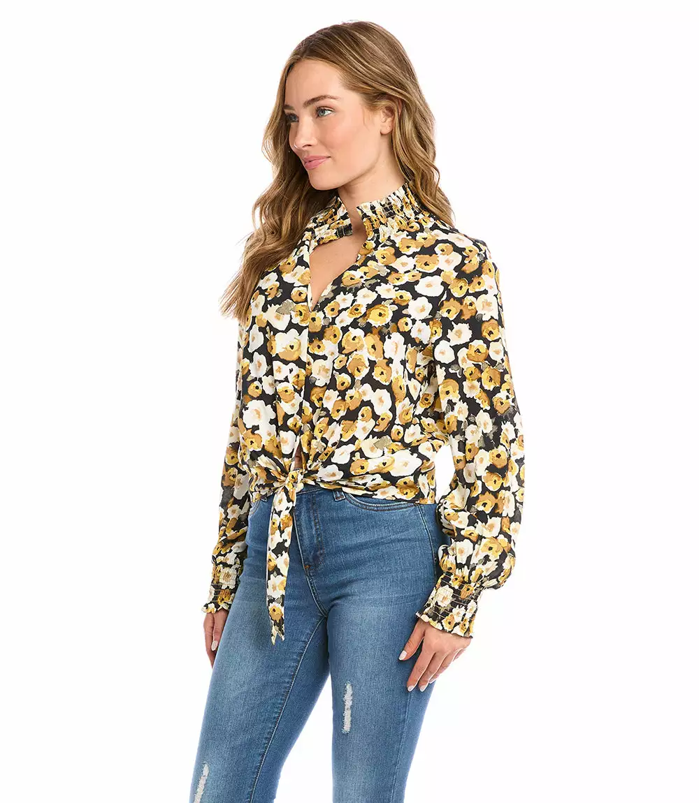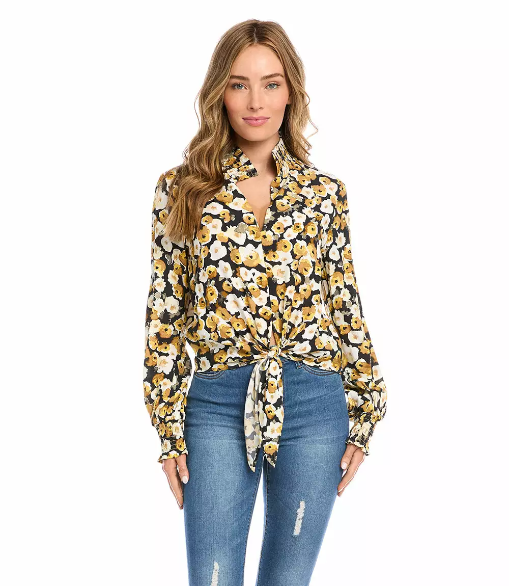 Add a dash of old-world romance to your wardrobe with smocked sleeves and collar. It’s finished with a stylish tie-front.
