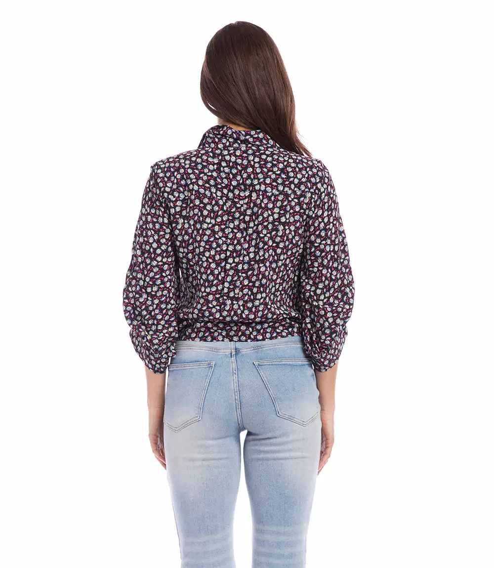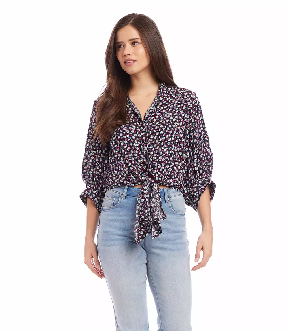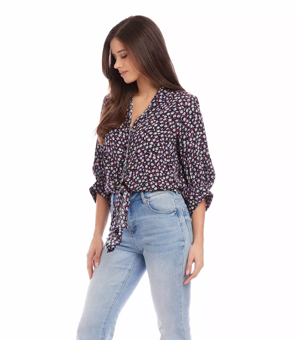 With a polished collar, tie at the waist, and a charming floral top this top is sure to make a strong impression. This top pairs perfectly with high-waisted pants.