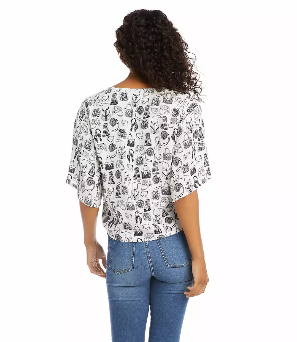 Whimsically illustrated scarves and handbags decorate this stylish tie-front blouse. This top can easily transition from desk to dinner with a simple switch of shoes and accessories.