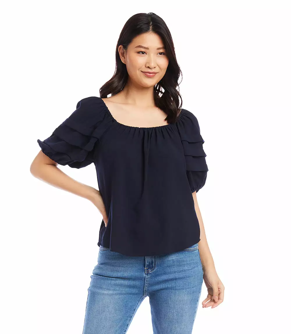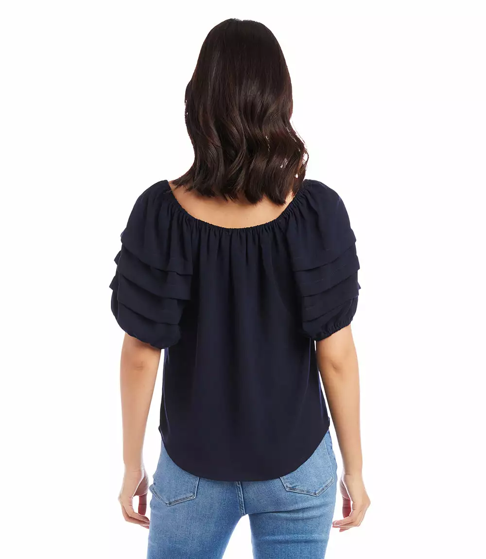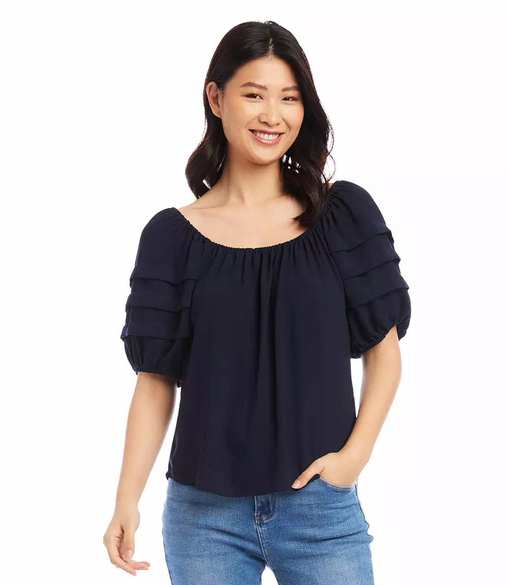 With pleated tiers along the sleeves and a shirred neckline, this peasant top offers an effortlessly feminine look.