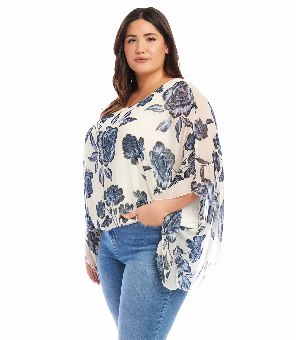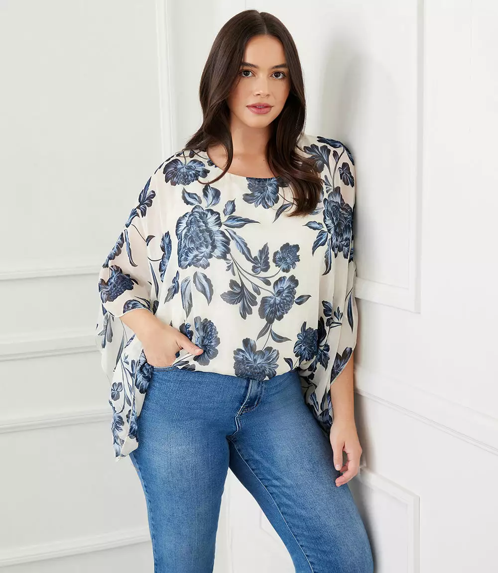 This effortless floral print top features a flattering silhouette with an elastic bottom and built in jersey knit lining.