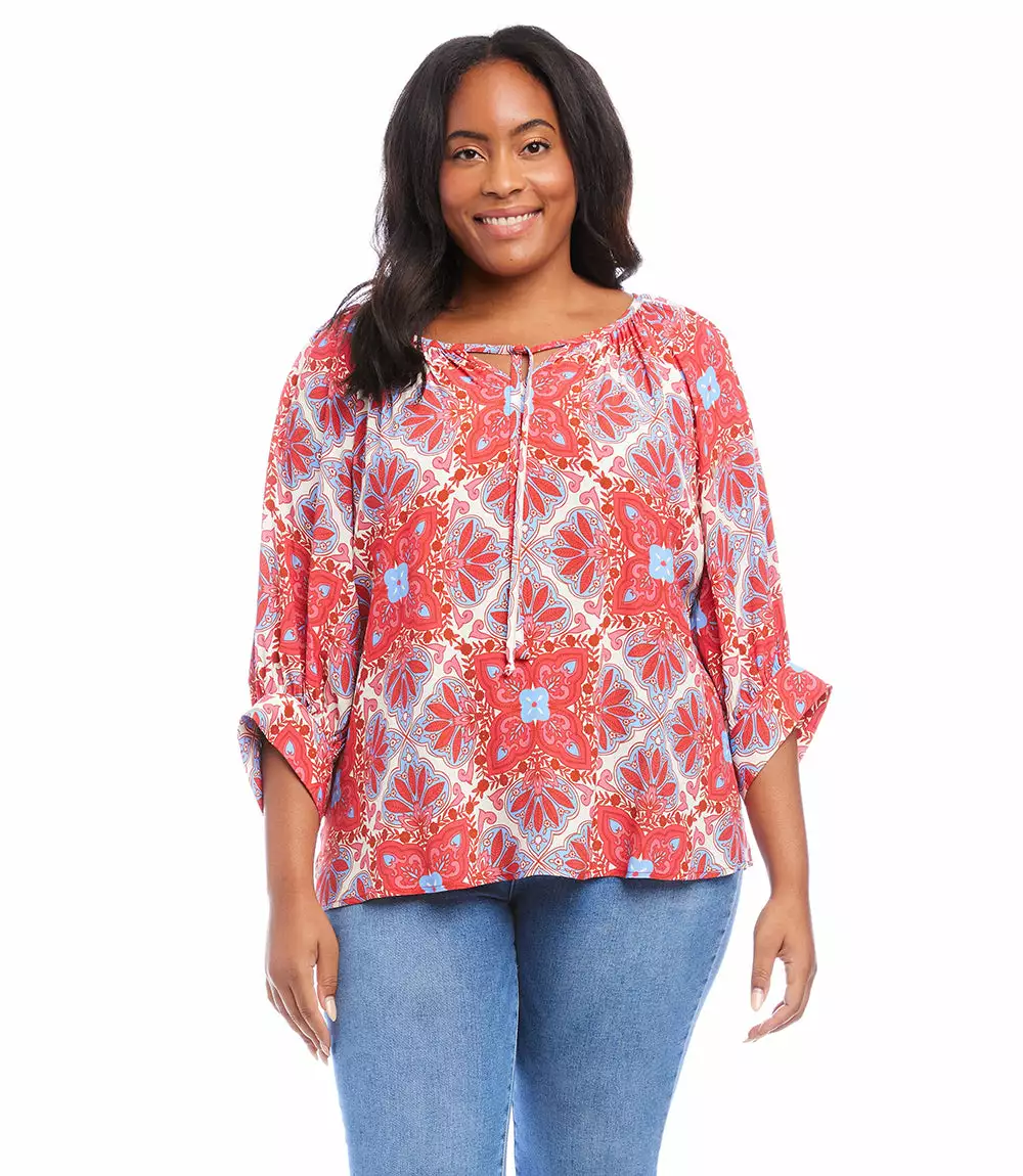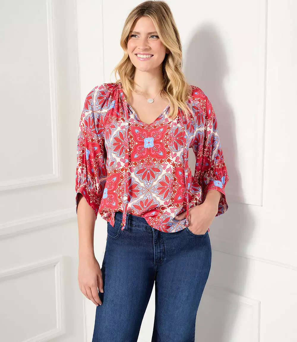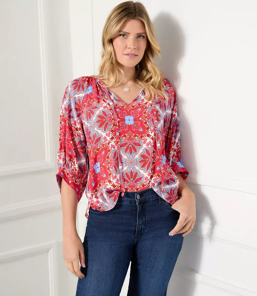 A beautiful Mediterranean-inspired medallion print defines this billow peasant top finished with blouson sleeves.