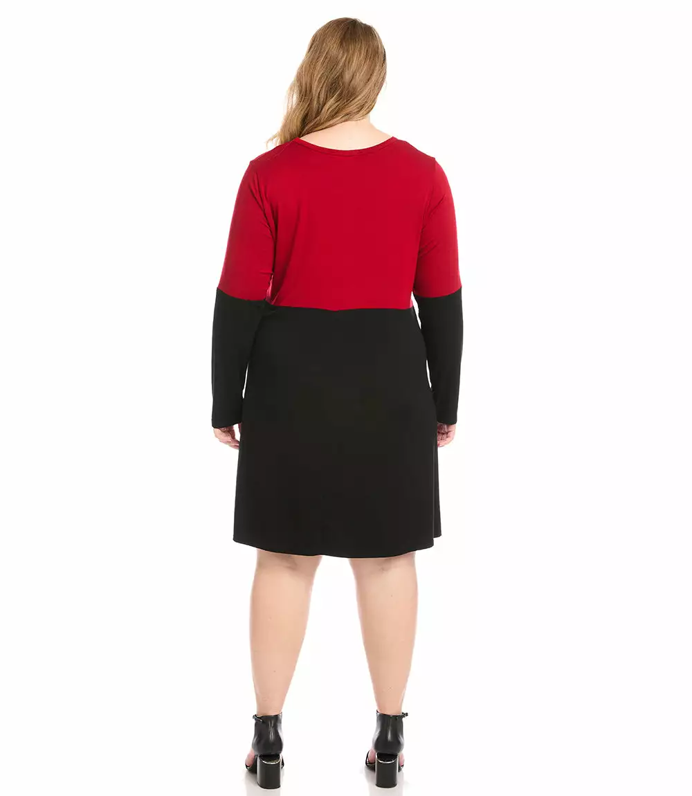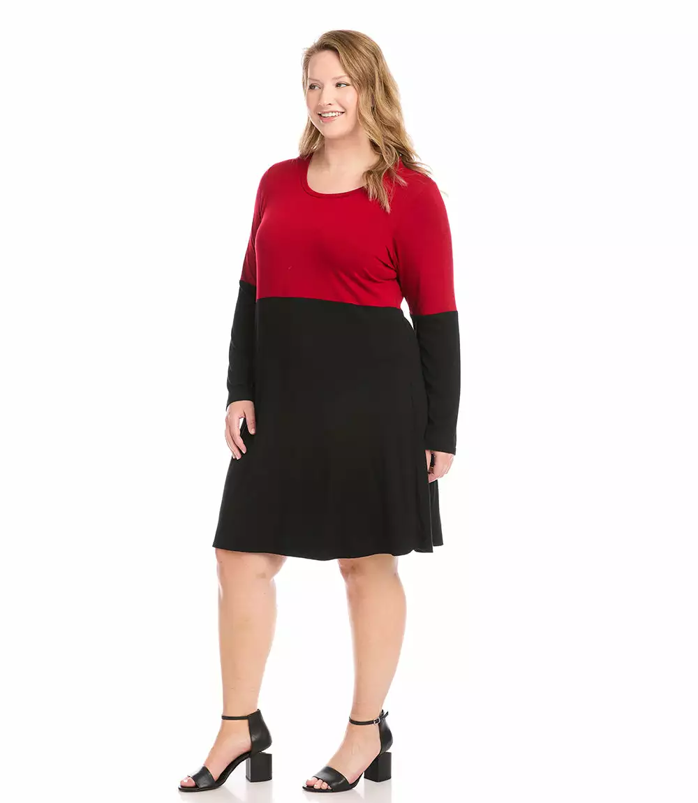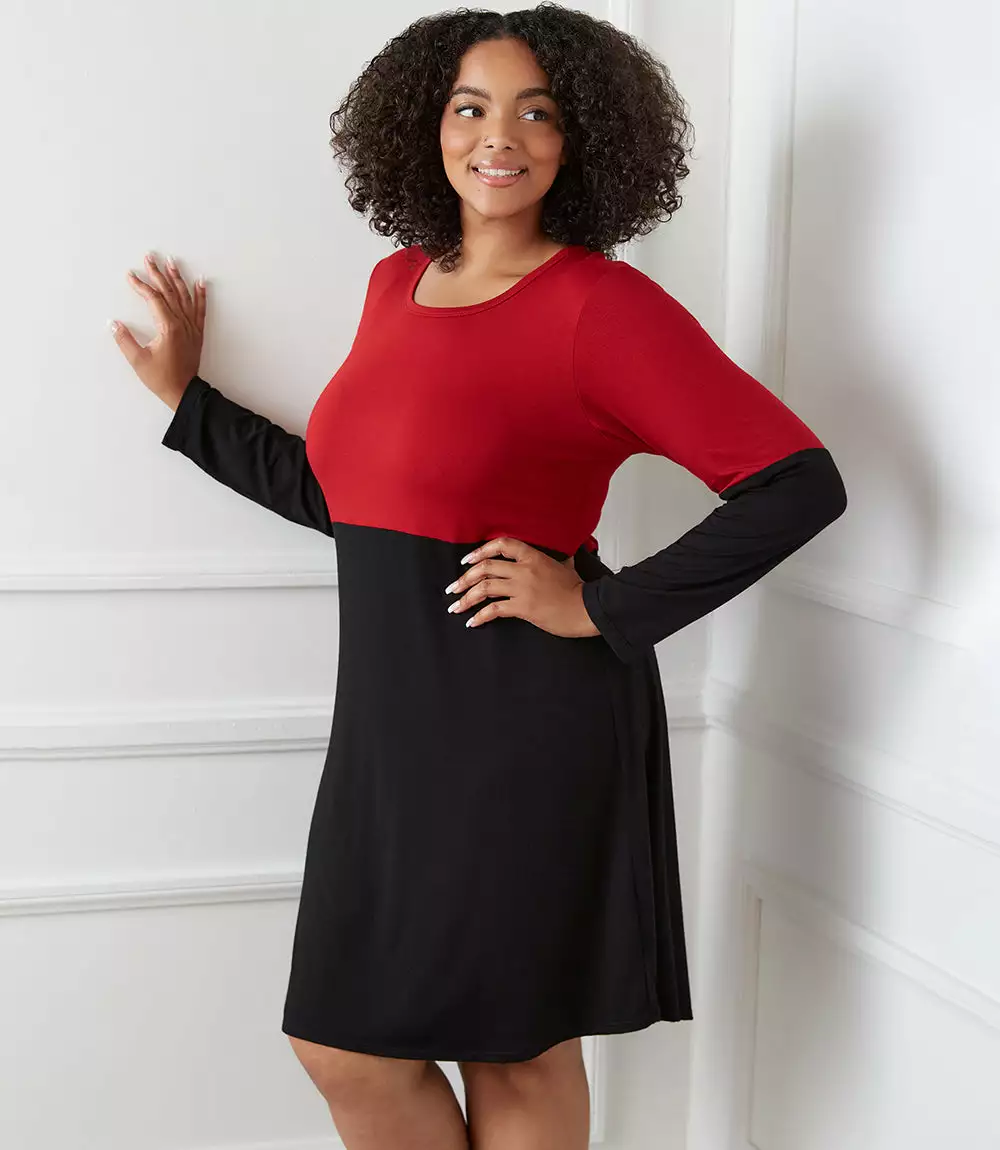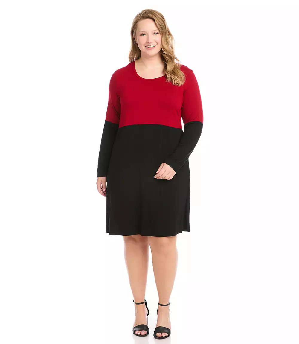 A great piece for transitioning into cooler temperatures, on trend color blocked long sleeves and a figure-flattering a-line silhouette. Fashioned in soft and cozy jersey, this dress is timeless and makes for a sophisticated office to evening look.