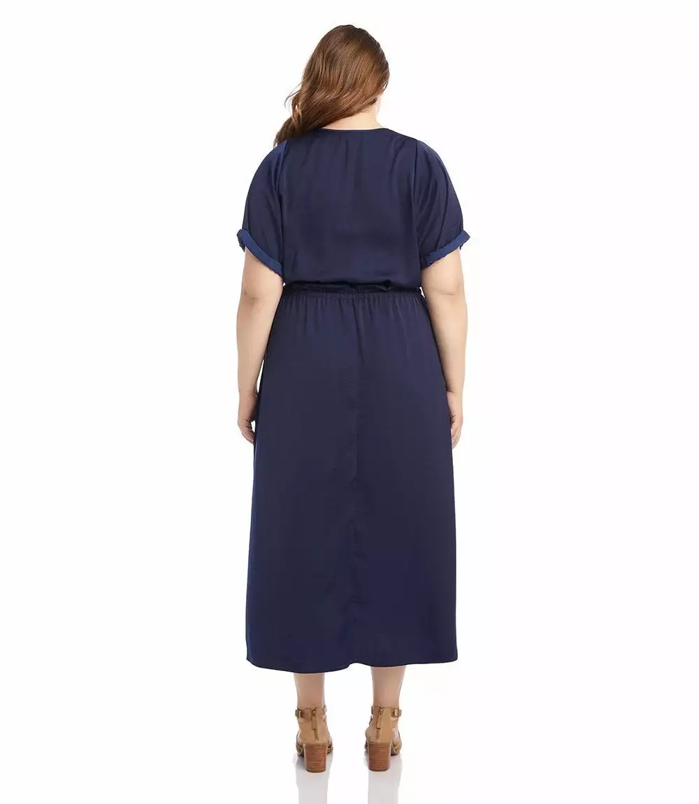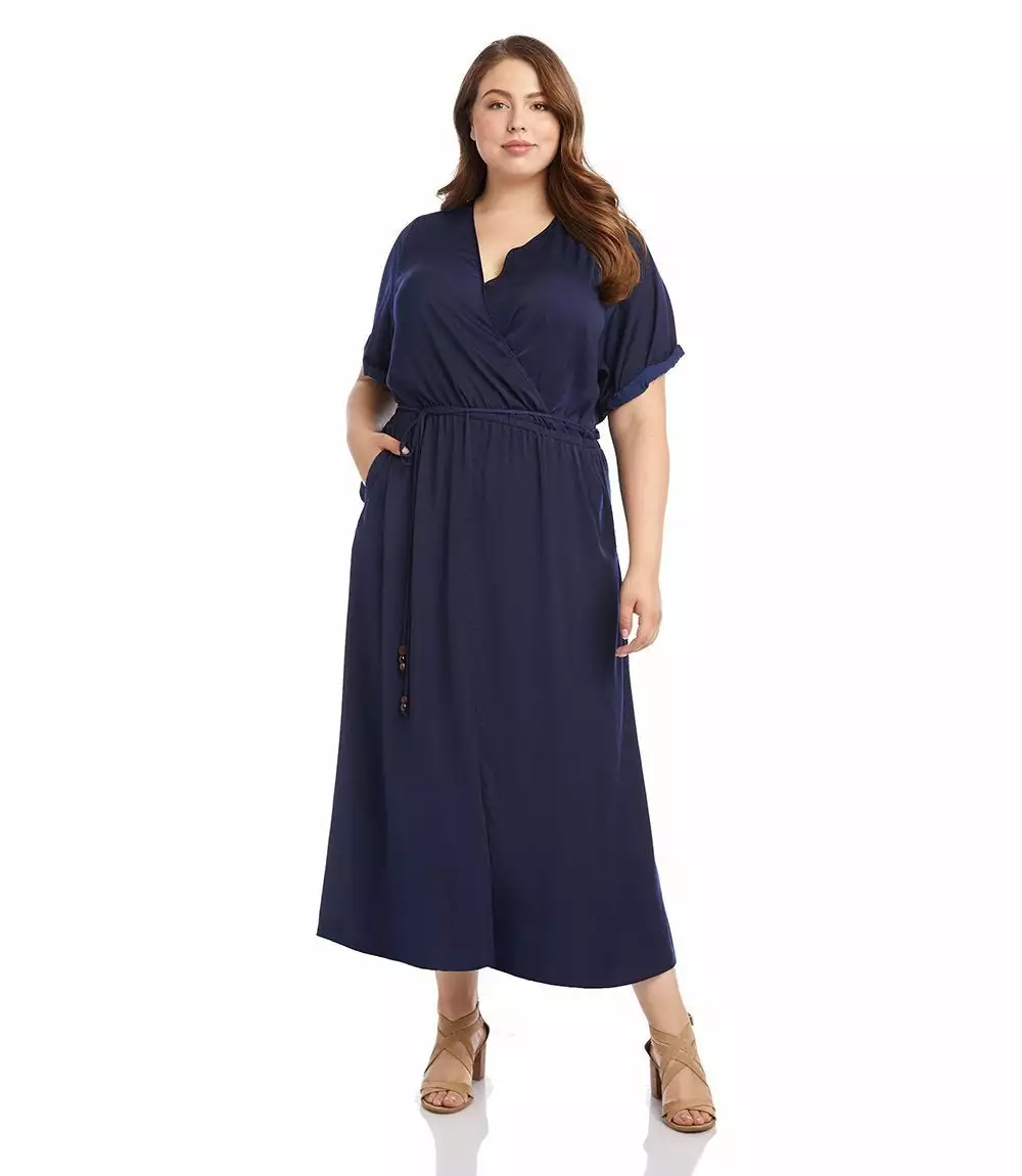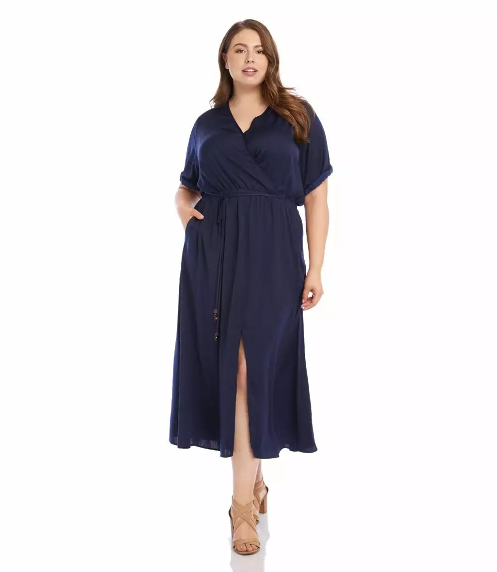 Indulgently smooth, this breezy dress features extended roll sleeves and a front-slit hem. Cinched at the waist for a uniquely tailored look. Belted tie includes wood and resin tiger’s eye beads.