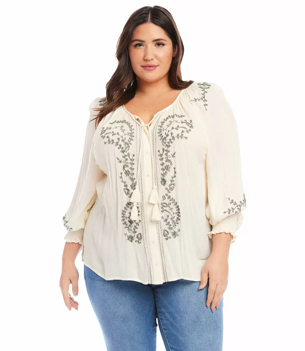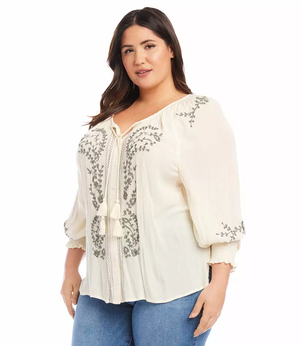 In our lightweight rayon, this new top features intricate embroidery and a relaxed fit. Smockled cuffs complete the chic Bohemian look. Tuck it into high-rise jeans or shorts and finish the look with sandals for effortless ease.