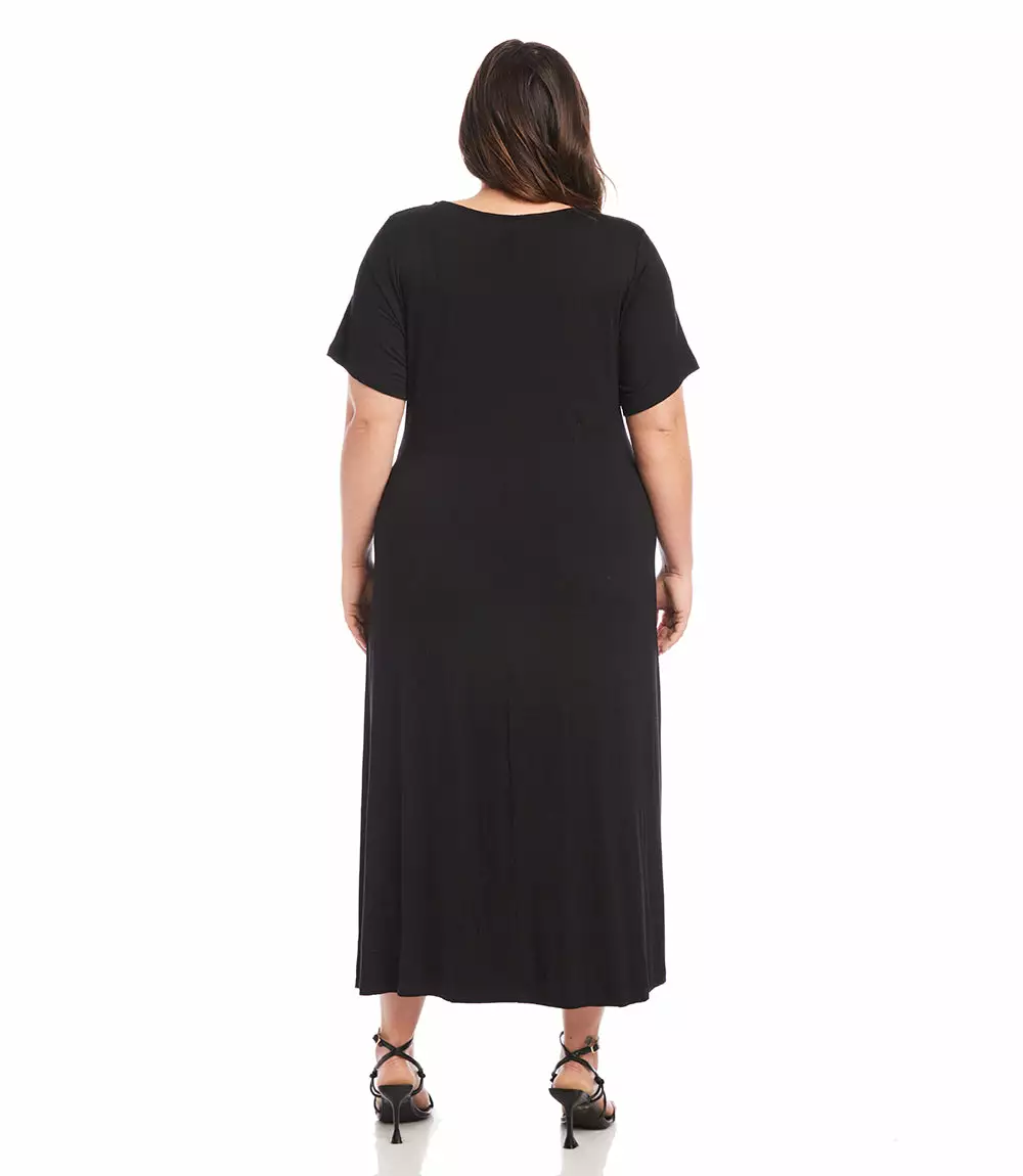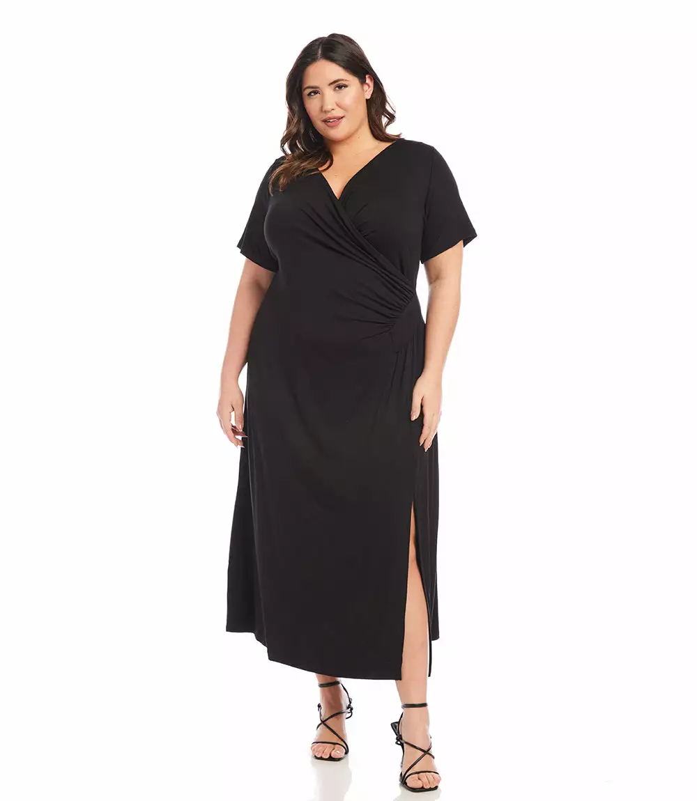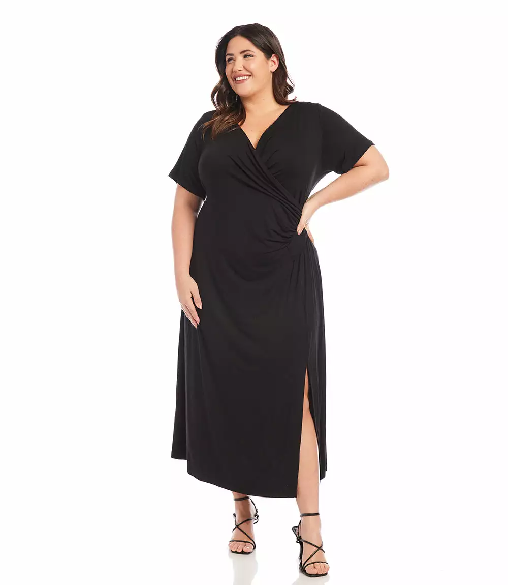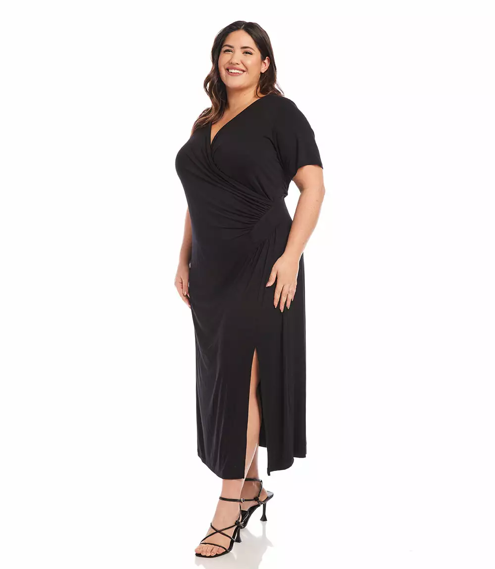 Elegant and alluring, this evening-ready midi dress is cut from fluid jersey-knit fabric and detailed with graceful draping. It’s finished with a stylish side-slit.
