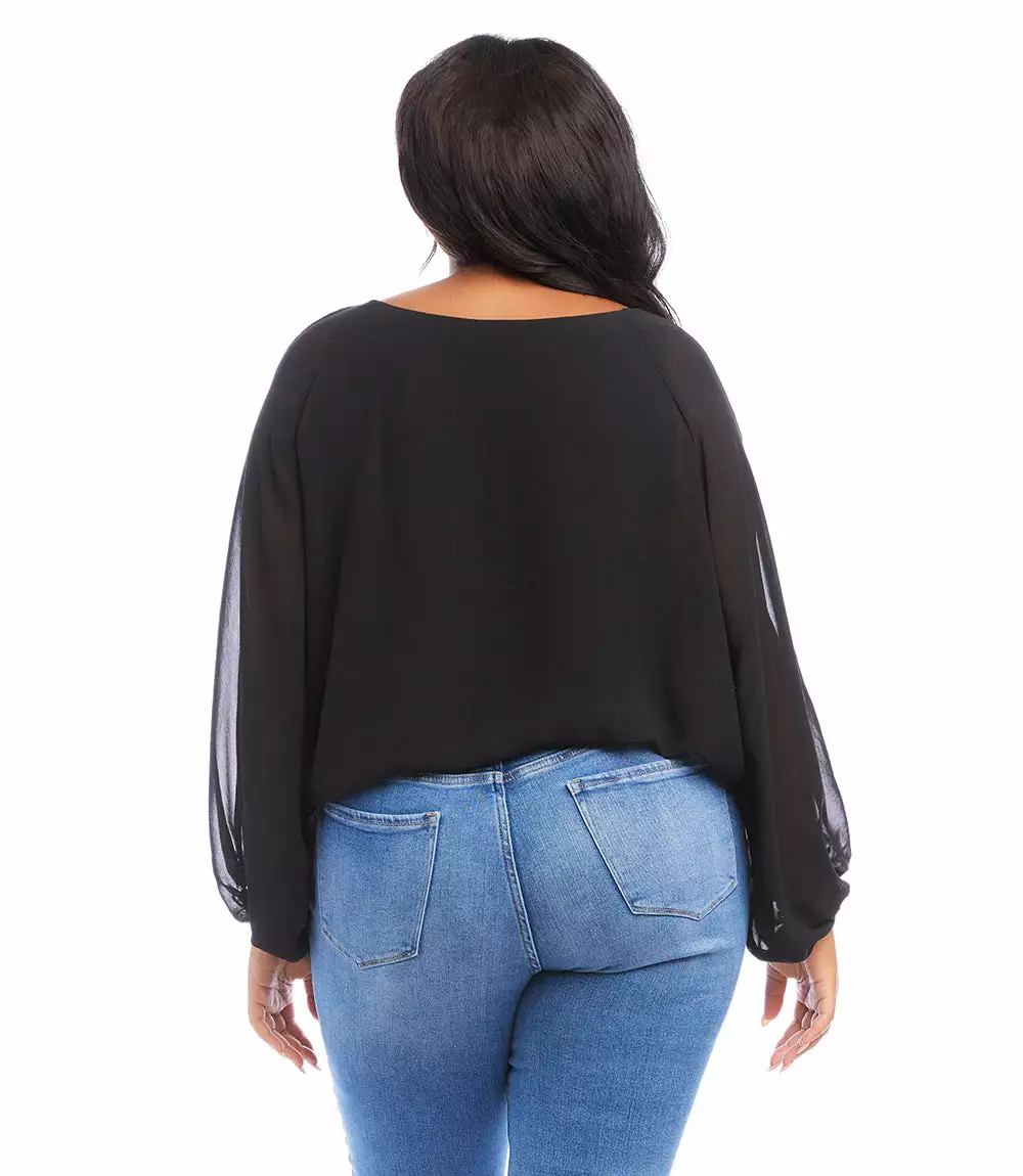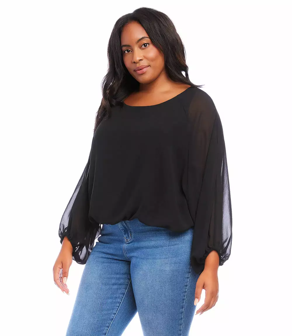 A sheer overlay adds soft movement to this billowy top detailed with romantic sheer sleeves. This generously size top is lined with stretchy jersey knit.