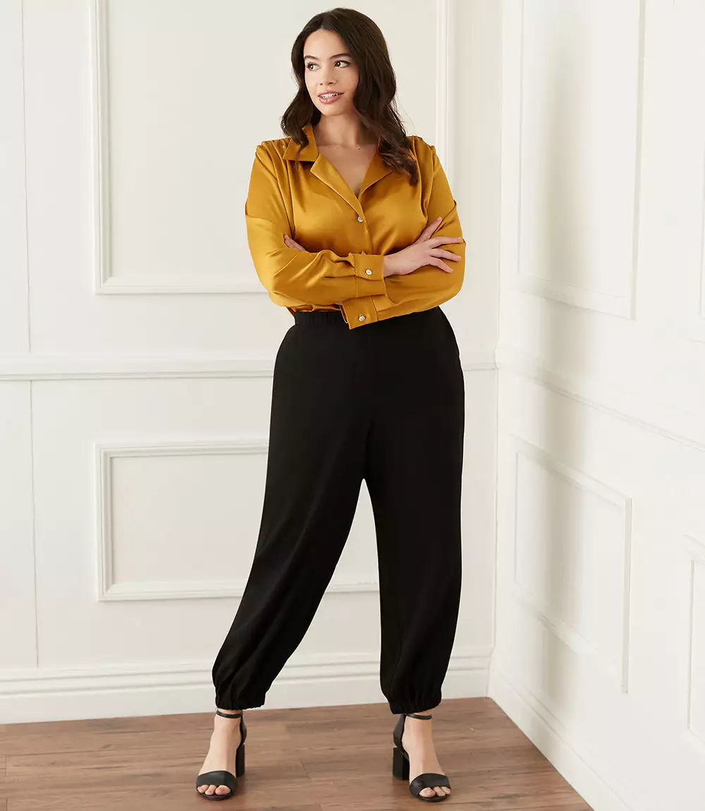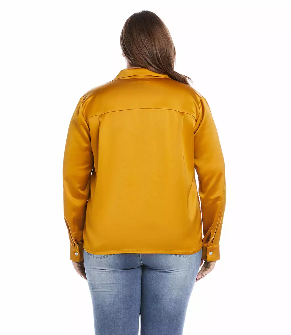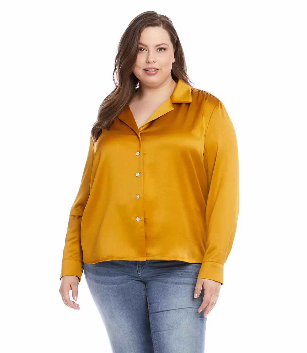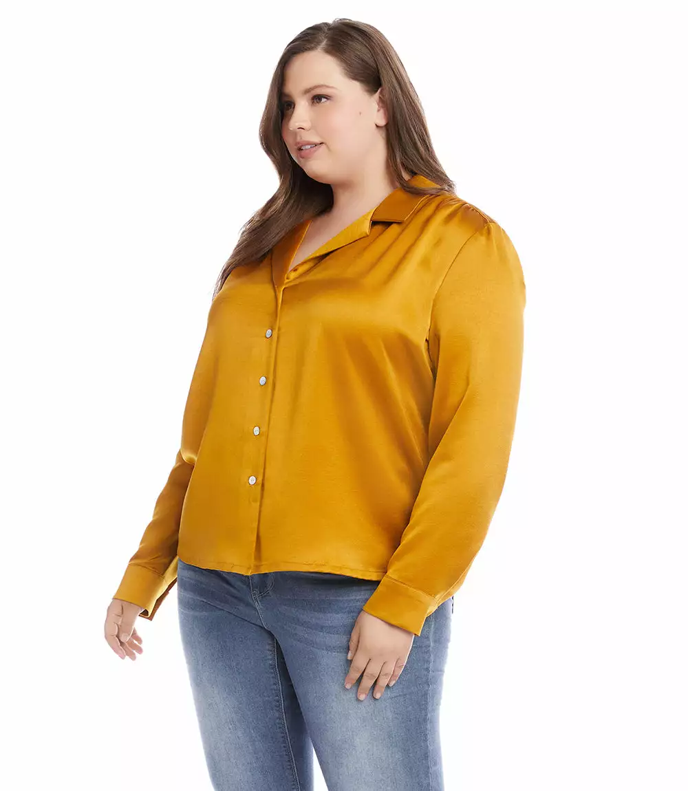 Cut from luxurious heavy satin, this top is detailed with a polished notched collar and cuffed sleeves. The perfect layering piece – soft, shimmering, and easy to dress up or down.