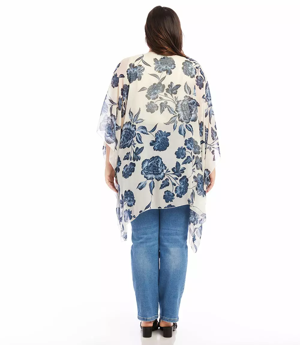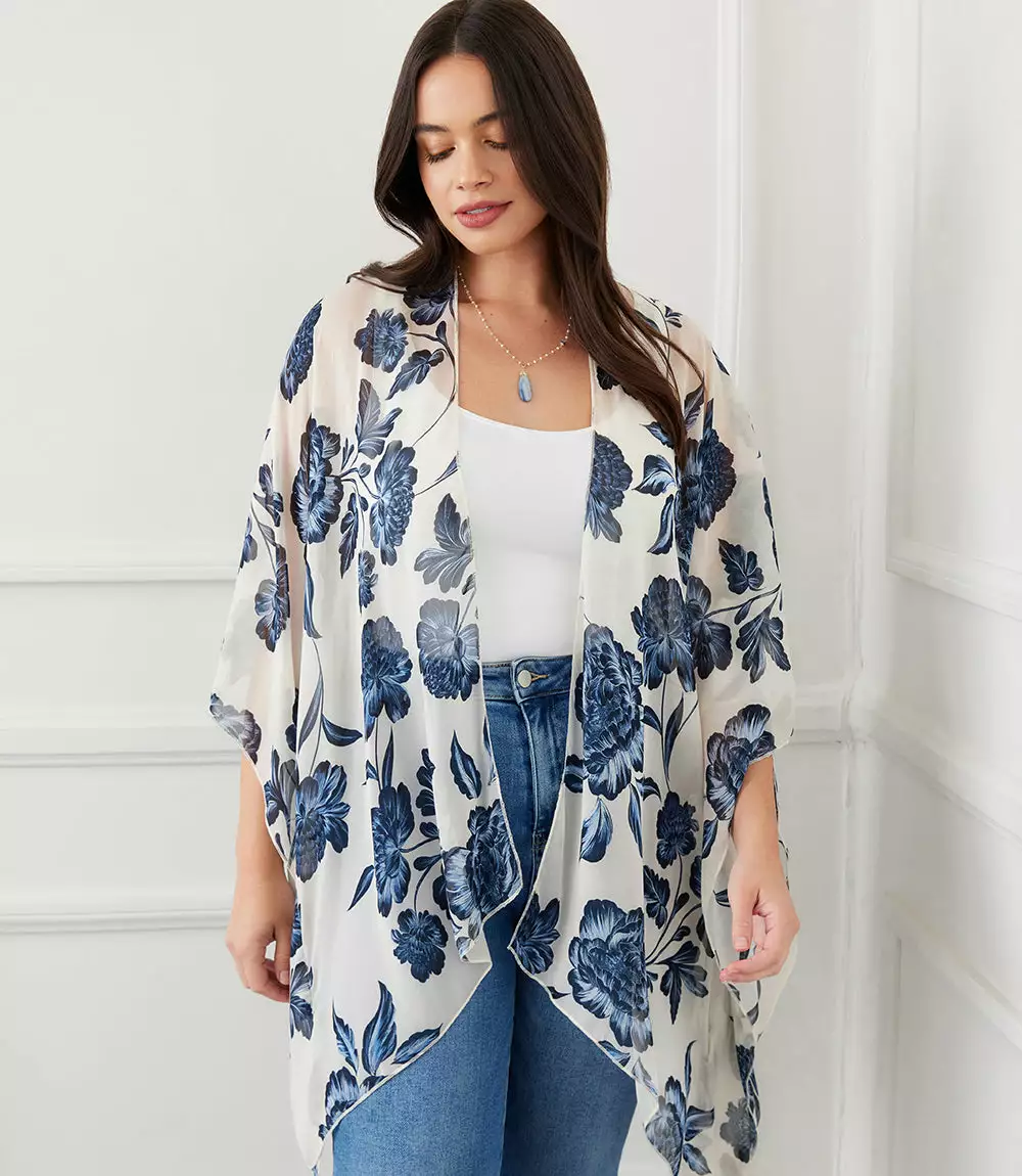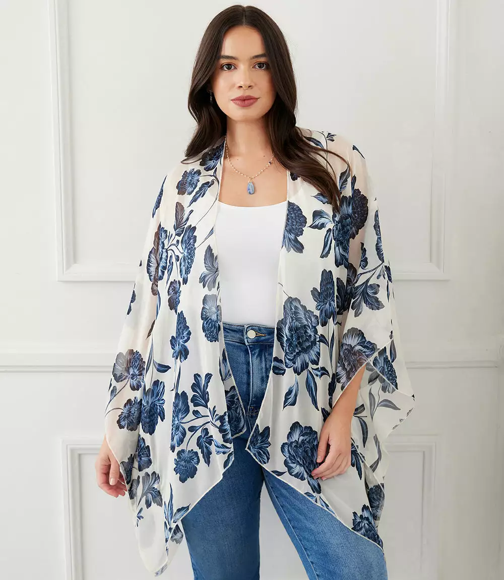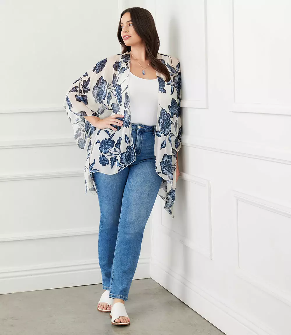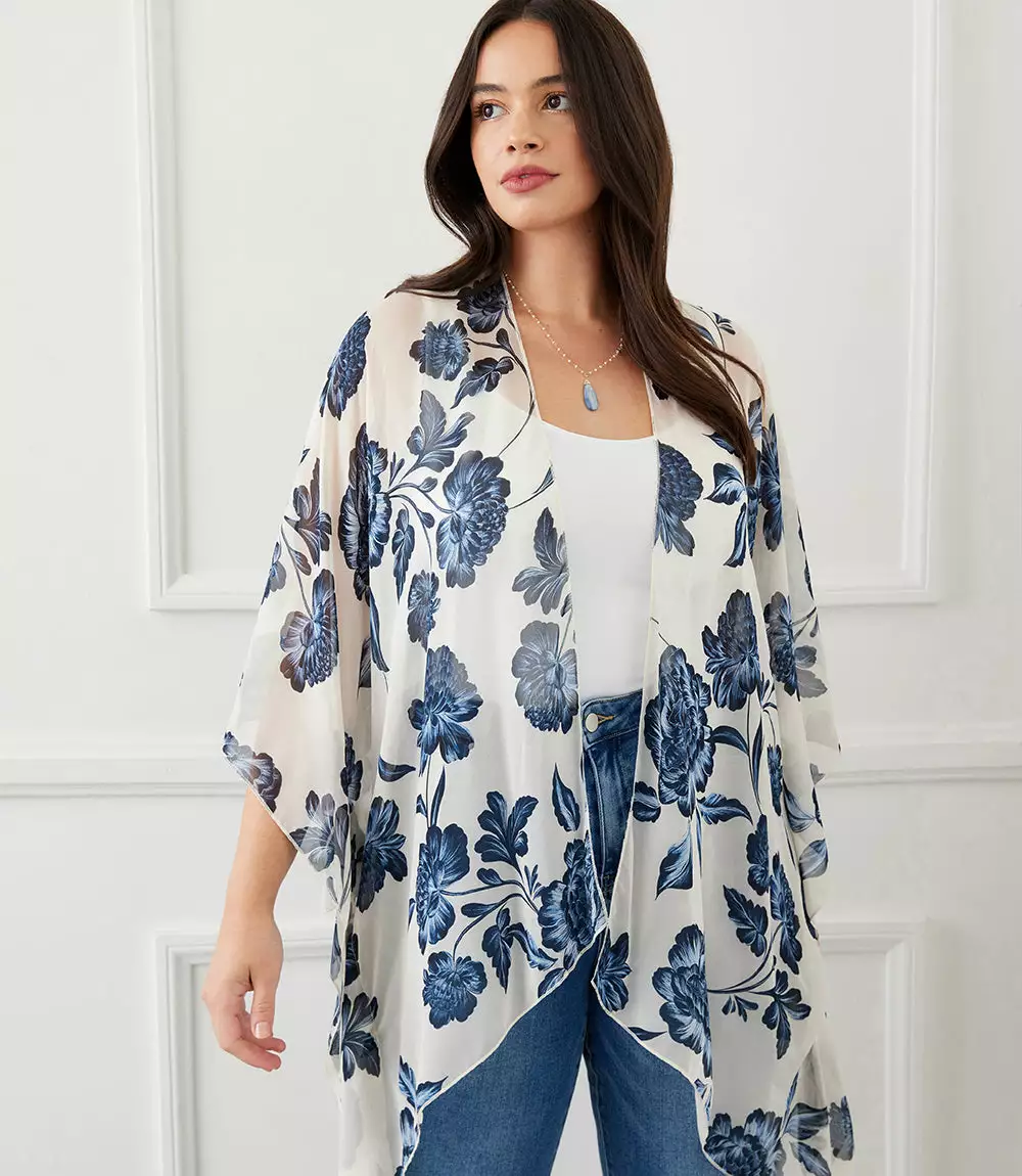 Finished with a delicate floral pattern this lightweight jacket offers soft movement with its draped silhouette. Complete your layered look with this open front jacket for easy, stylish coverage.
