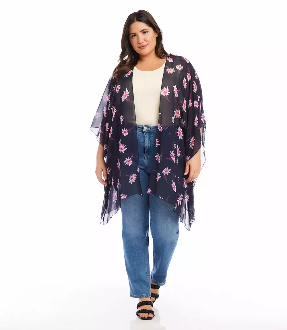A sheer cover-up with a floating floral print. Pairs perfectly with a pair of denim or shorts.