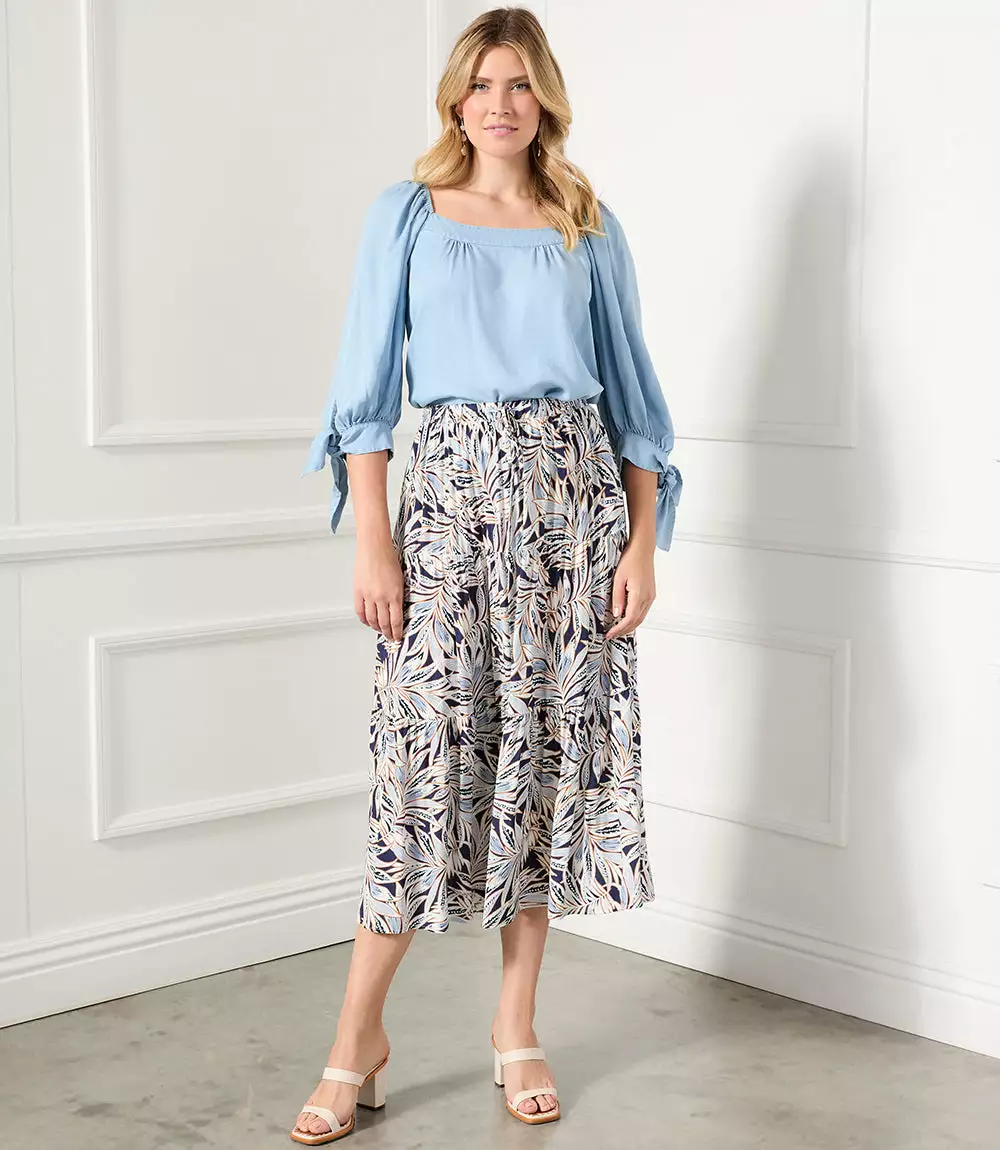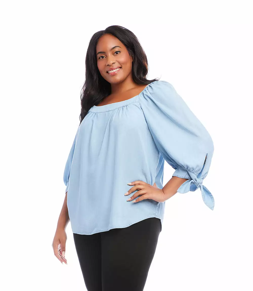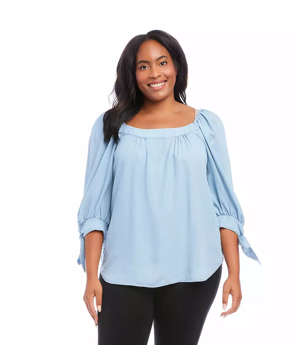 Soft chambray and darling ties delicately detail this warm weather top. It’s finished with a trend-right square neckline. This vintage-washed top has a soft touch and stretch for ease and comfort.