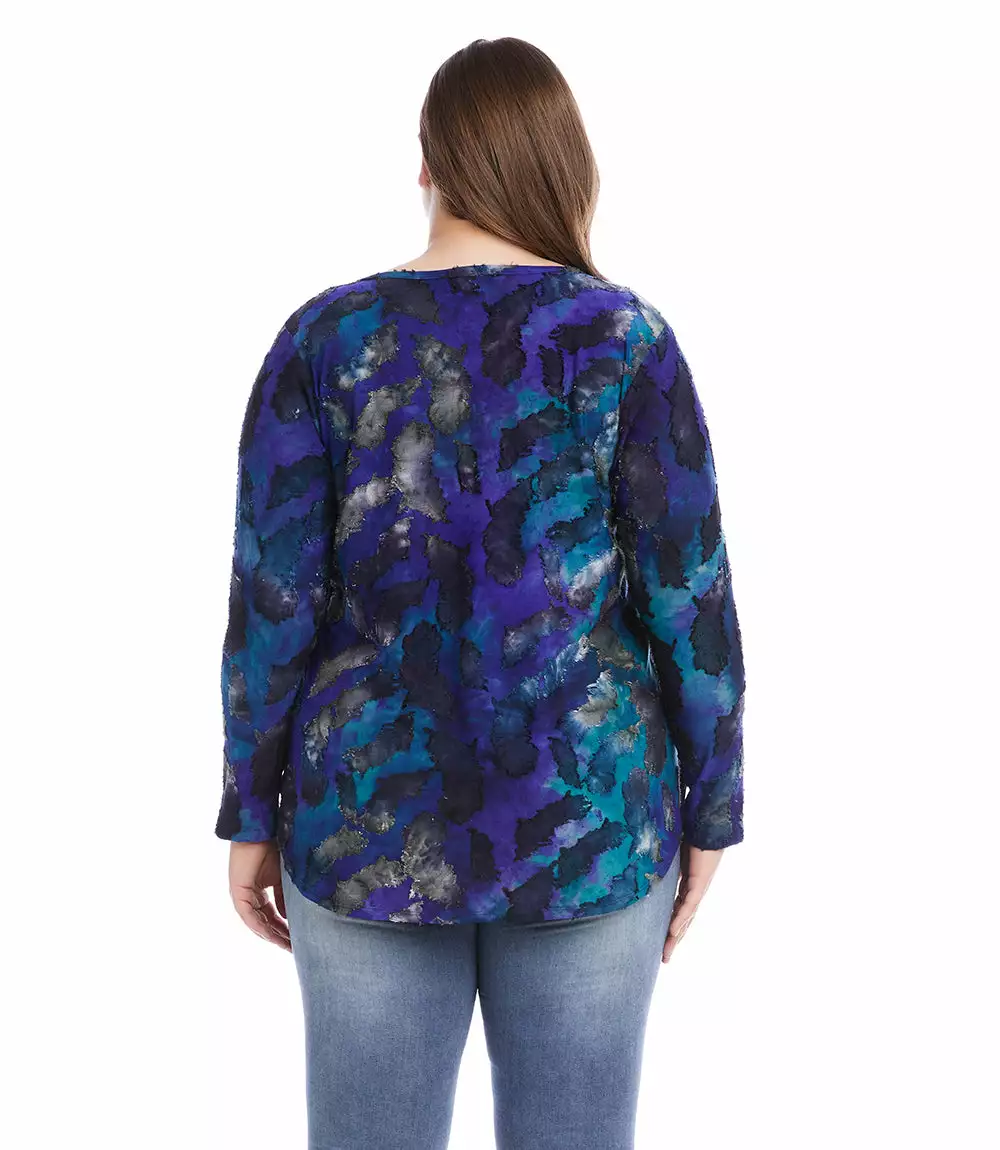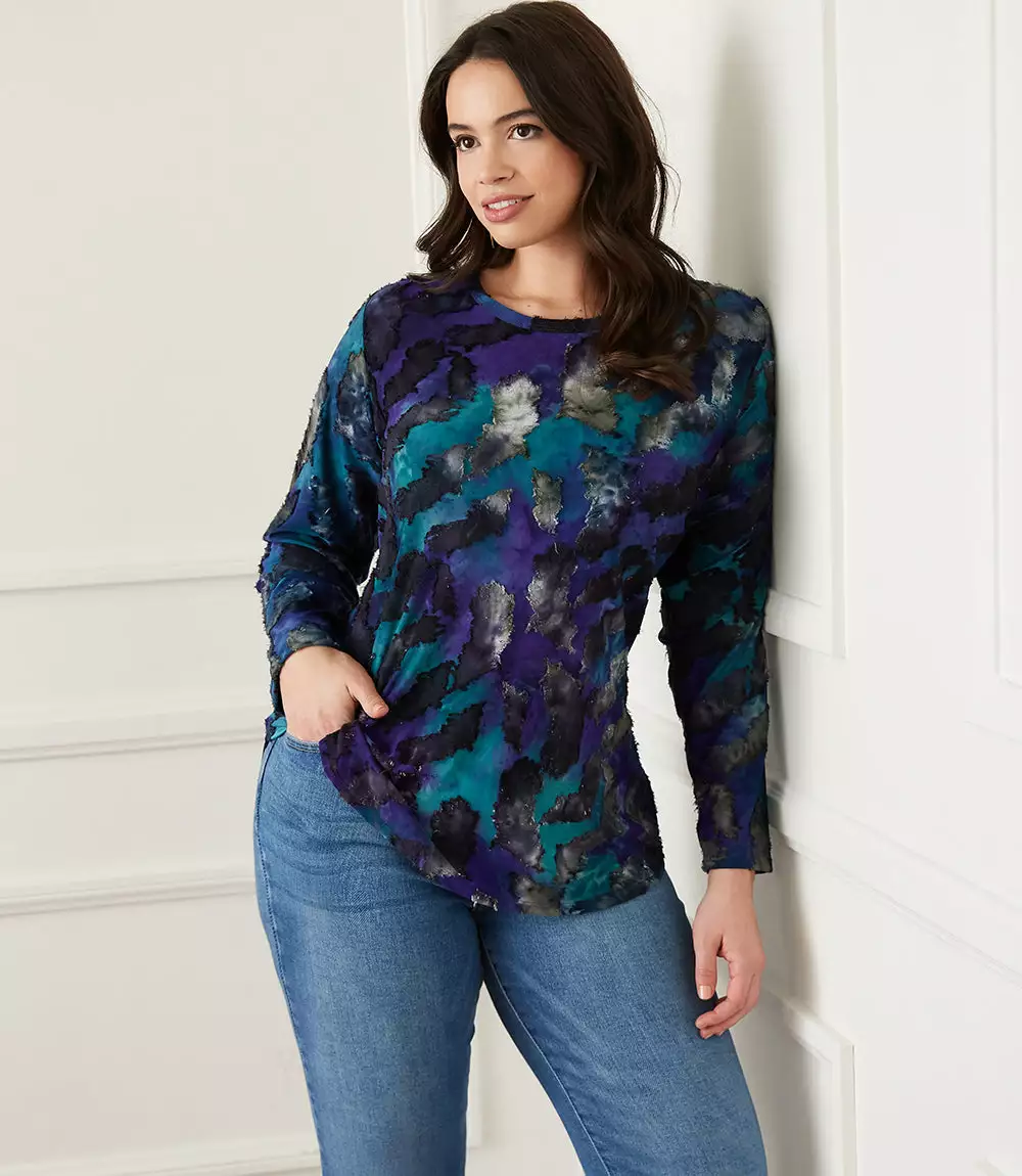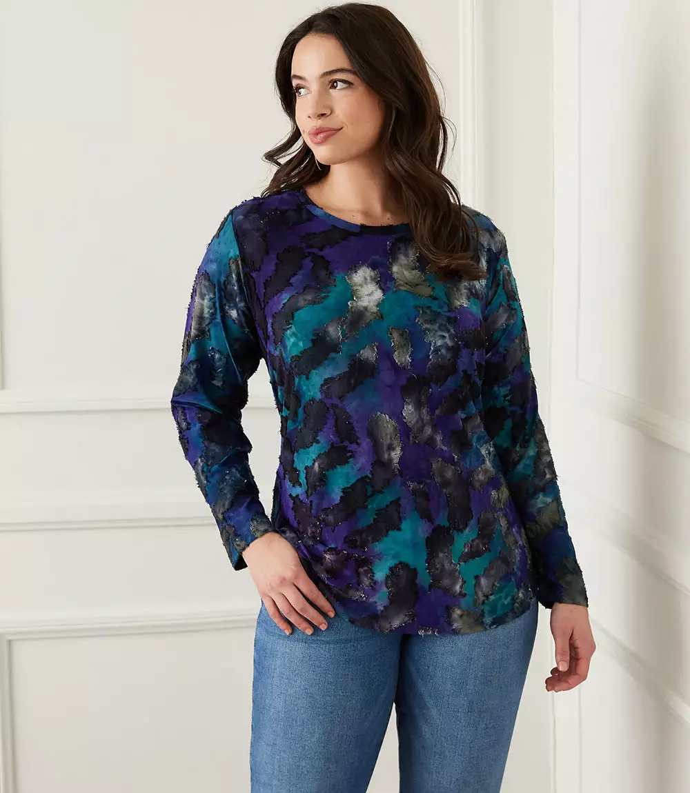 Textural beauty is found in this jacquard top covered in an alluring tie-dye leaf design. It pairs perfectly with your favorite denim.