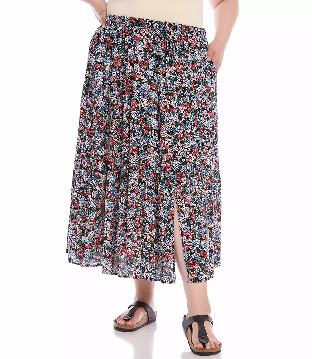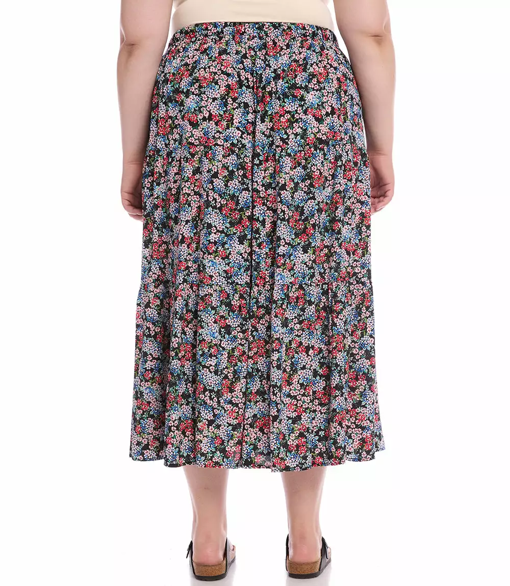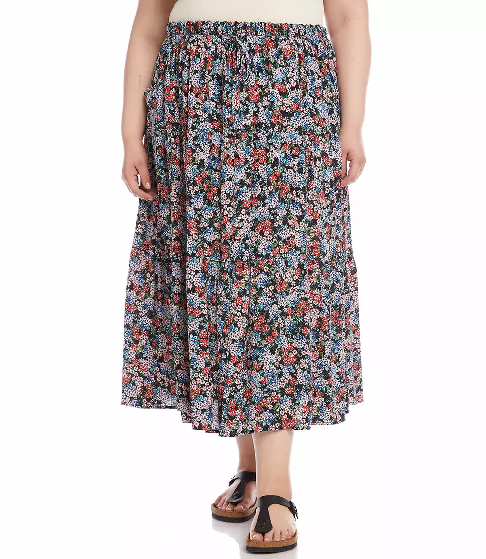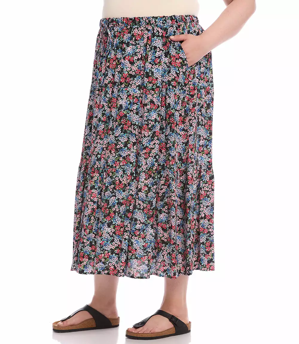 Take a walk in the garden in this free-flowing skirt featuring a fun ditsy floral print and an adjustable elastic waist. Breezy crepe fabric shapes a free-flowing silhouette of a essential midi skirt patterned with a beautiful garden floral print. Its tiered hem enhances the bohemian charm.