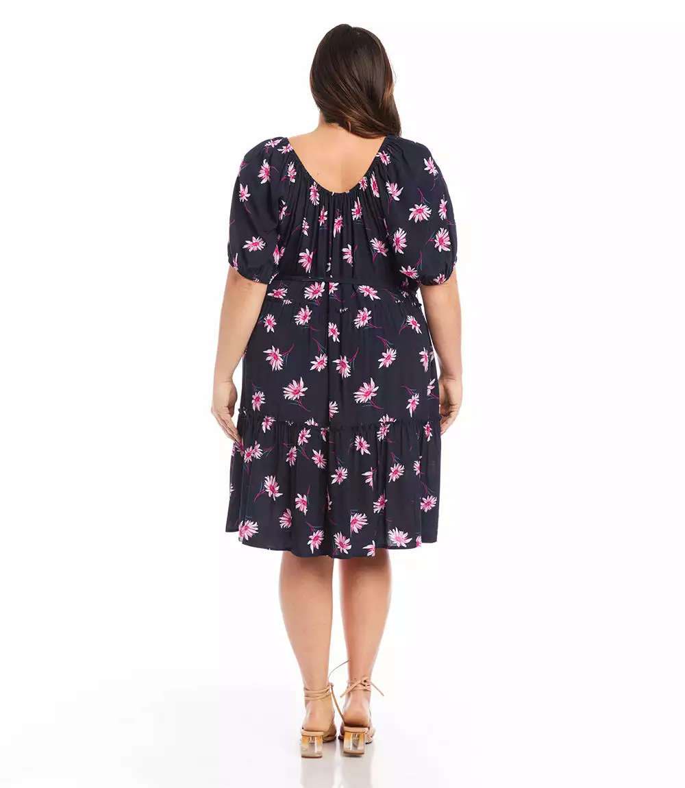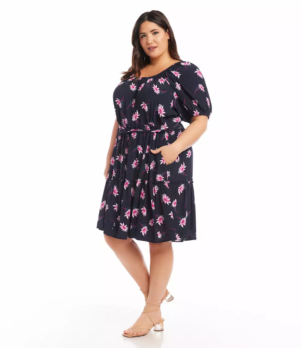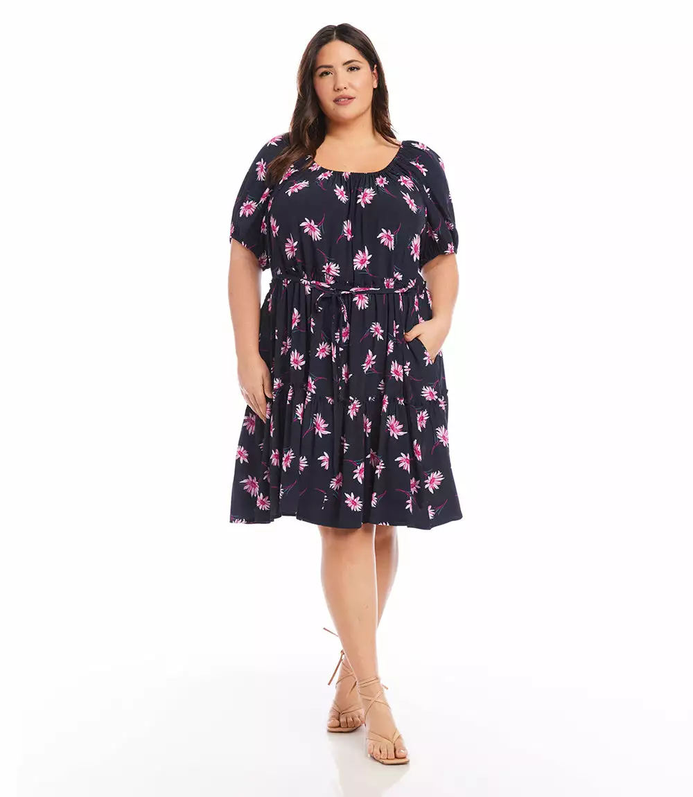 This colorful tiered dress is a dream to slip on and style. A tie around the waist adds shape for a flattering fit.