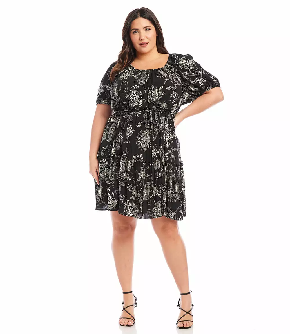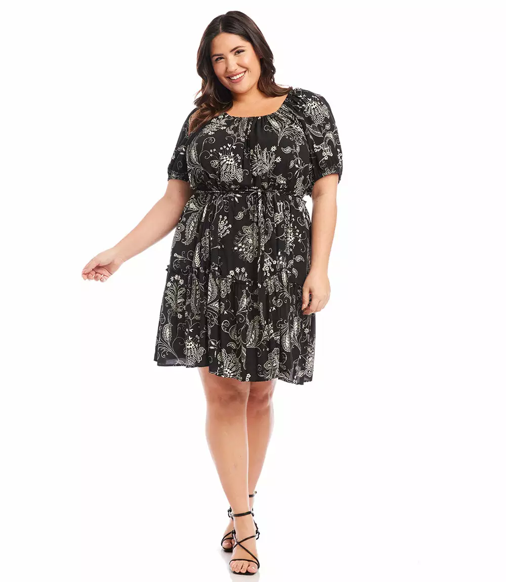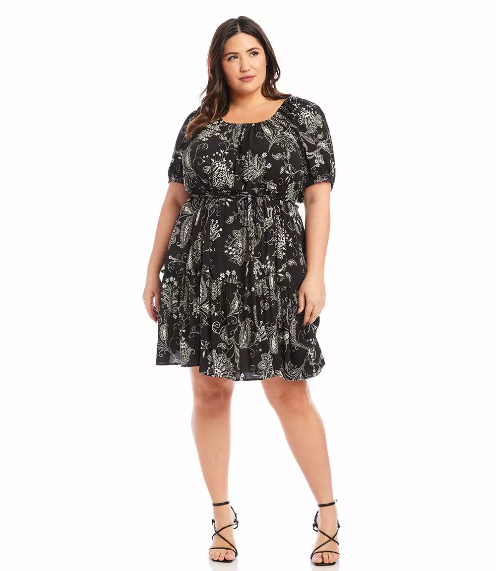 A charming scarf print puts a bohemian focus on this summer-ready dress. This statement-making dress features peasant sleeves, a tiered hem and flattering cinched waist and matching belt.