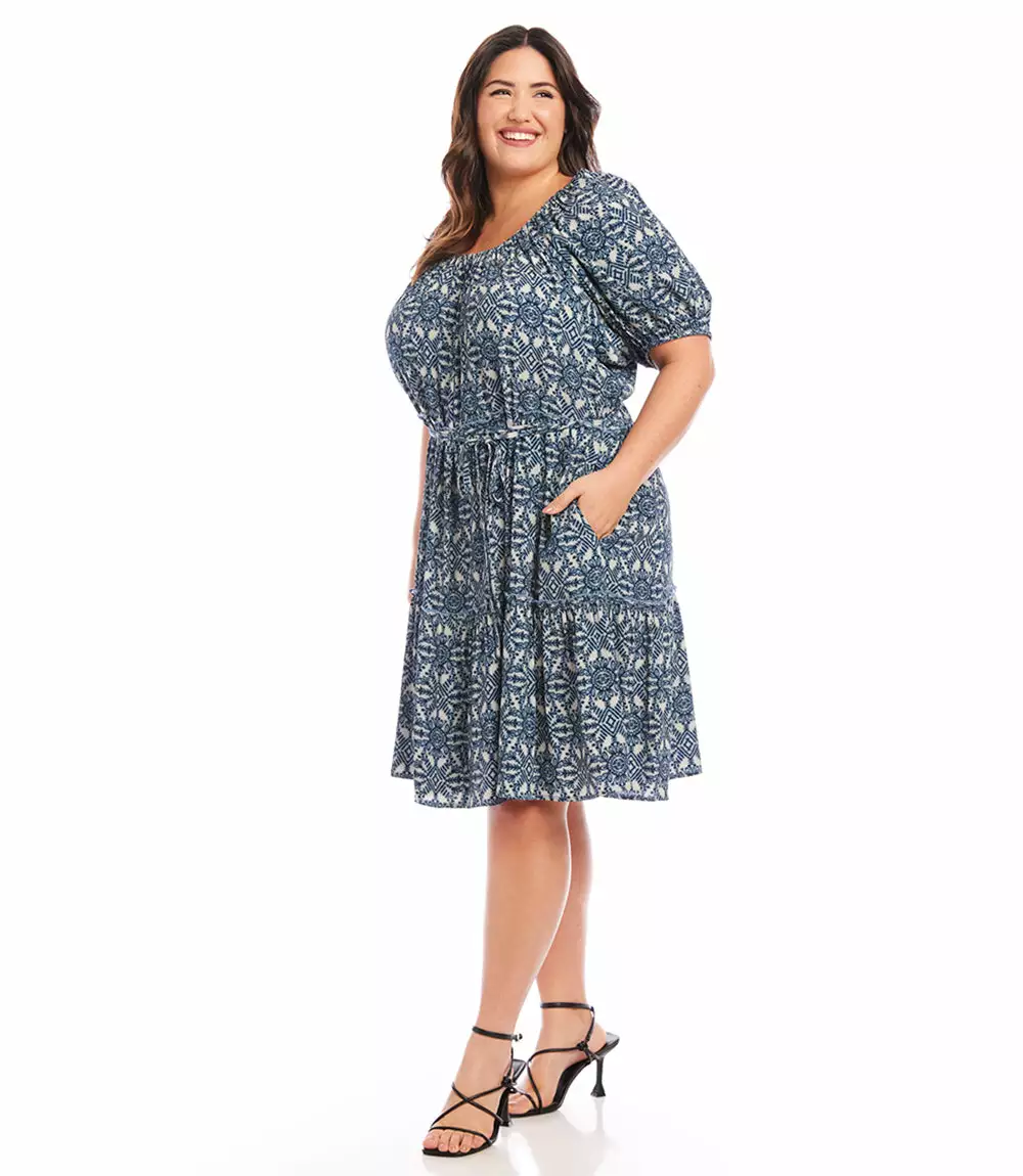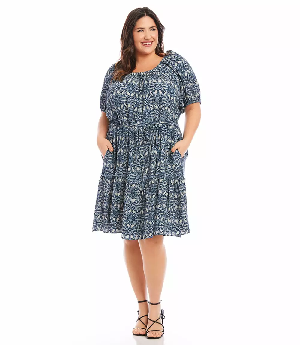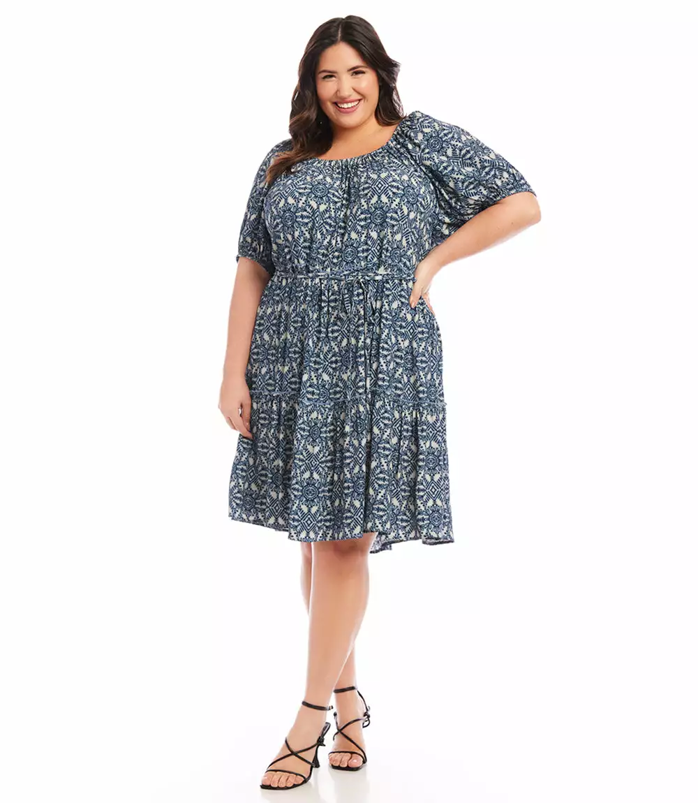 A chic stamped batik print puts a bohemian focus on this summer-ready dress. This statement-making dress features peasant sleeves, a tiered hem and a flattering cinched waist.