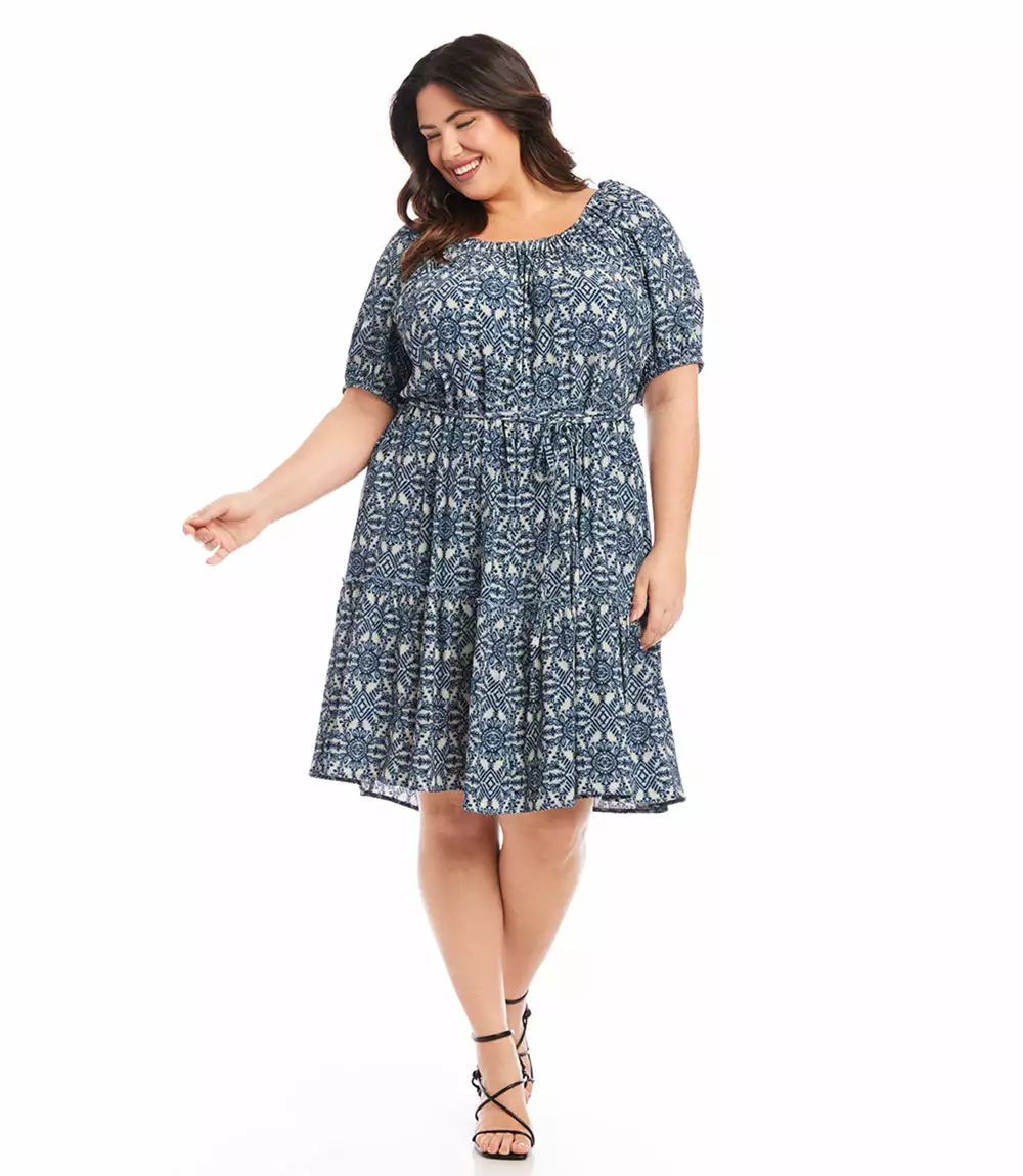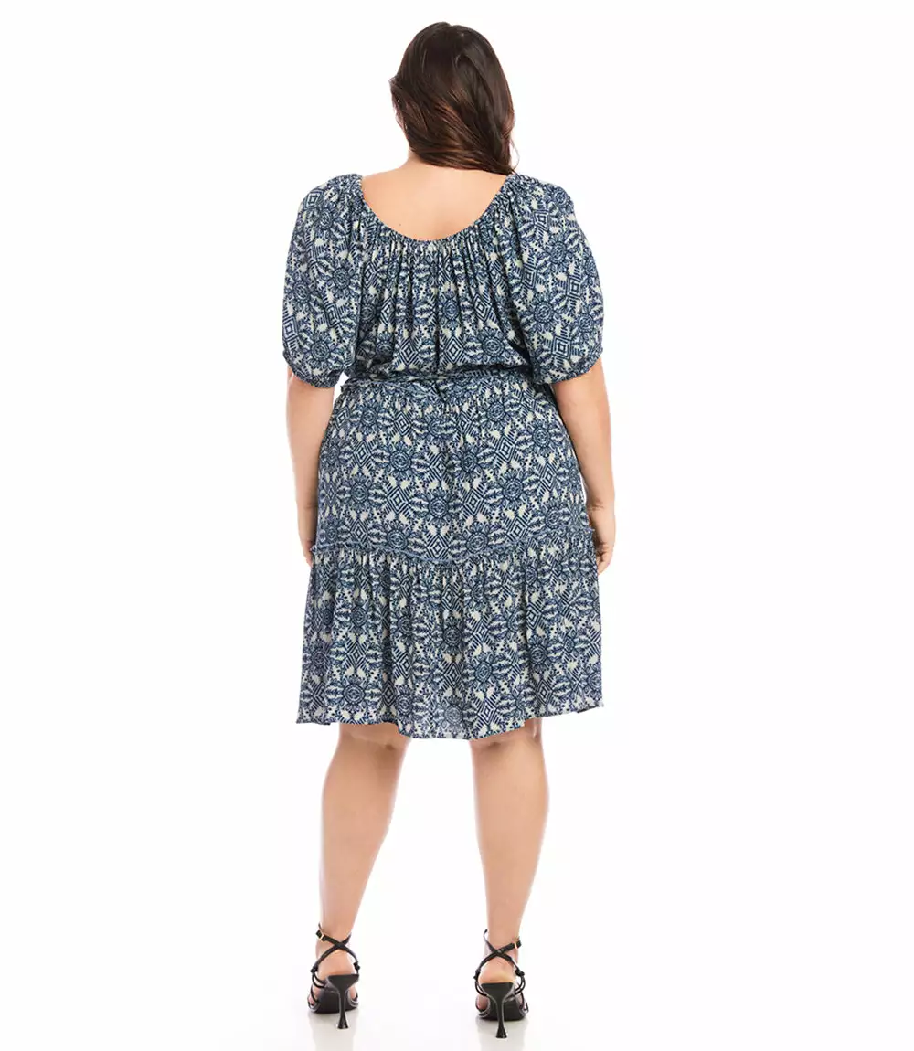 A chic stamped batik print puts a bohemian focus on this summer-ready dress. This statement-making dress features peasant sleeves, a tiered hem and a flattering cinched waist.