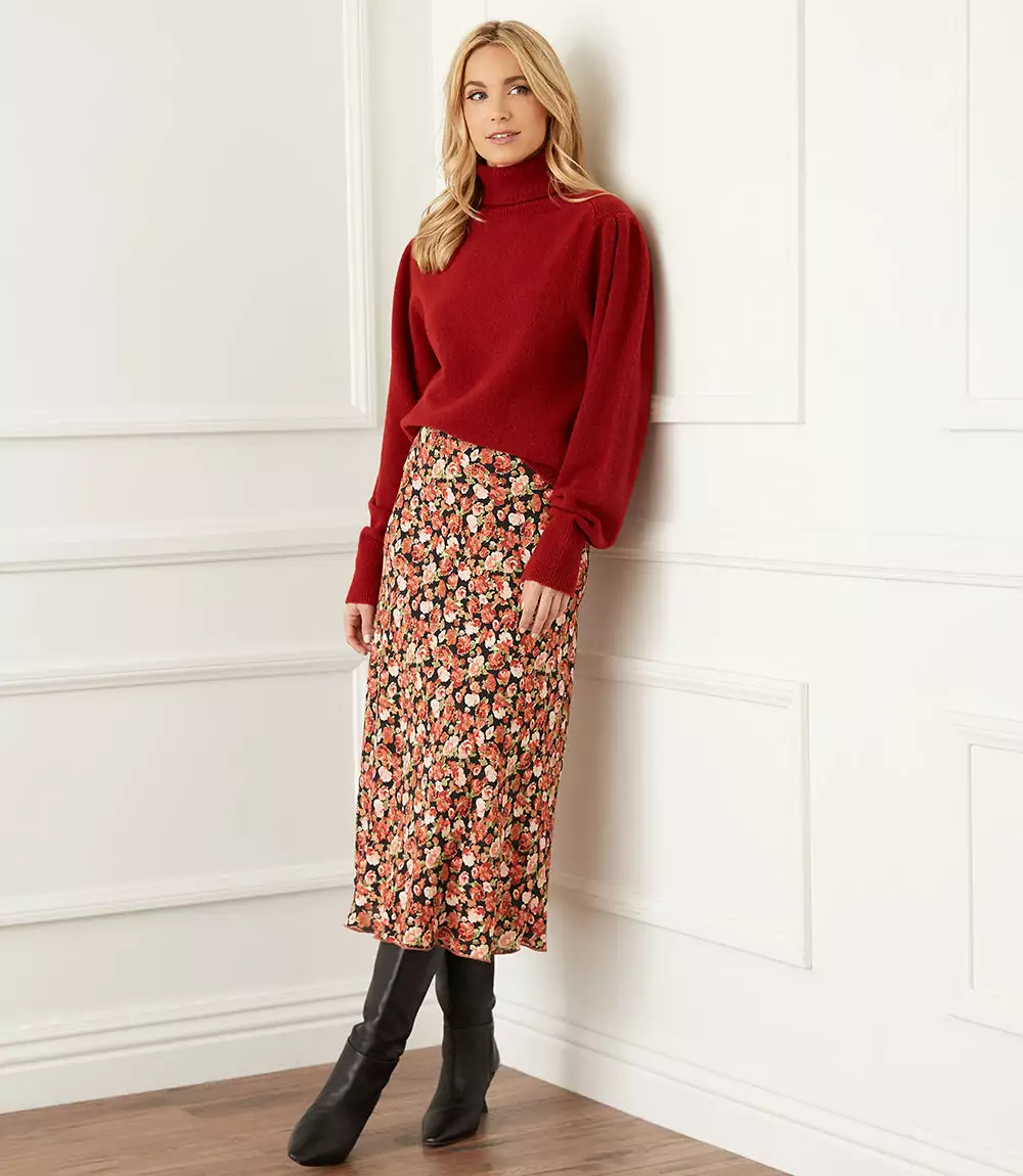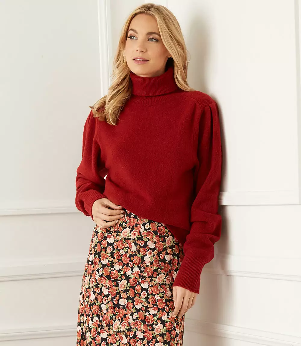 Crafted from super soft plush knit, this essential sweater is detailed with statement-making puff sleeves and a cozy turtleneck. This sweater is a layering essential for the cooler temperatures ahead.