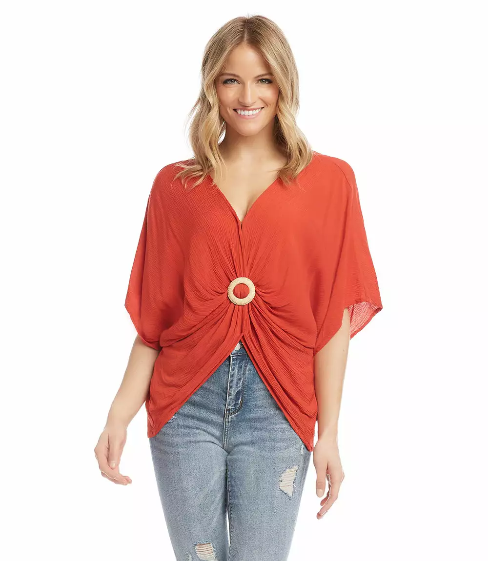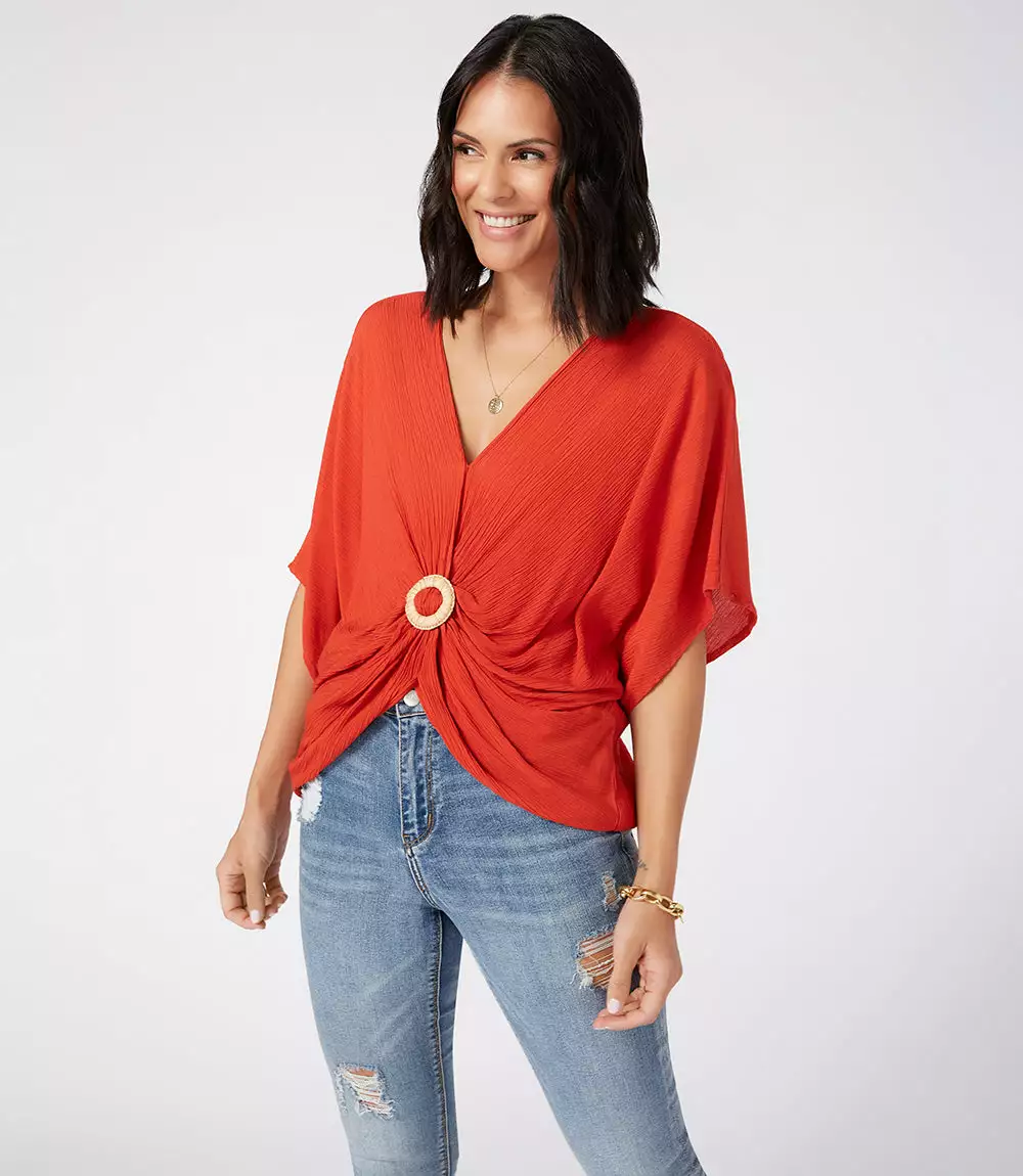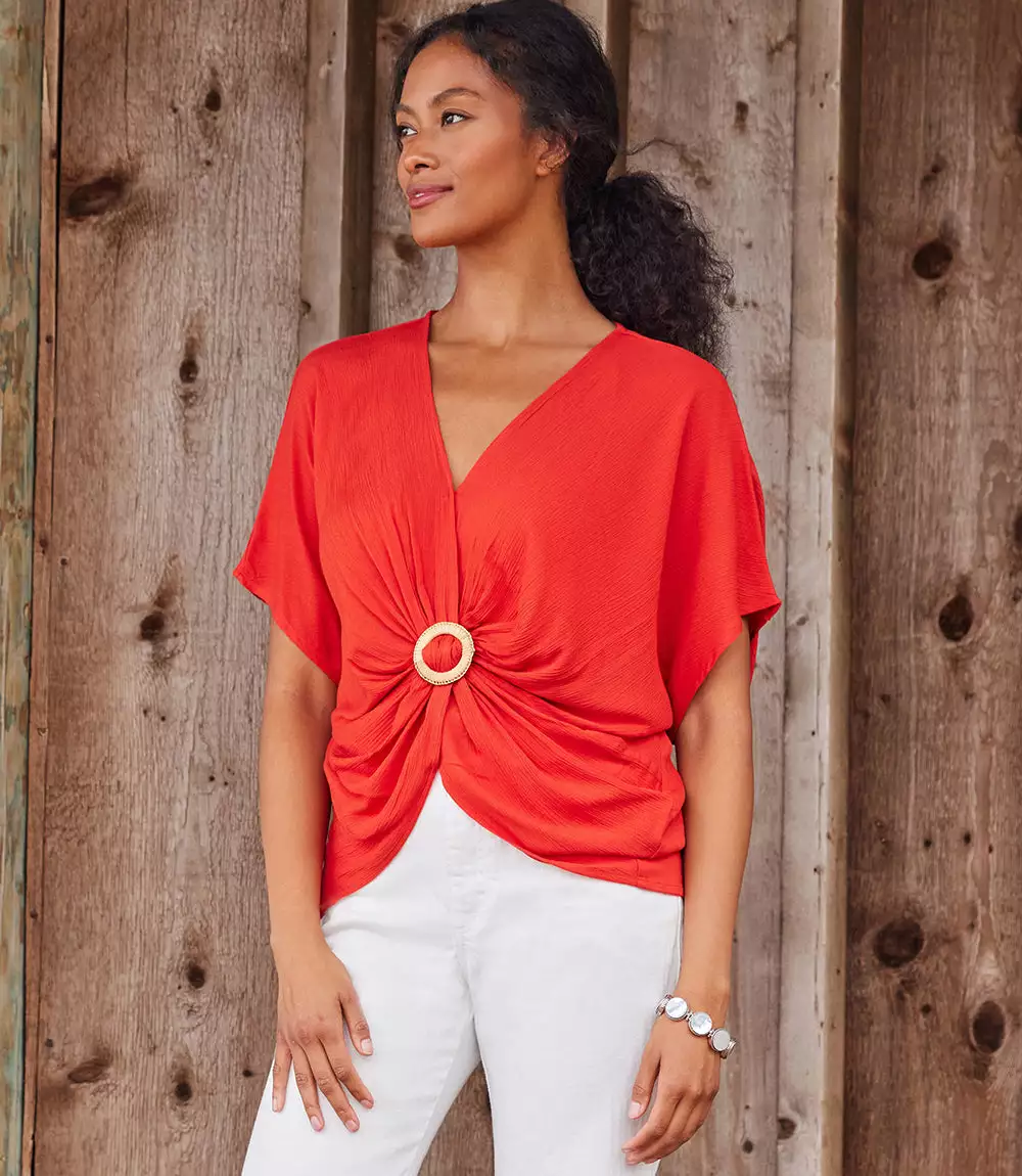Breezy rayon gauze shapes this twist-front top detailed with a charming rattan buckle. This top pairs perfectly with high-waisted jeans.