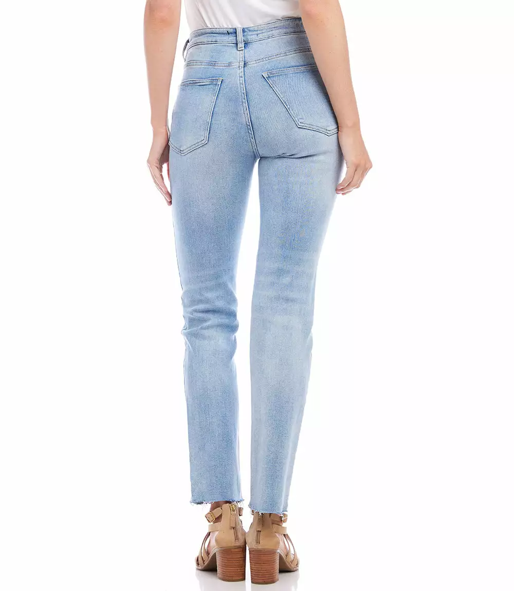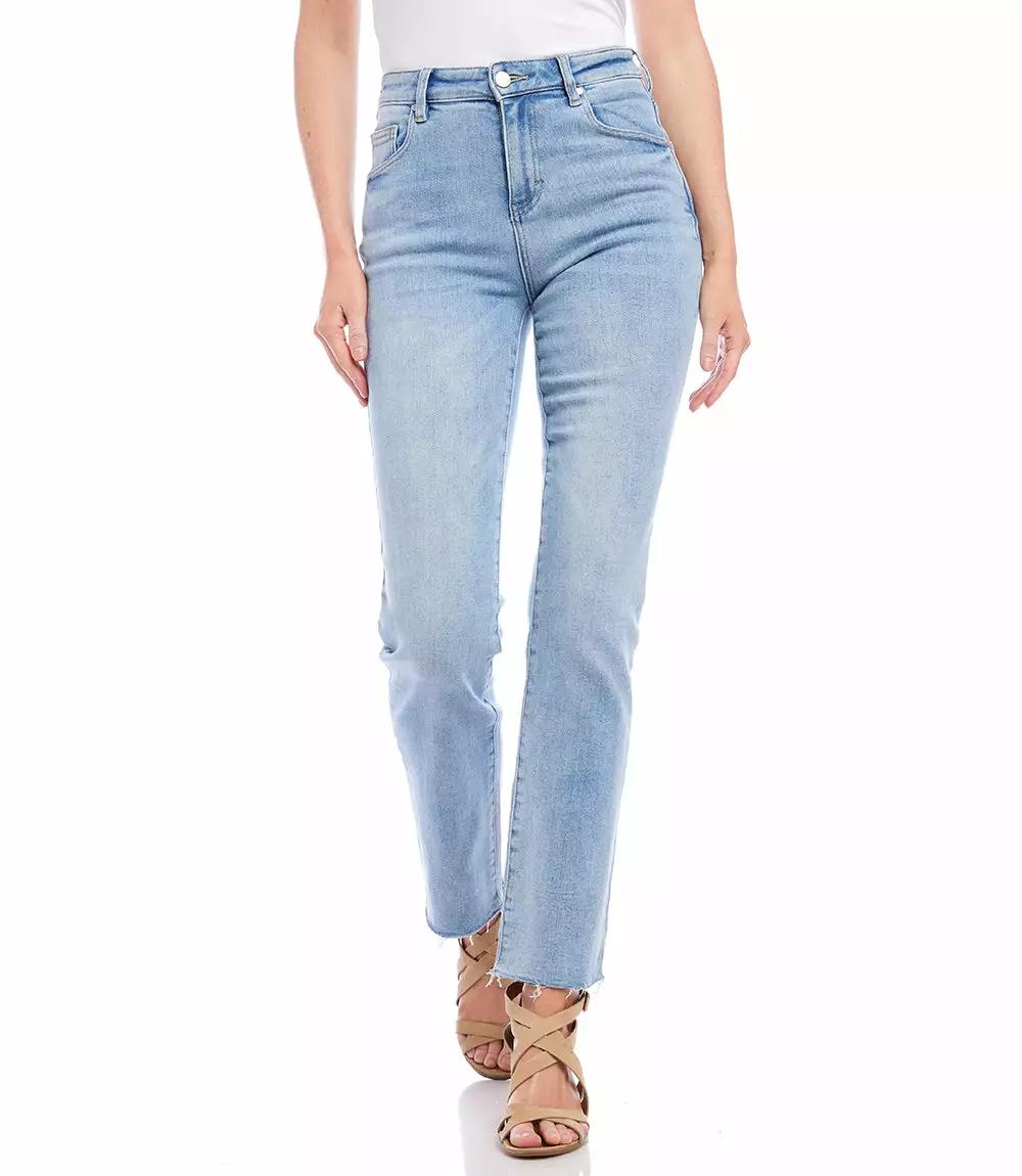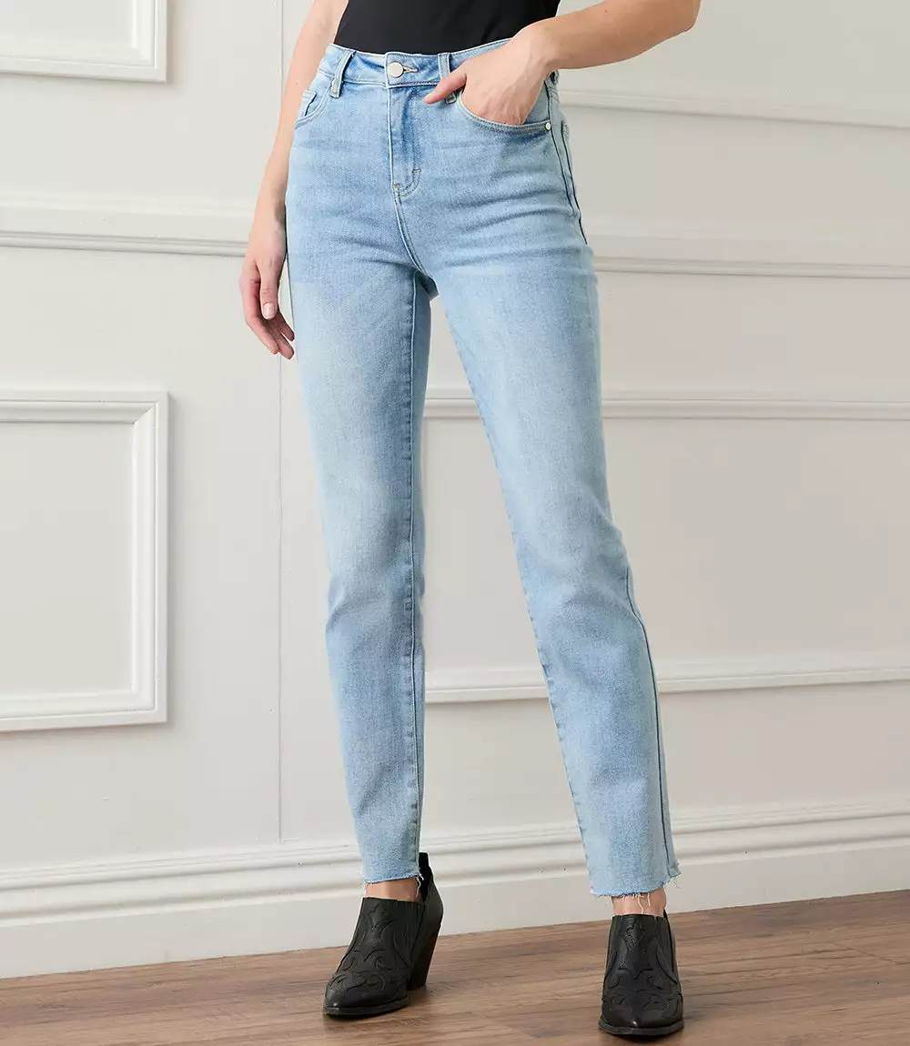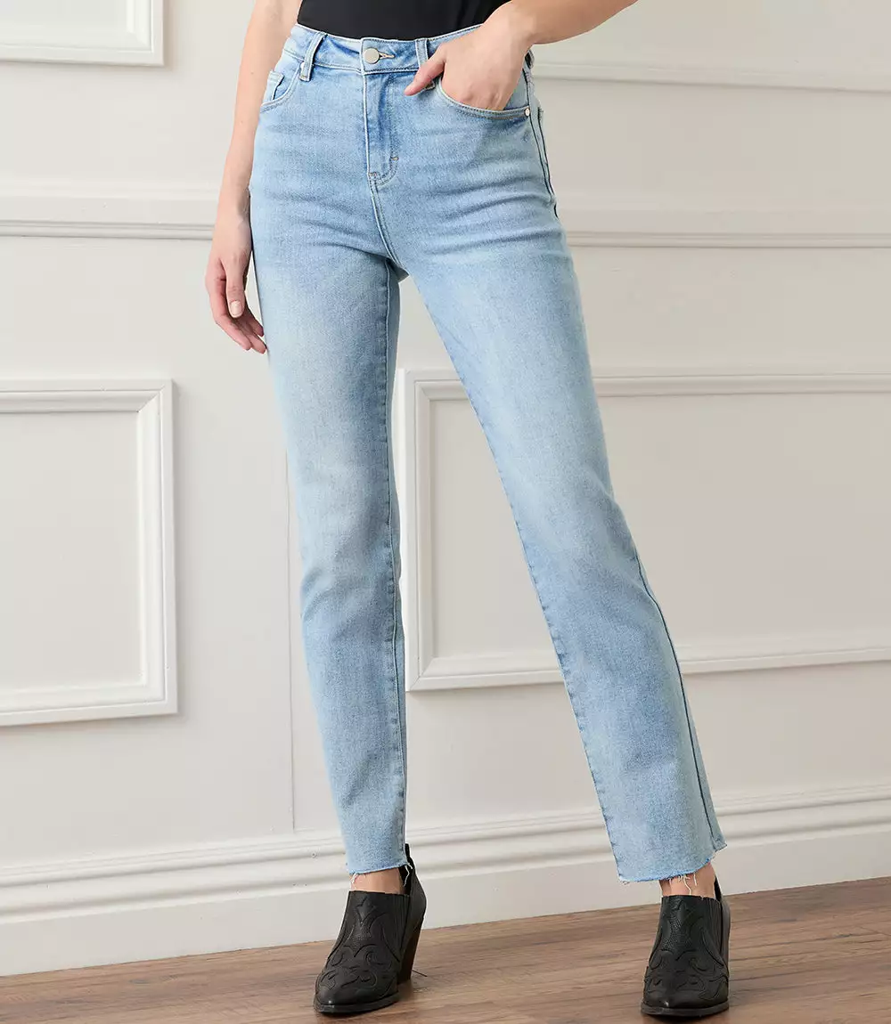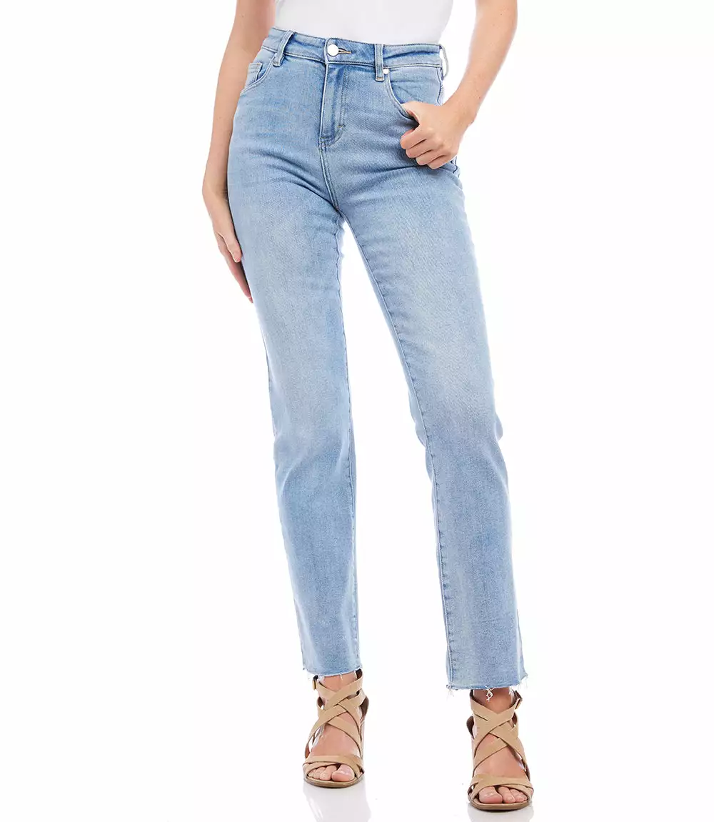 A faded blue wash, raw hem finish, and an ankle-grazing silhouette create the perfect go-to straight-leg jeans cut from stretchy denim. Five-pocket button-front jeans with a comfortably stretchy fit.