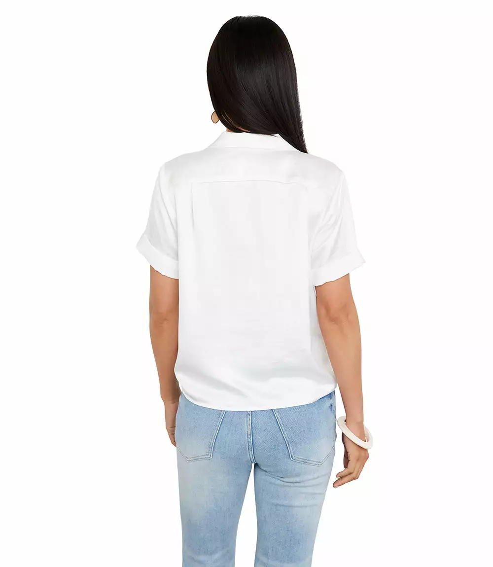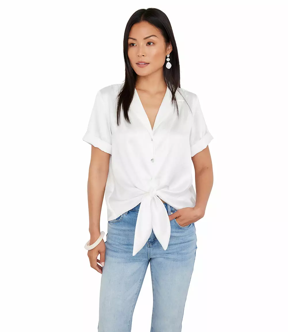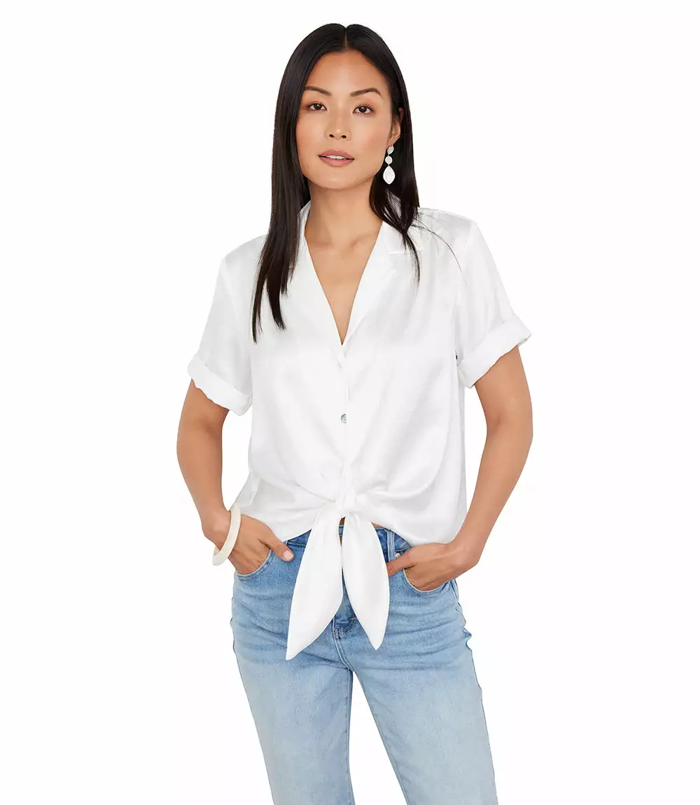 Cut from luxurious heavy satin, this top is detailed with a stylish tie-front and polished cuffed sleeves. This top pairs perfectly with linen shorts for a fresh, warm weather look.