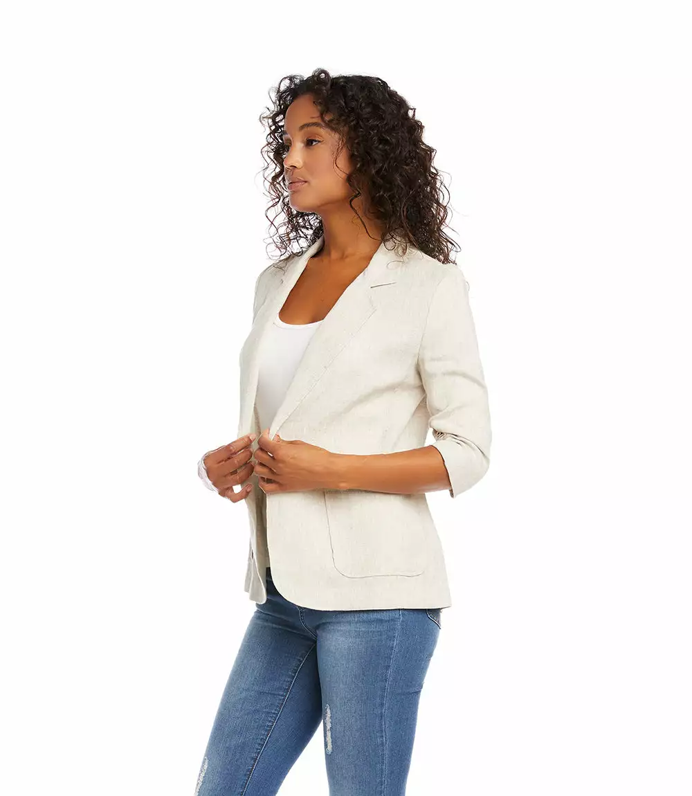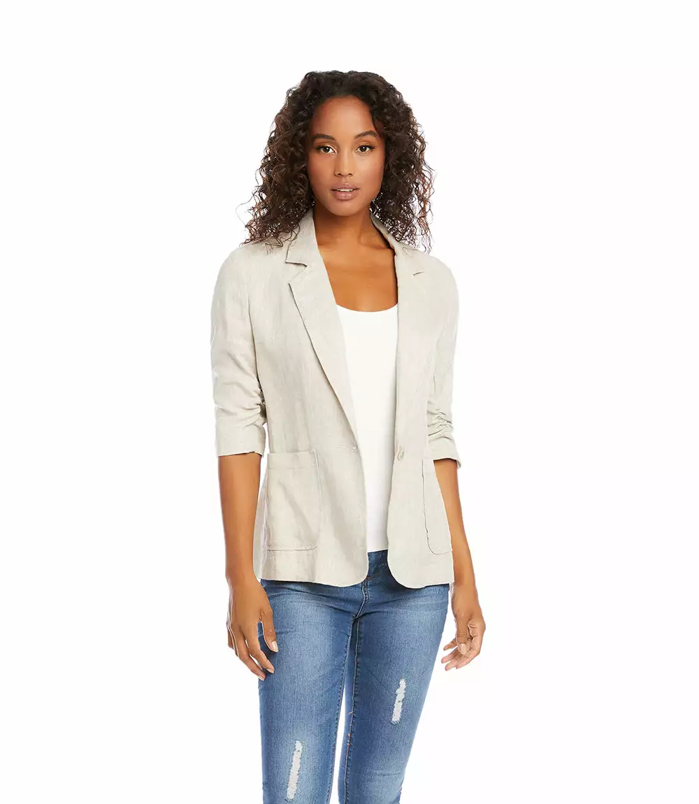 Polished details like a notched collar and ruched sleeves make this lightweight jacket work whether you’re in the city or at the beach.