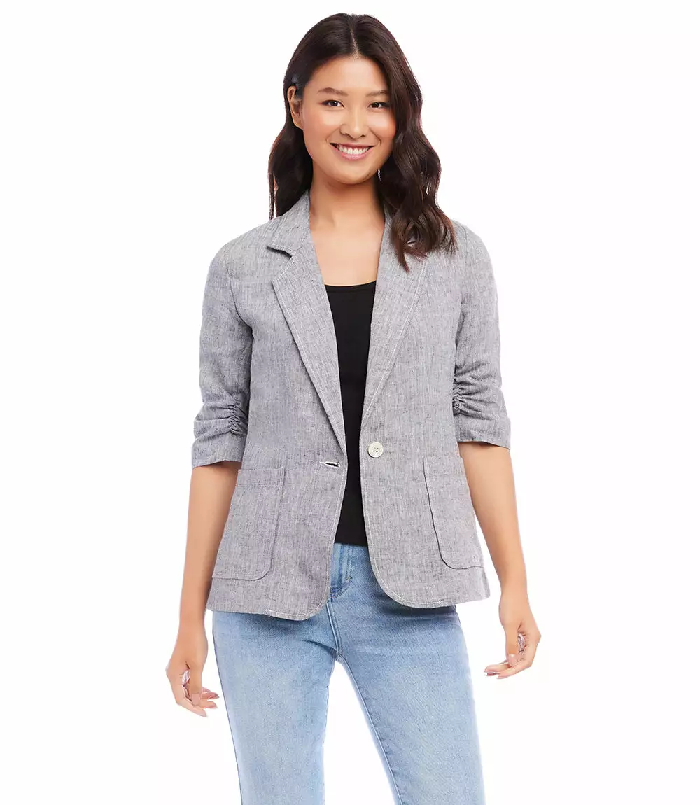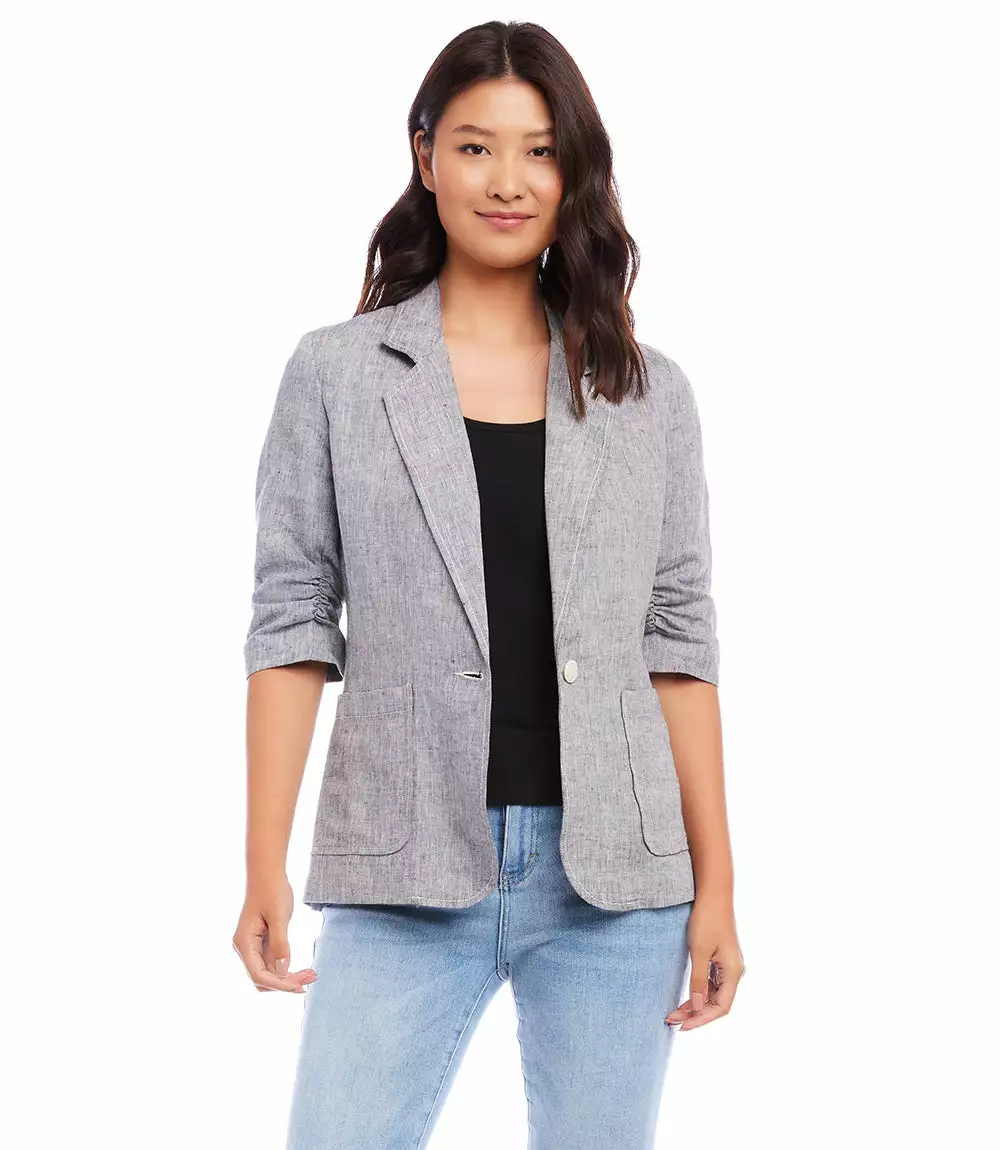 Polished details like a notched collar and ruched sleeves make this lightweight jacket work whether you’re in the city or at the beach. This effortless jacket is made from cool and breathable linen. It pairs perfectly with it’s matching linen shorts.