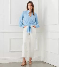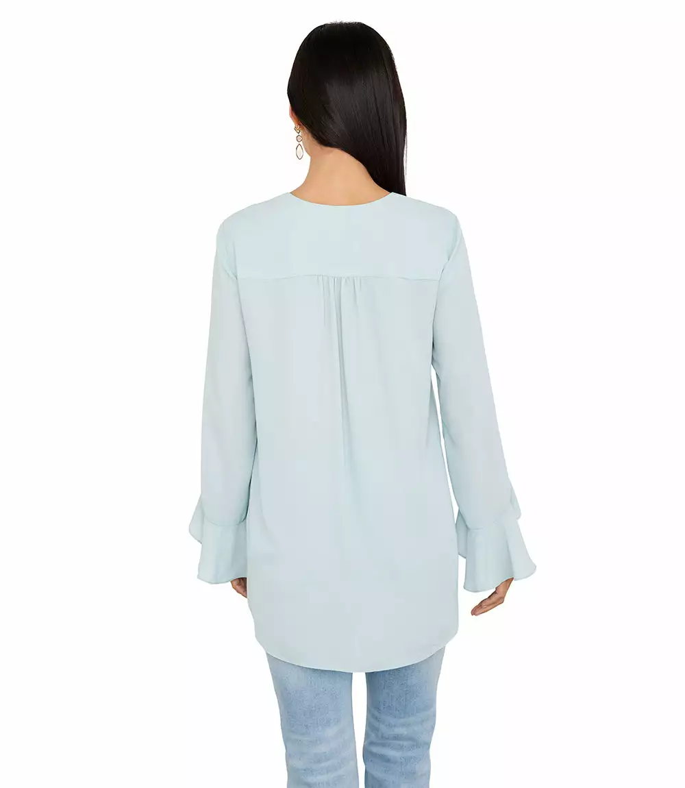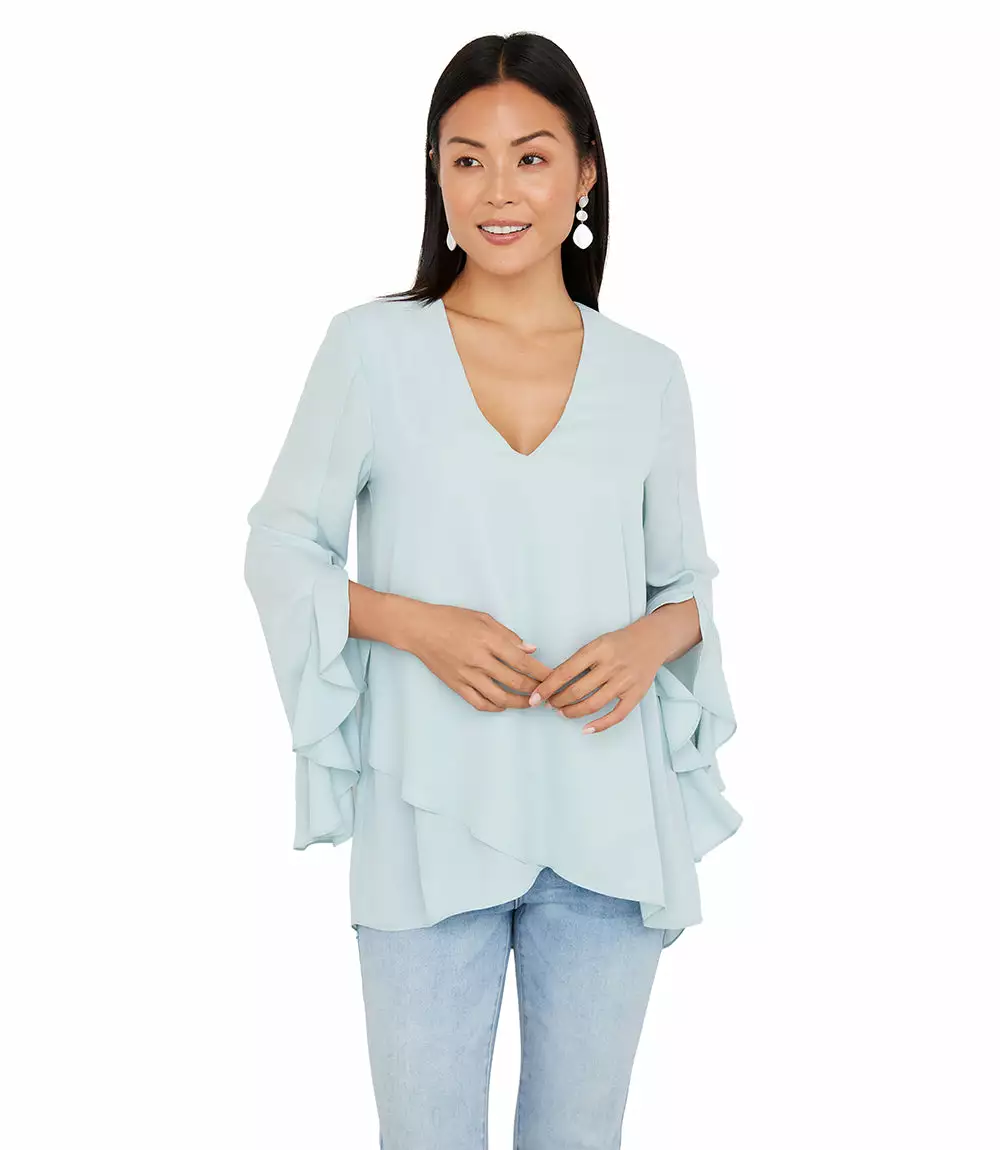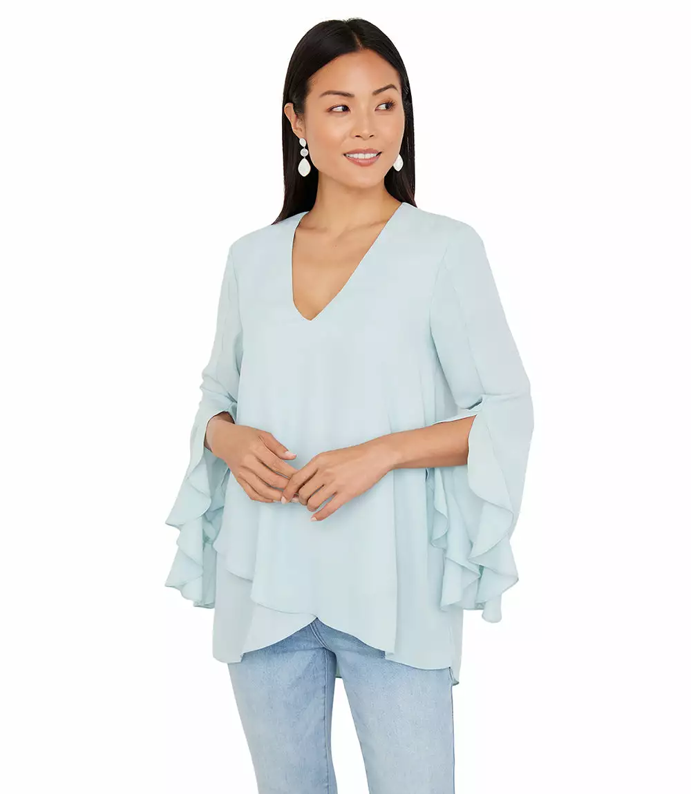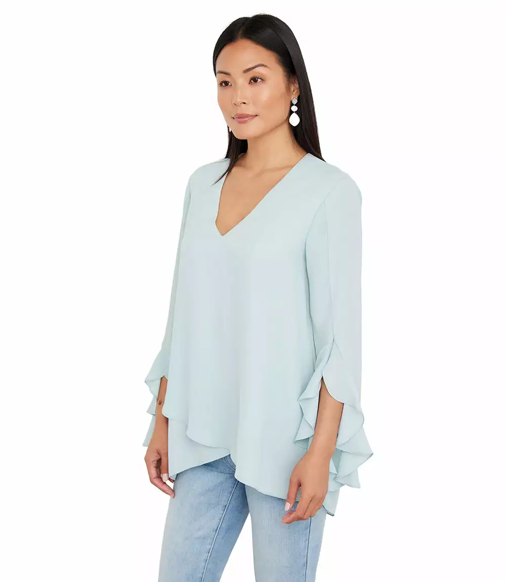 Flouncy ruffles decorate the sleeve of a silky crepe blouse styled with a crossover front panels that drape to a hi-lo hem.
