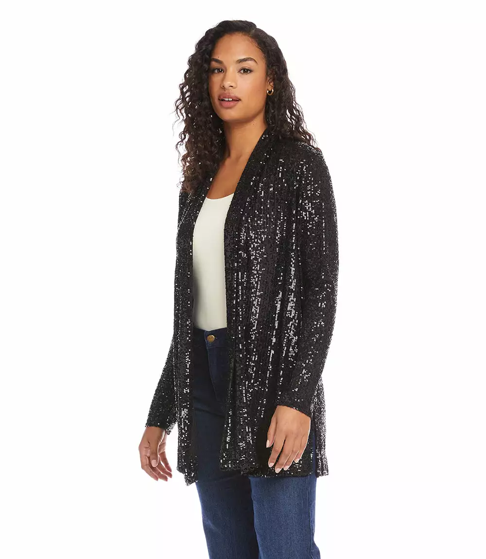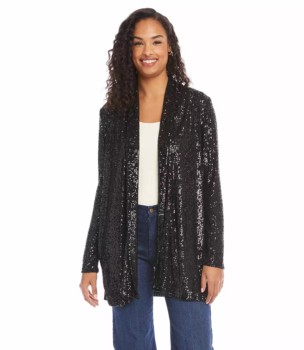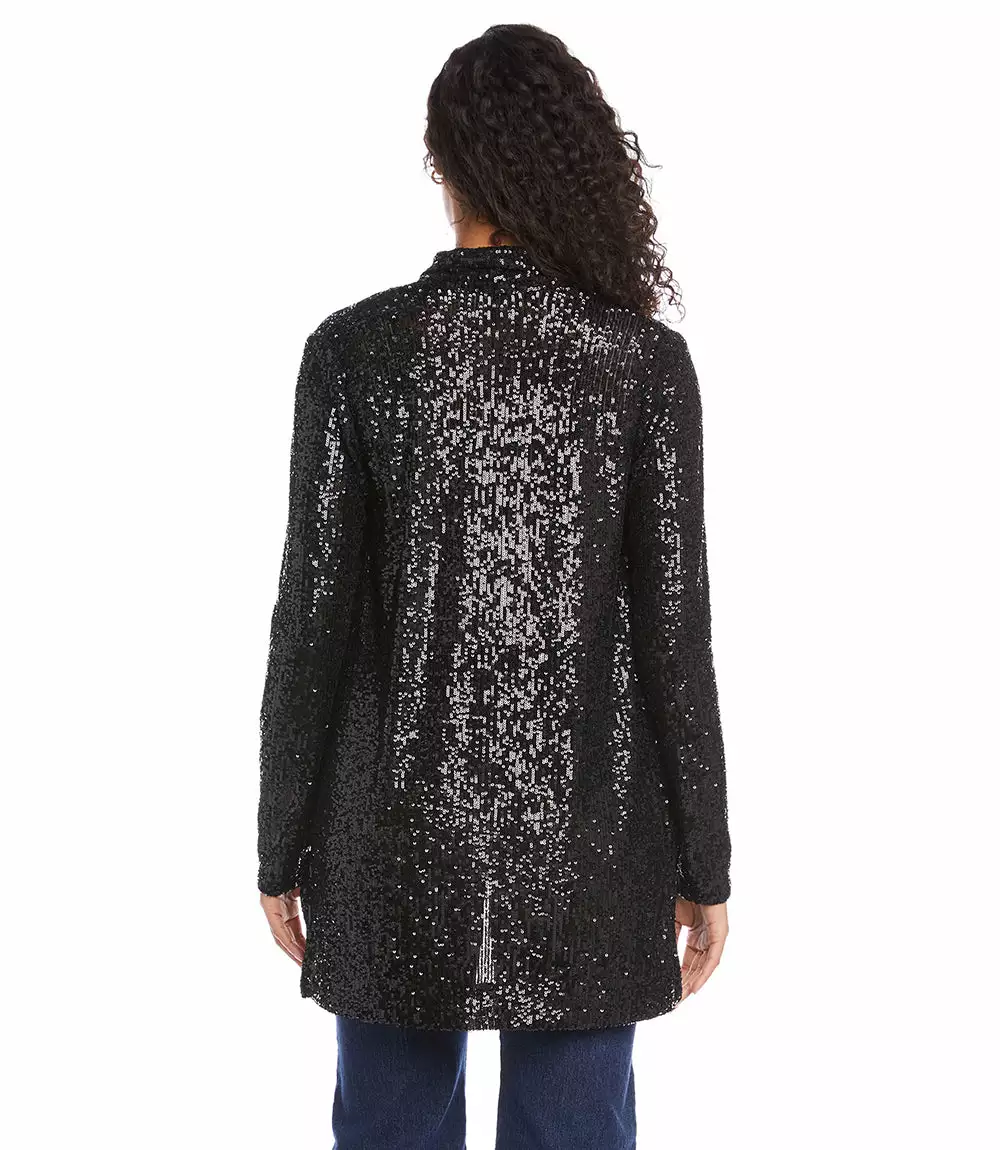 Light-catching sequins gives evening allure to this jacket. This sequin jacket will instantly elevate any look. Pair this jacket with black slacks for a head to toe polished look.