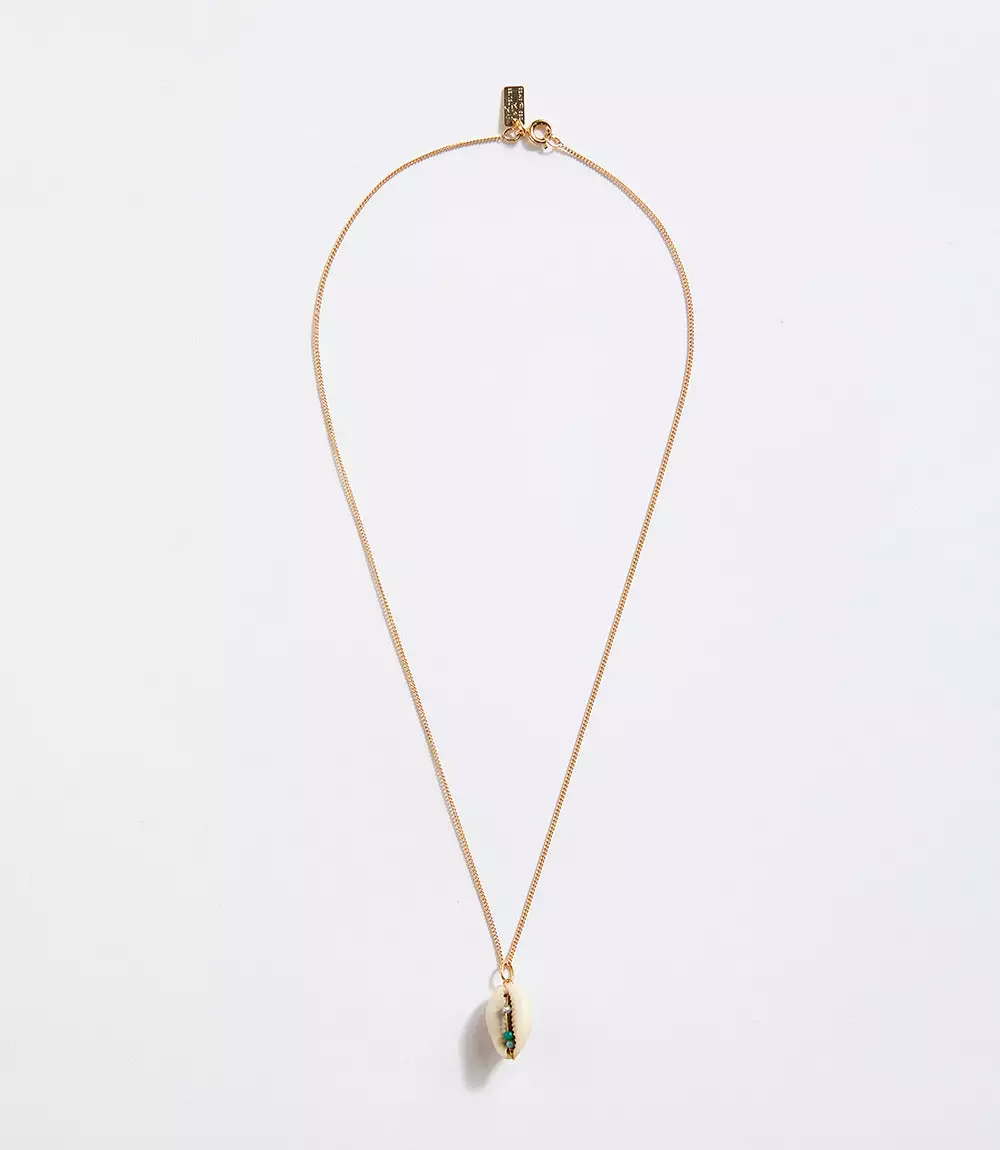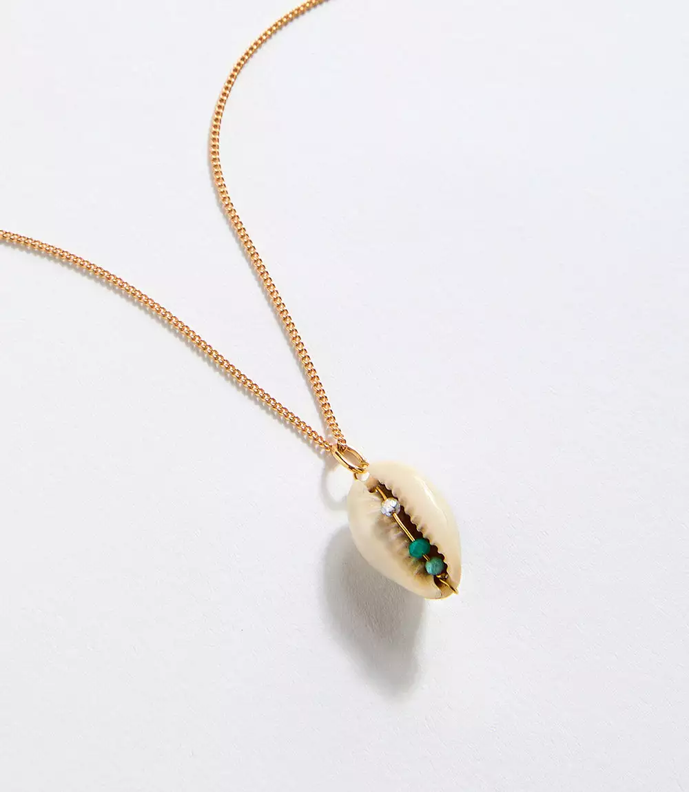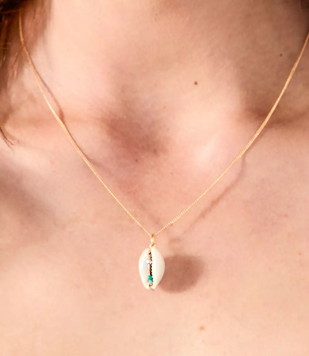 Handmade in France, this natural necklace features a polished natural cowrie shell decorated with small amazonite, green onyx, and labradorite gemstone beads.Â