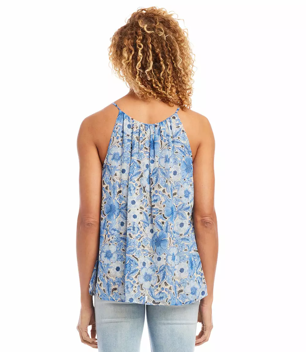 A watercolor floral print enlivens this light and lovely sleeveless blouse designed with a shirred neckline.