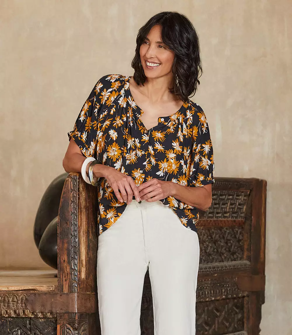 Puffed shoulders and a button-front peasant silhouette lend feminine flair to this breezy top. Pair it with high-waisted jeans or tailored shorts—its outfit possibilities are endless.