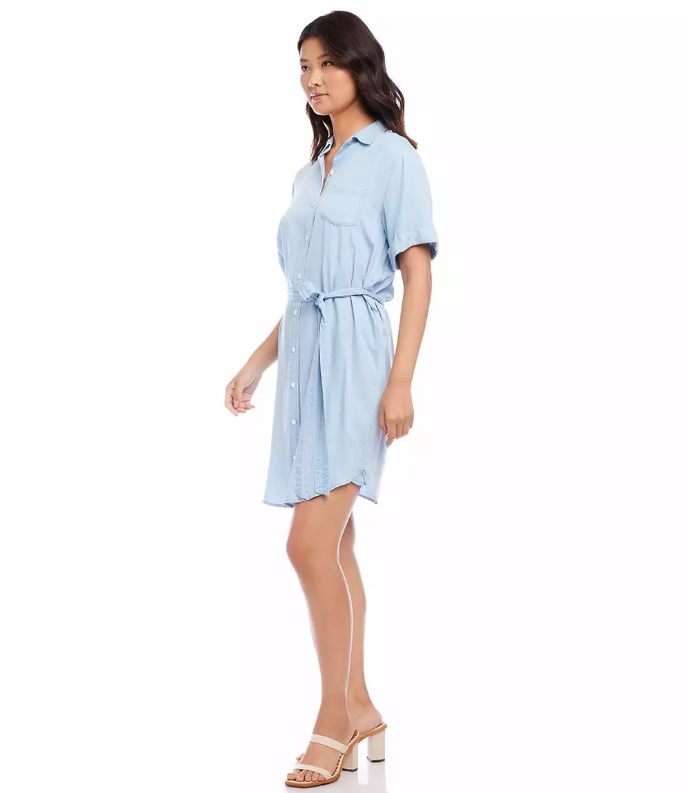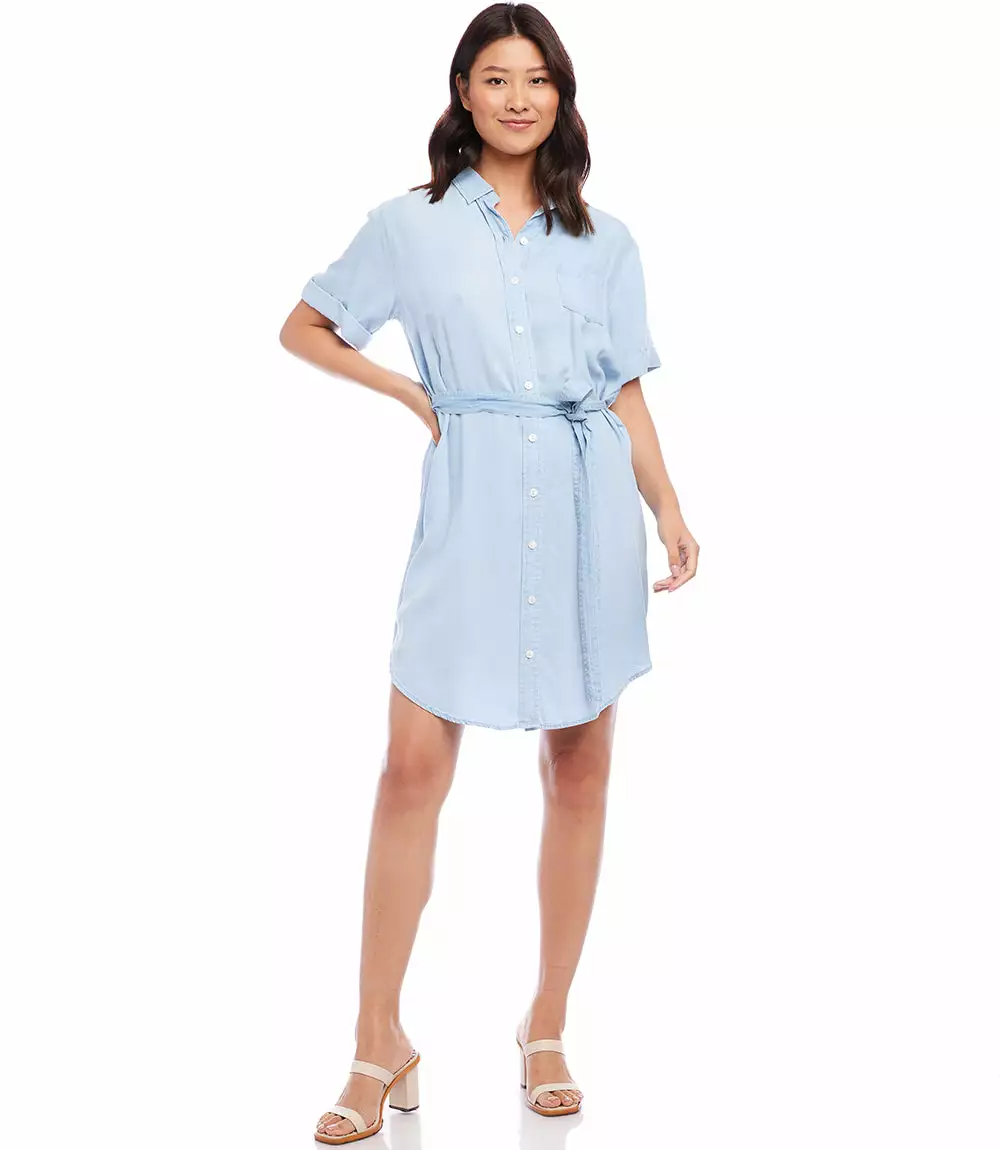 Soft and lightweight chambray shapes an effortlessly feminine shirtdress detailed with cuffed sleeves and a polished button front. It also features a flattering cinched waist and matching belt.