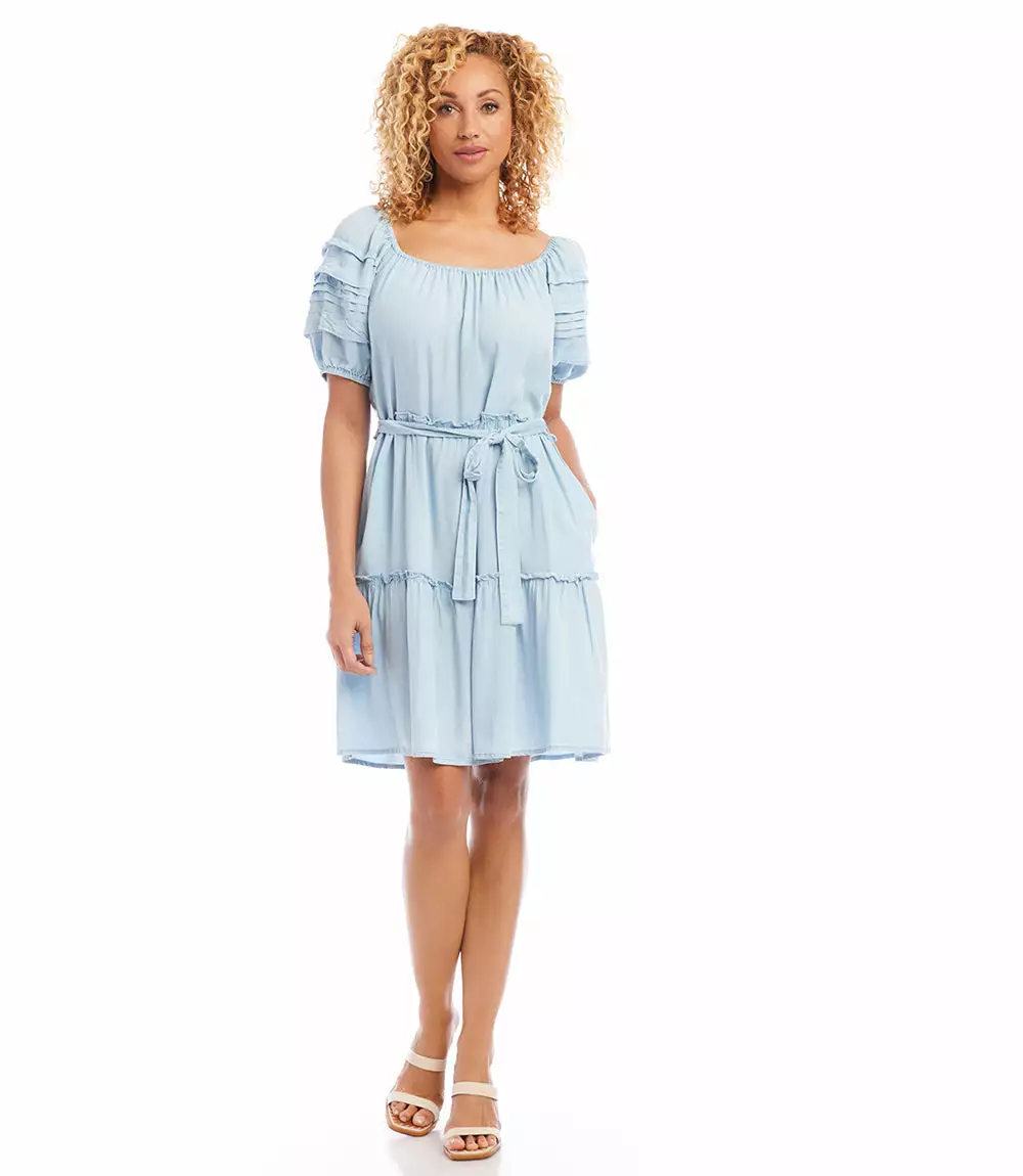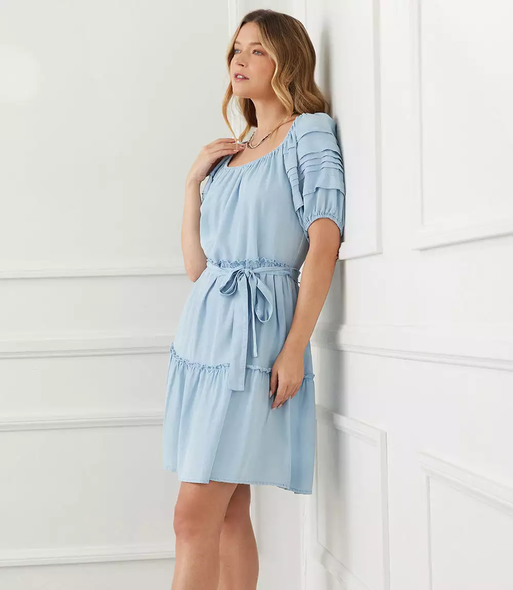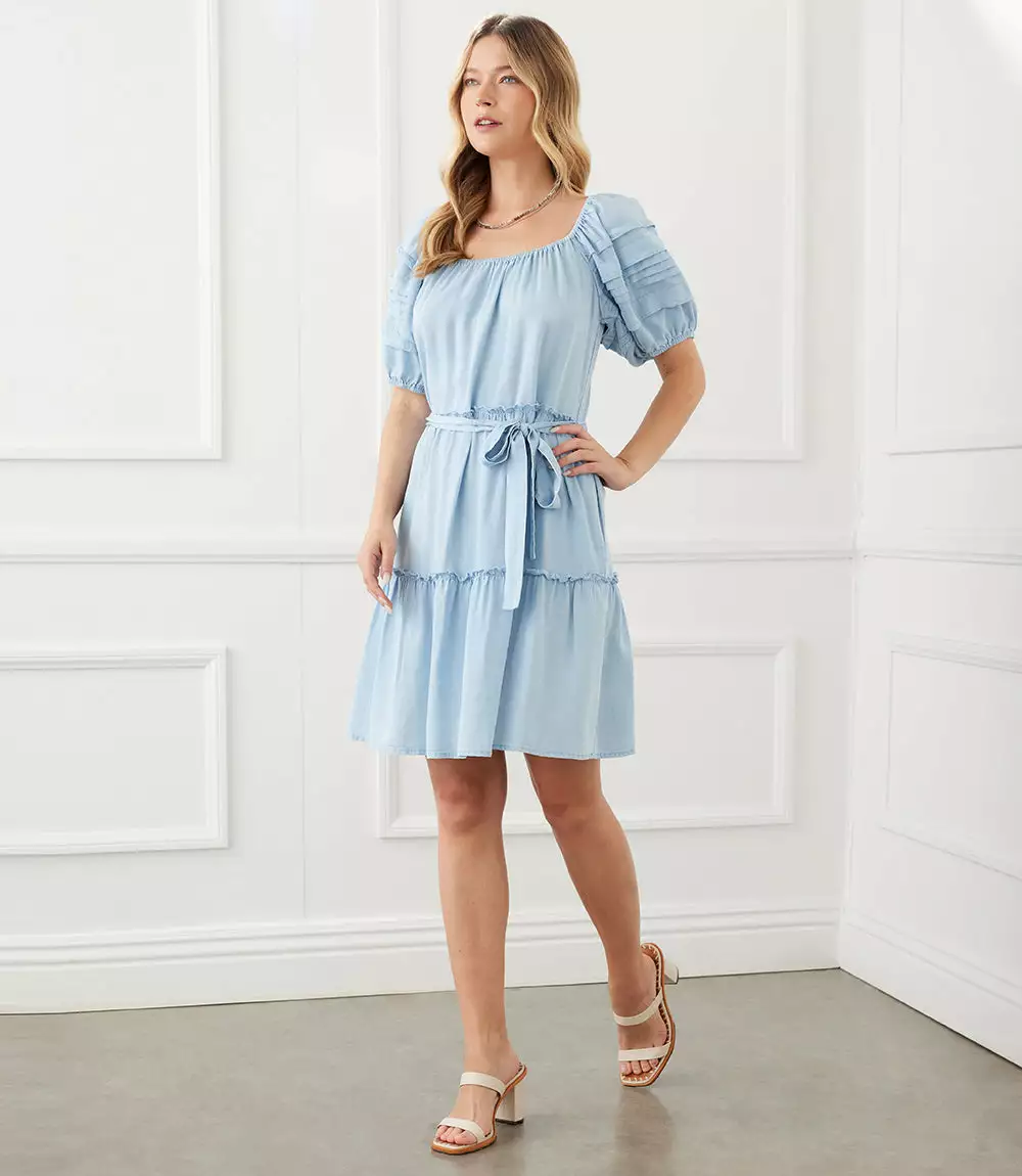 This statement-making soft chambray dress features peasant sleeves, a tiered hem and flattering cinched waist and matching belt.