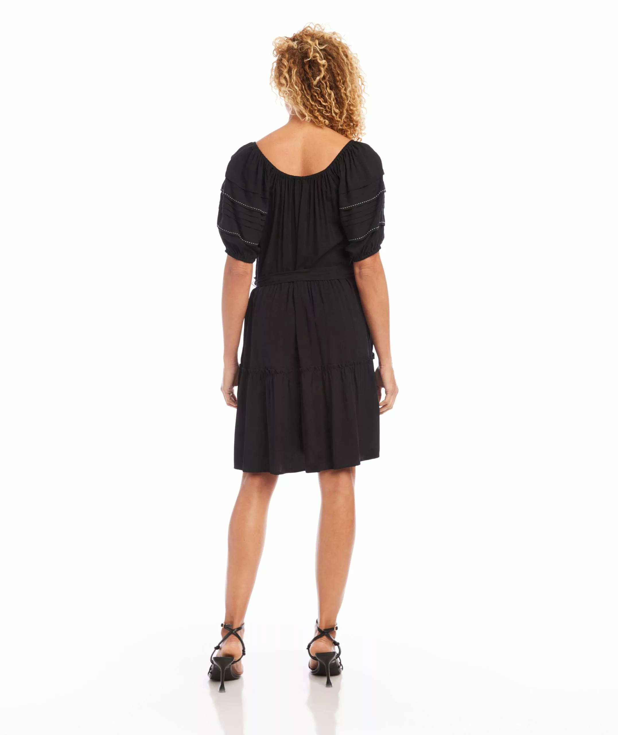 Relaxed puff sleeves frame this lightweight a-line dress designed with a waist-cinching tie and a flowy tiered skirt.