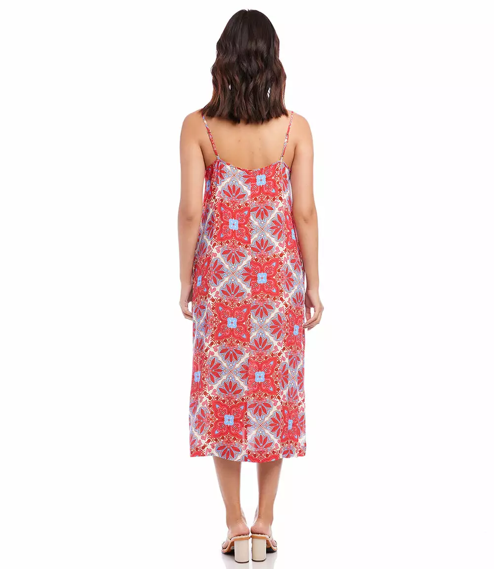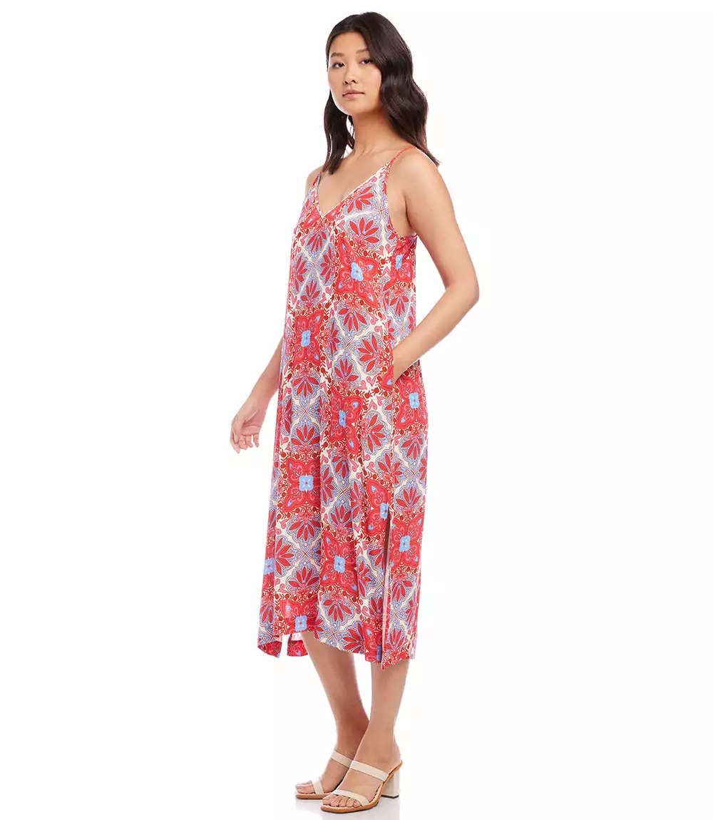 A beautiful Mediterranean-inspired medallion print defines this swingy midi dress. This breezy dress is perfect for warmer weather. It also features flirty side-slits.