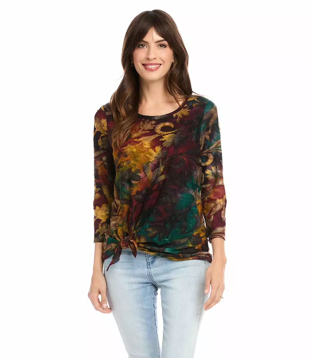 Textural beauty is found in this jacquard top covered in an alluring floral tie-dye design. It’s finished with a stylish side-tie.