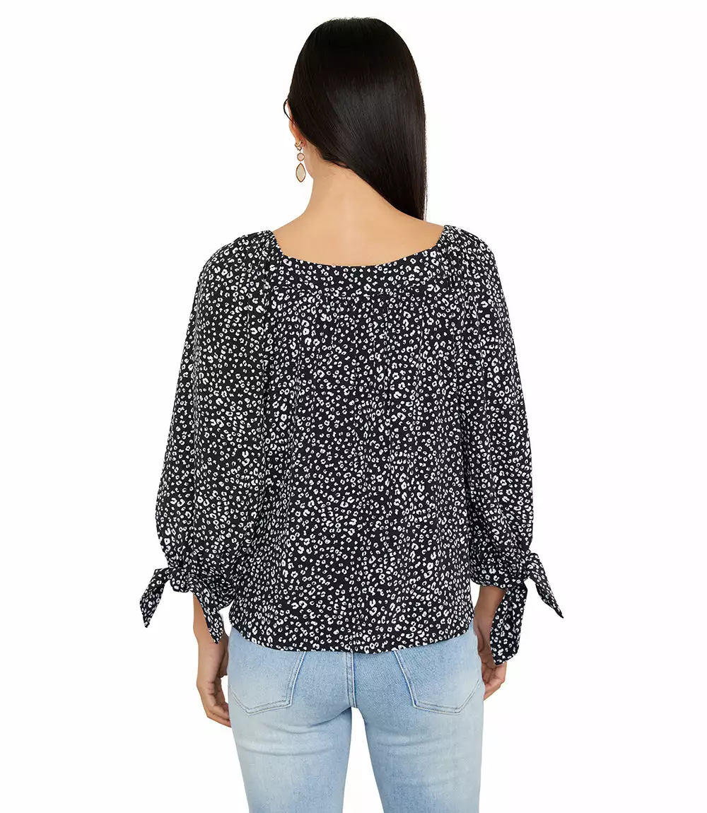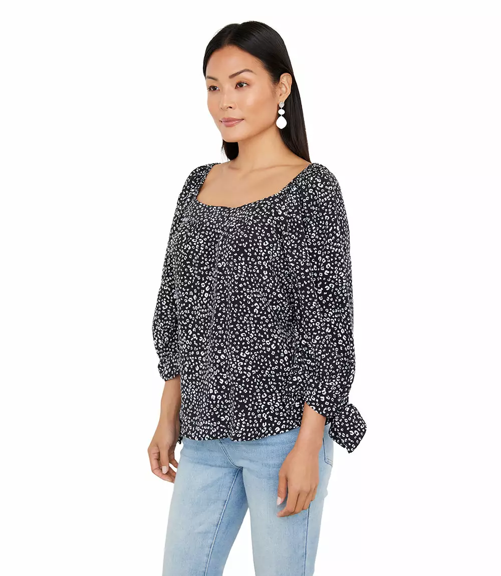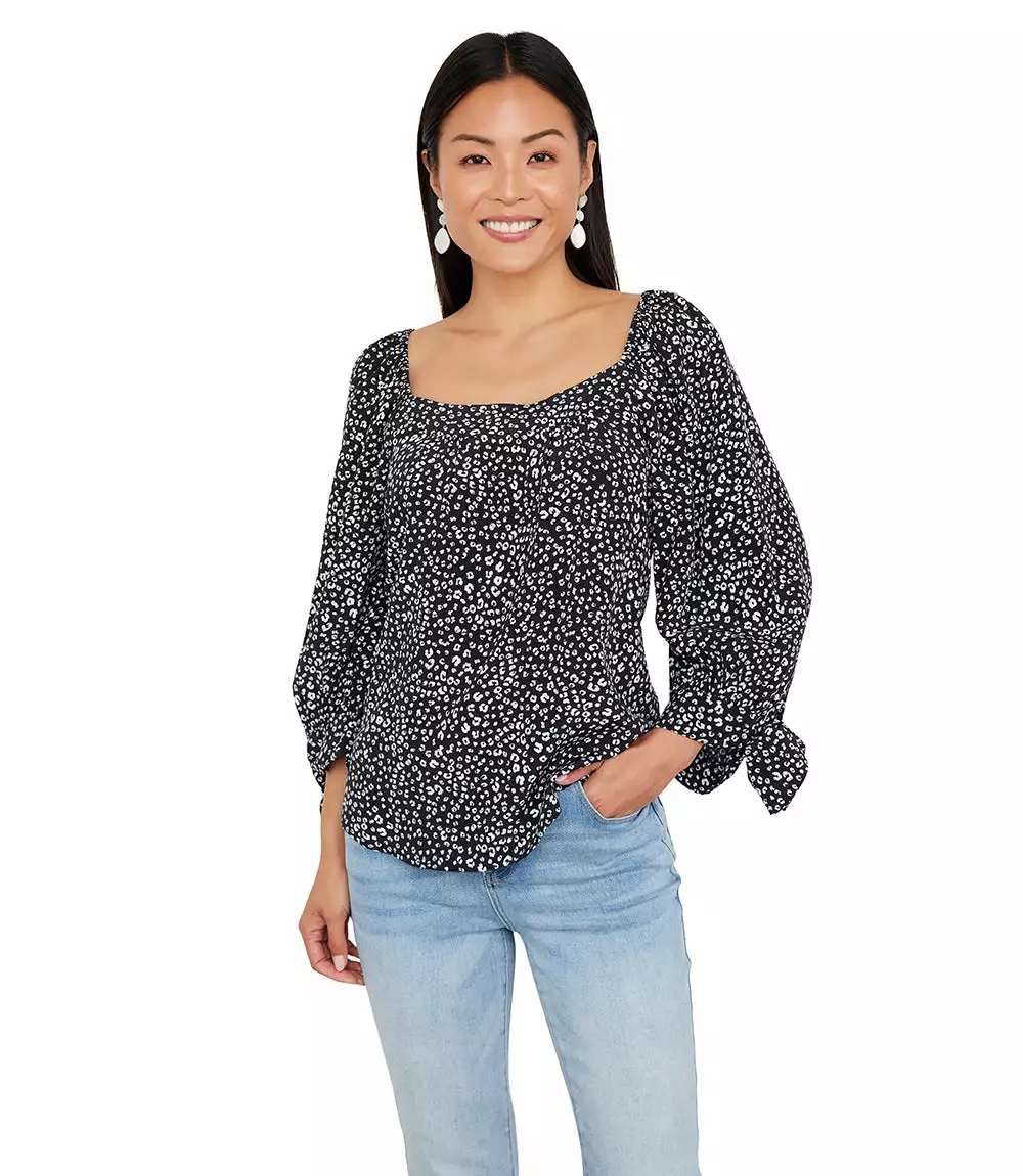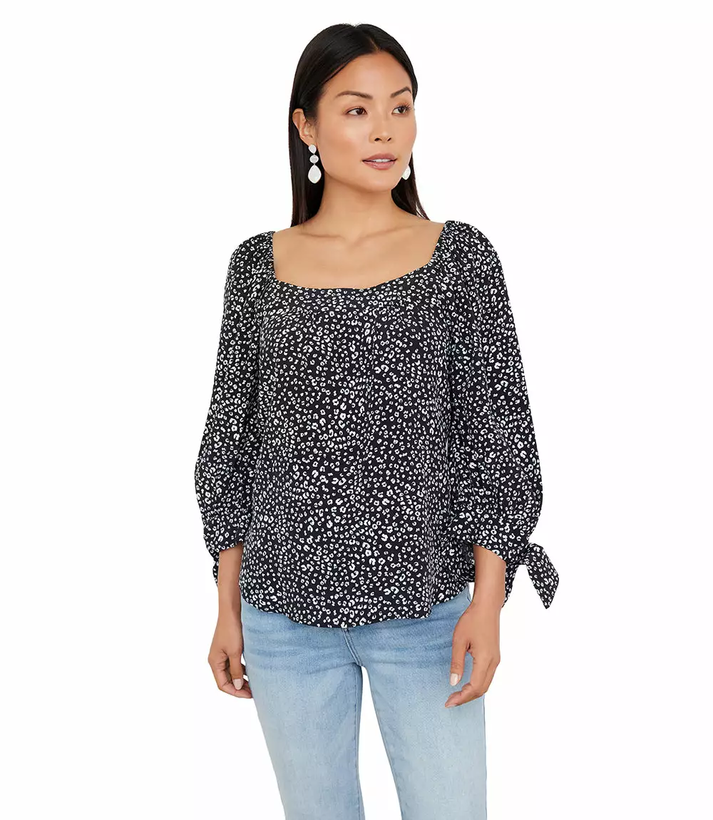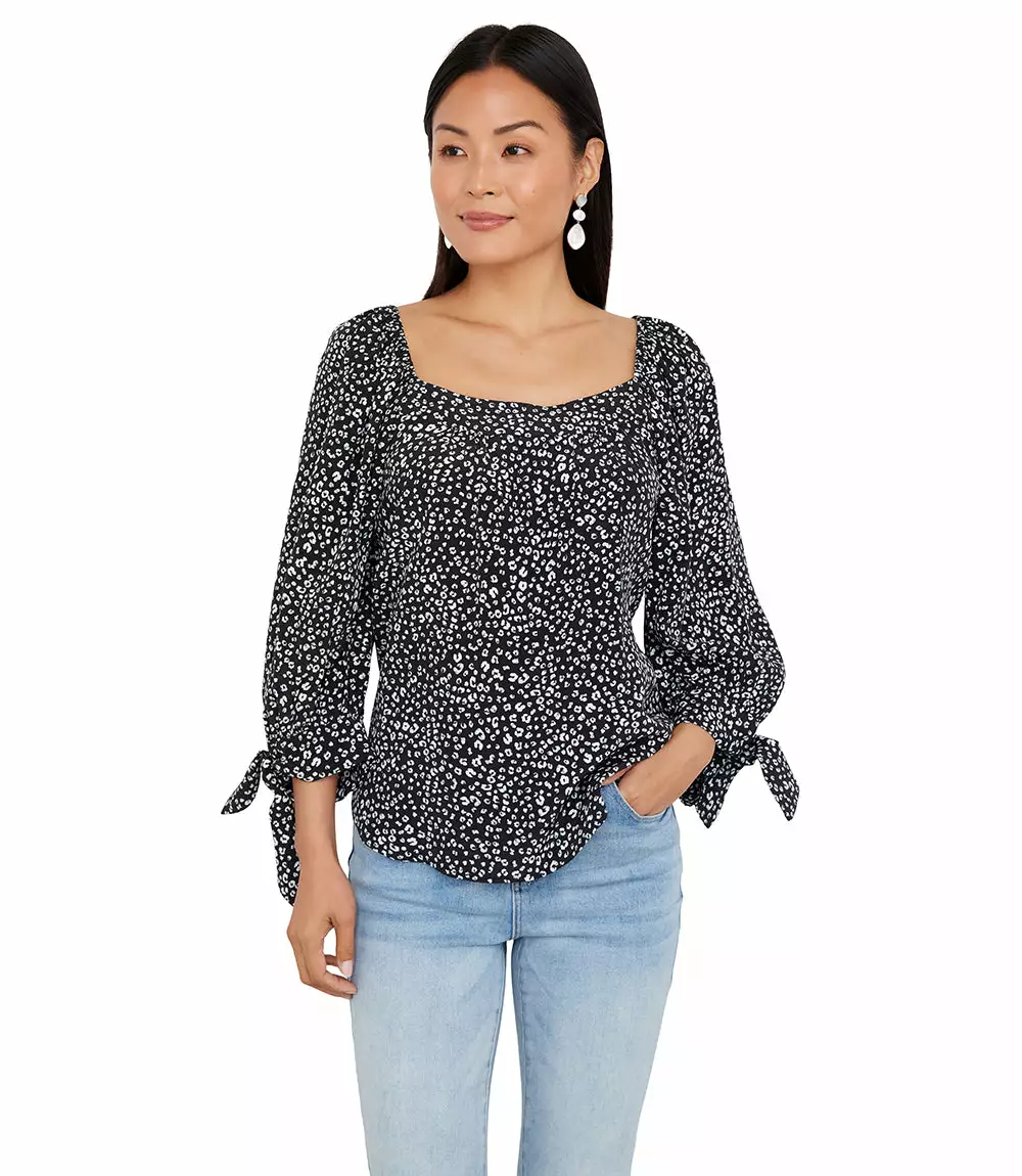 This charming top features a trend-right square neckline and billowy sleeves detailed with darling ties at the cuff. The perfect partner to all your denim, or any pair of black or white pants, this feminine style is the ultimate day-to-night piece.
