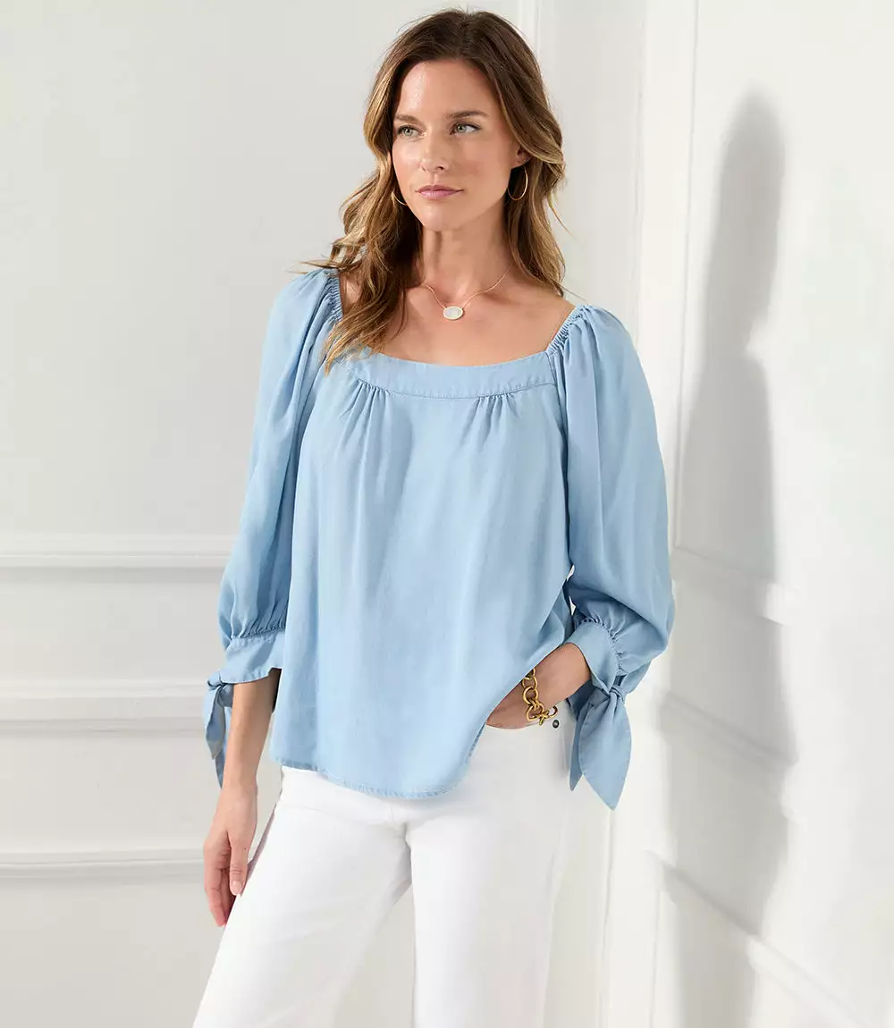 Soft chambray and darling ties delicately detail this warm weather top. It’s finished with a trend-right square neckline. This vintage-washed top has a soft touch and stretch for ease and comfort.