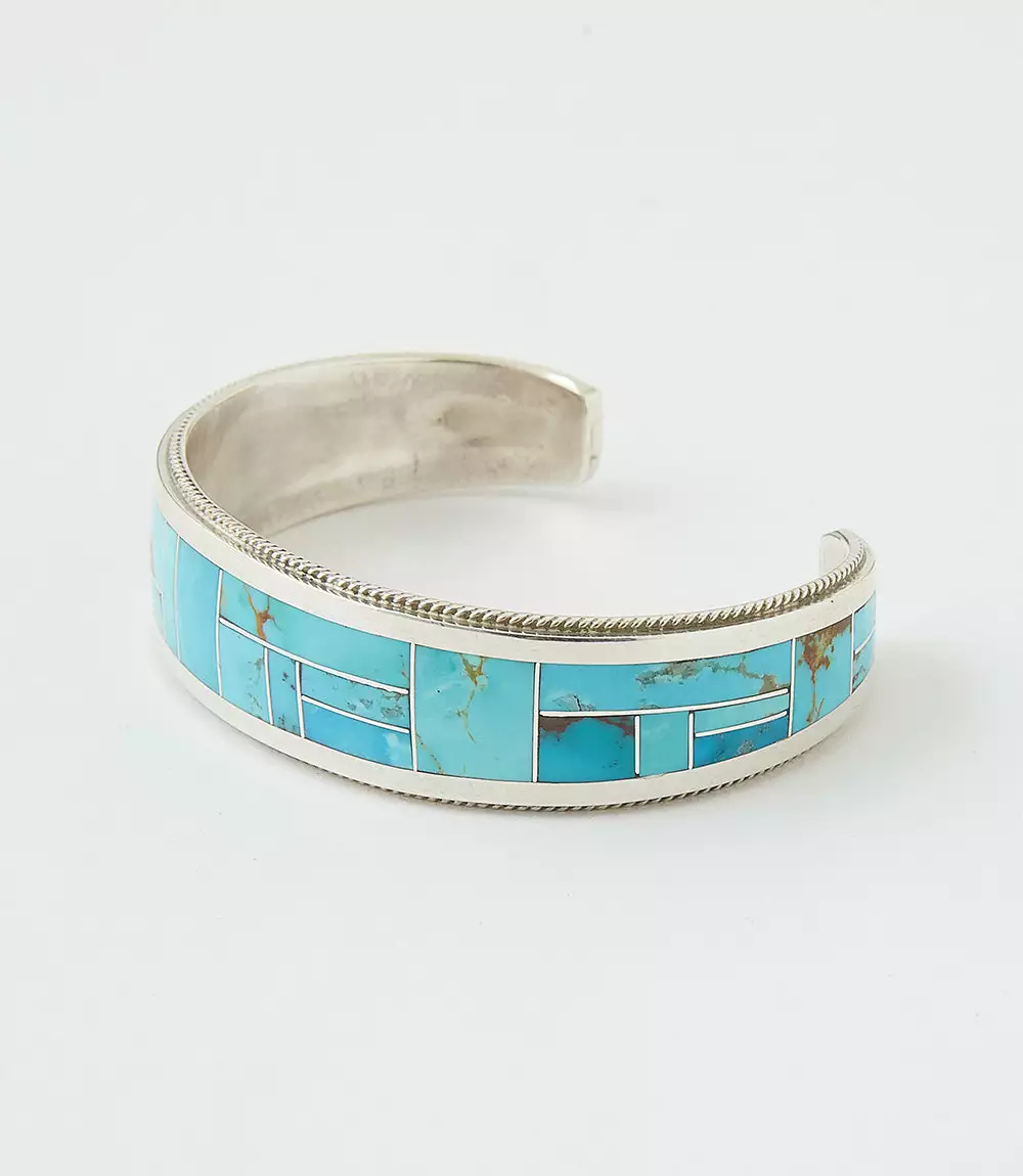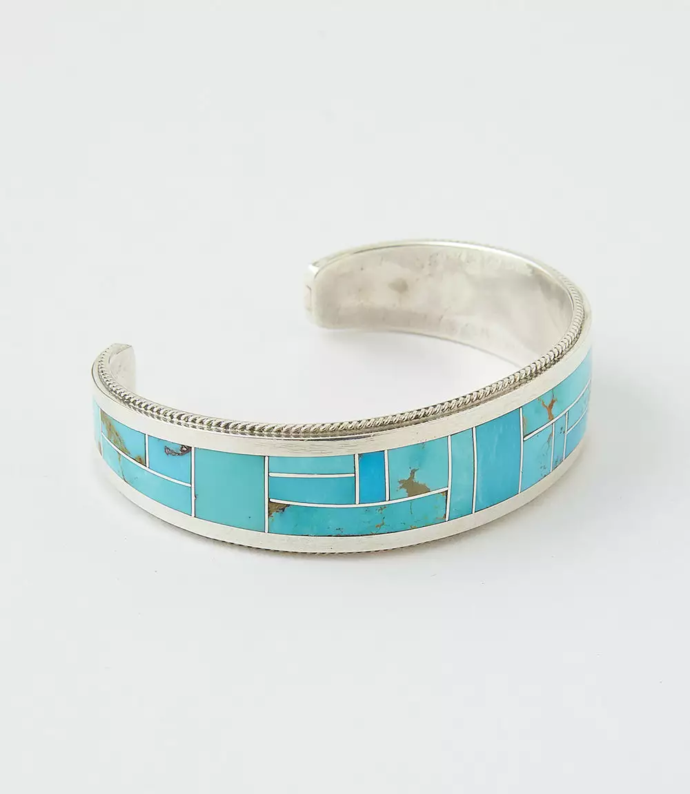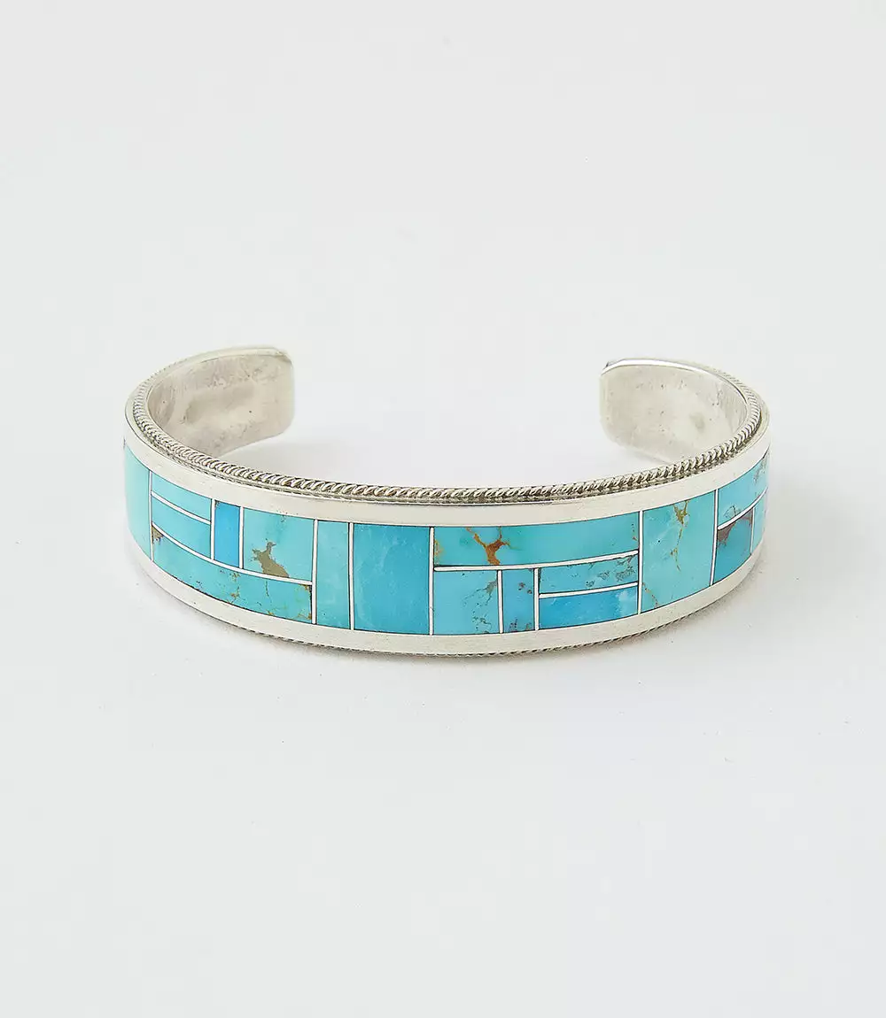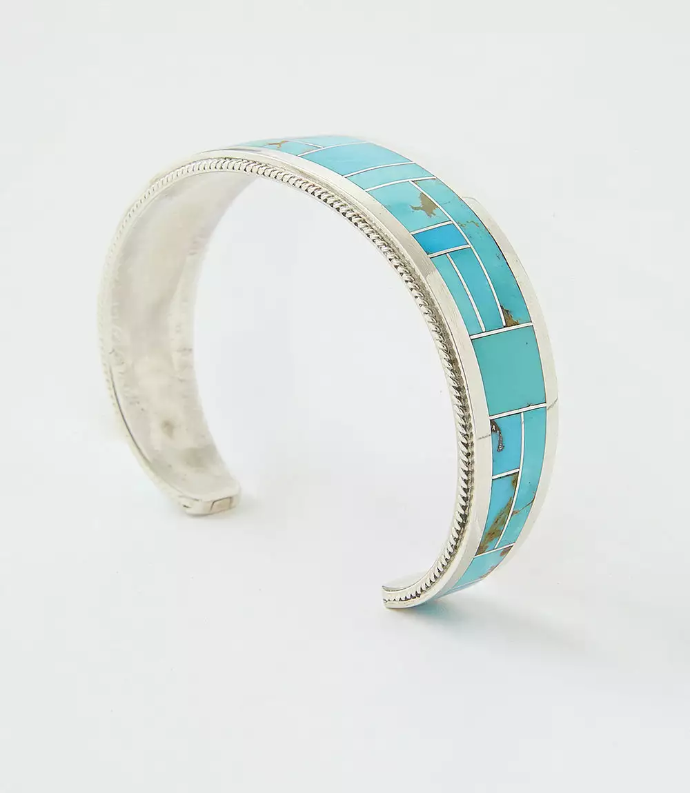 This sterling silver cuff was delicately made by a Navajo artist. It features a stunning geometric pattern crafted from turquoise inlay.
